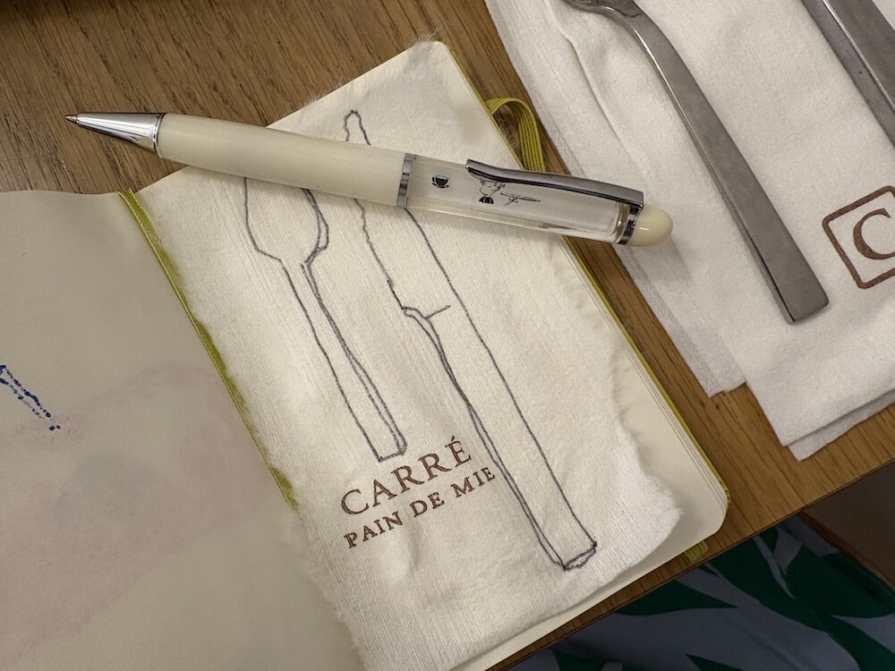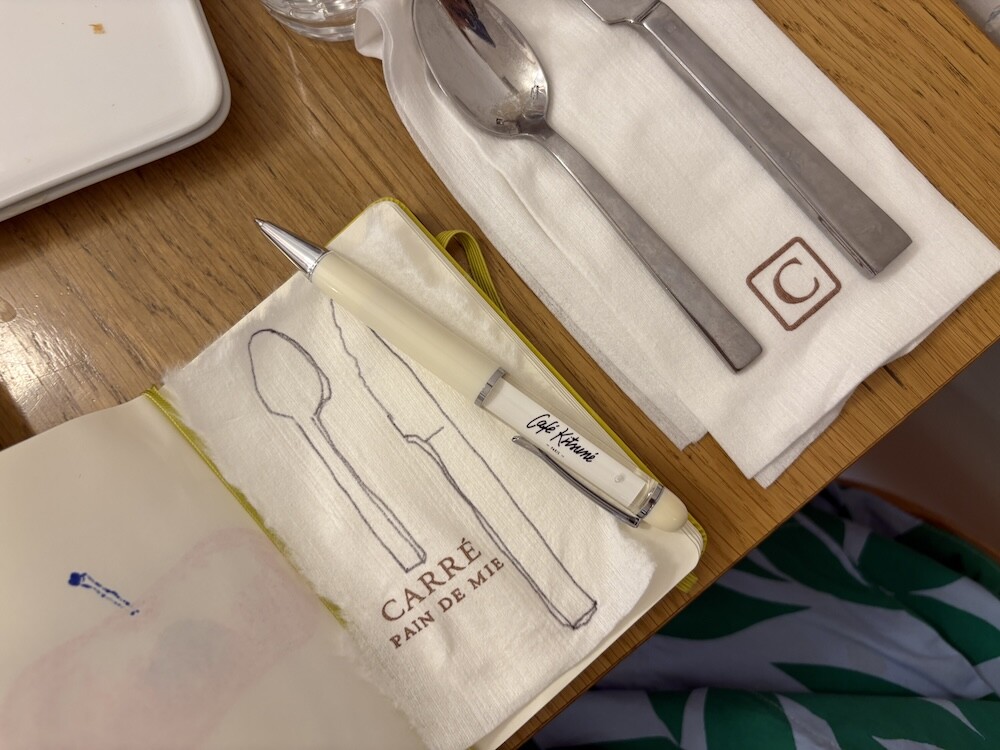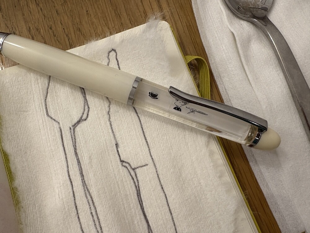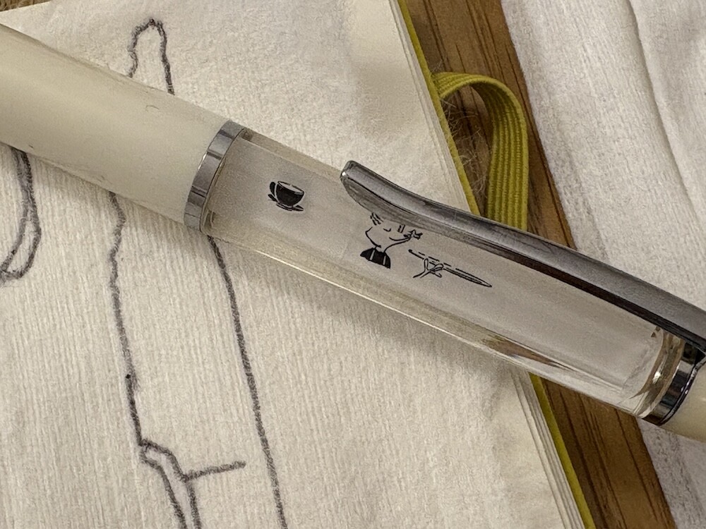 부드럽게 잘 써지는 검정색 볼펜이에요. 미색 바탕의 몸체에 윗부분은 투명한 소재로 되어 있고 그 안에 한쪽 면에는 카페 키츠네 로고가, 한쪽 면에는 여우와 커피 그림이 그려져 있어요. 재미있는 건, 이 투명한 부분의 안쪽이 액체로 채워져 있어서 커피 그림이 움직여요. 그래서 보고 있으면 시간 가는 줄을 모르겠더라고요. 펜의 머리 부분을 부드럽게 돌리면 안에서 펜촉이 나오는 형태의 제품이라 가방에 케이스 없이 넣어 다녀도 펜이 저절로 나와 지저분하게 될 일이 없어서 편했어요.