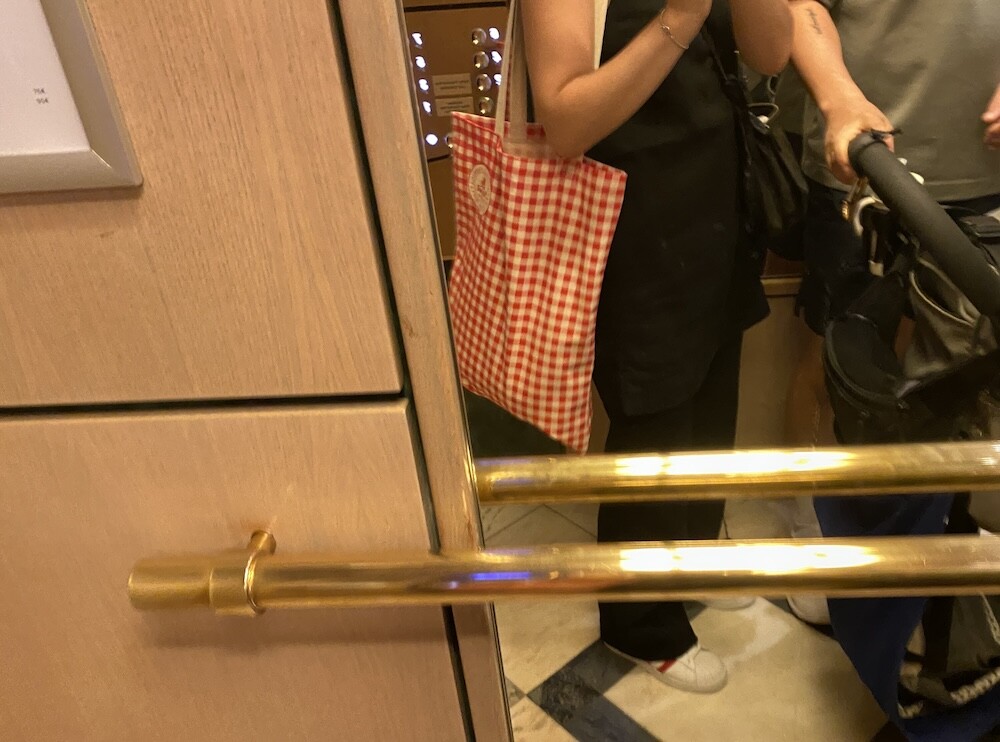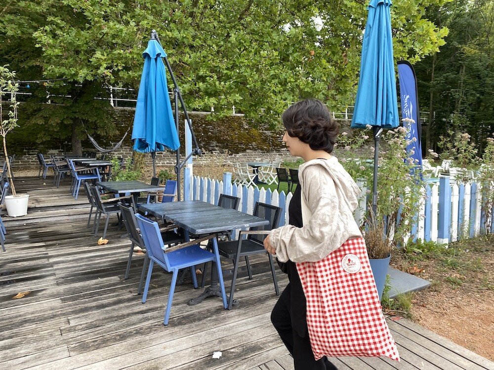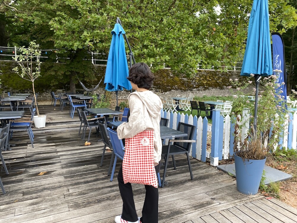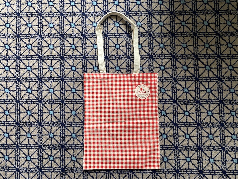 이 가방은 빨강과 파랑의 비쉬 패턴으로 만들어졌어요. 내구성이 좋은 비쉬 원단답게 소재가 튼튼해서 물건을 많이 넣고 다니시는 분들께 좋을 거예요. 그냥 비쉬 패턴만 있었으면 조금 심심했을 수도 있는데 위쪽에 메종 무아네의 로고를 넣어서 더 예쁜 에코백이 되었네요.