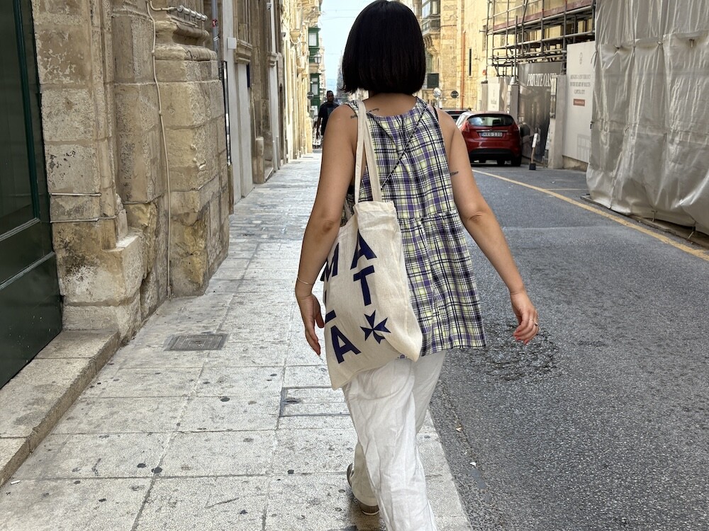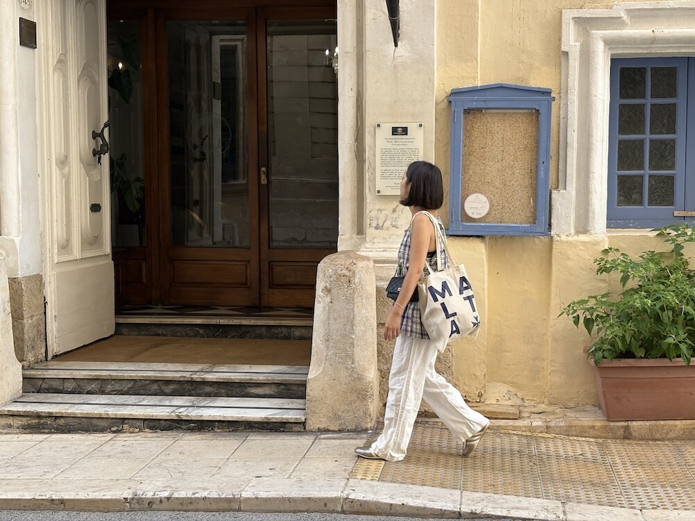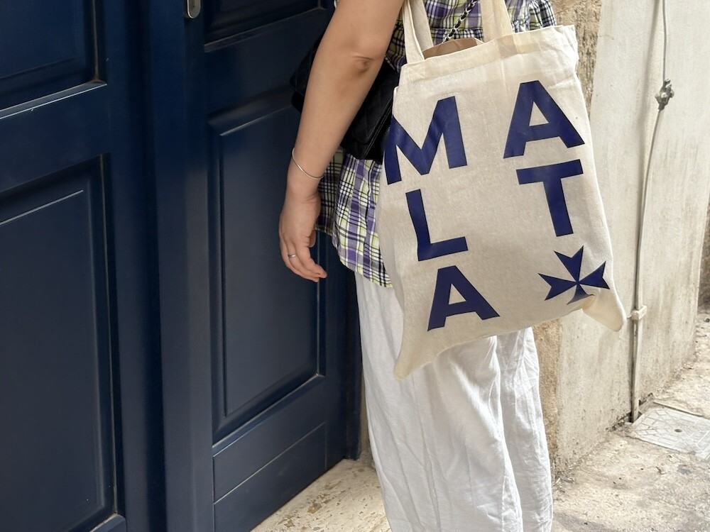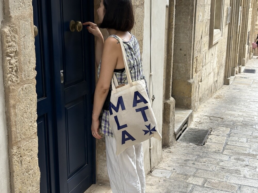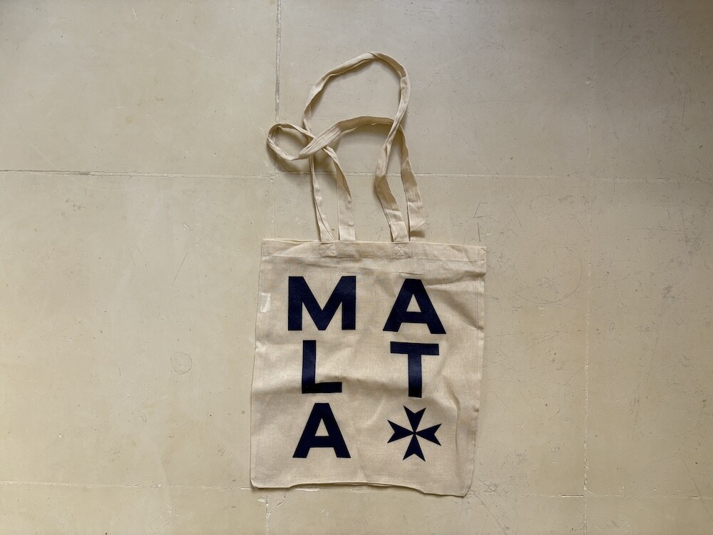 파란색의 깔끔한 글씨와 몰타를 상징하는 무늬가 프린트된 에코백입니다. 글씨가 반듯하고 심플해서인지 단순한 배열인데도 눈길을 확 끄는 게 참 예쁘더라고요. 어떤 옷에나 잘 어울릴 것 같은 가방입니다.