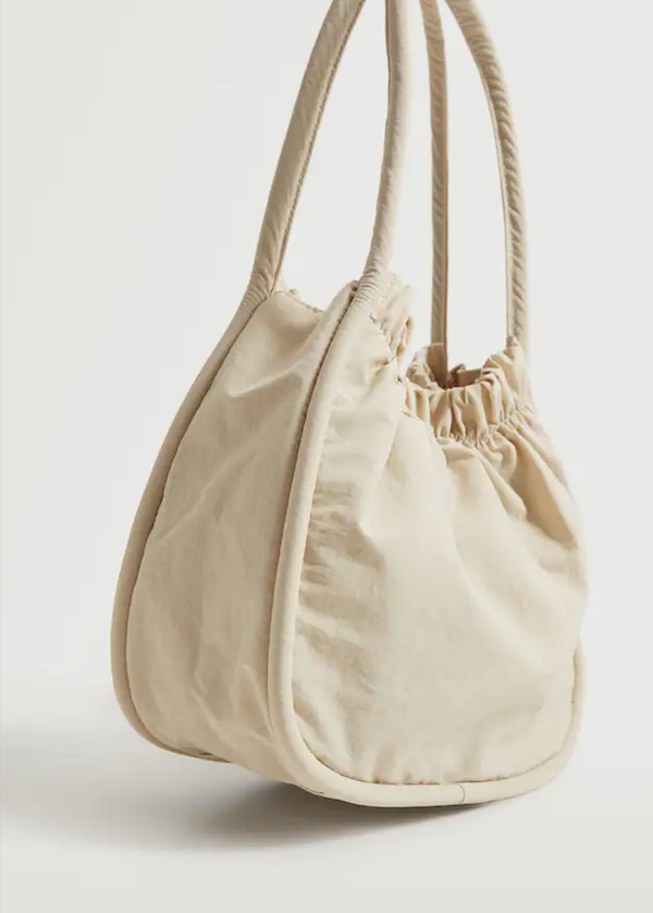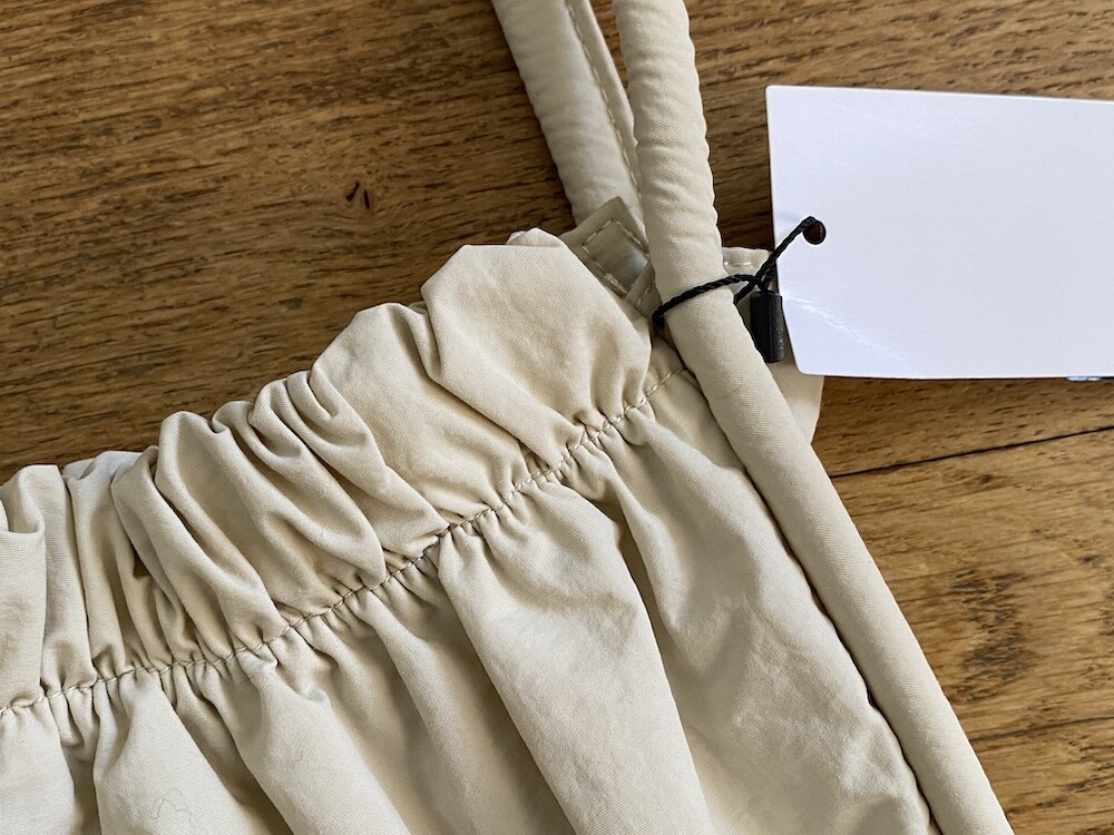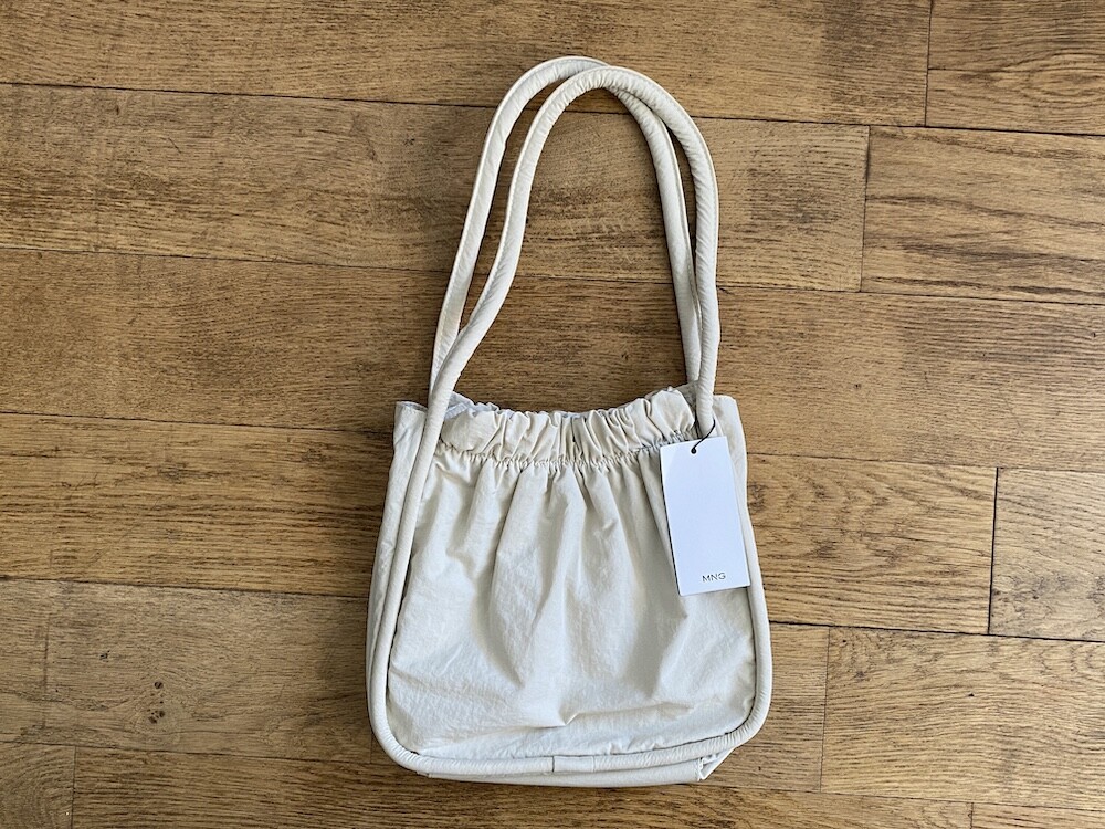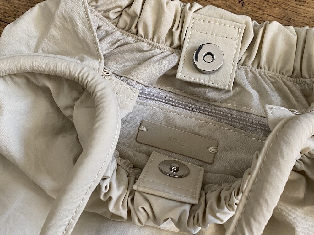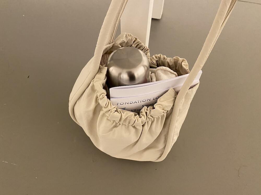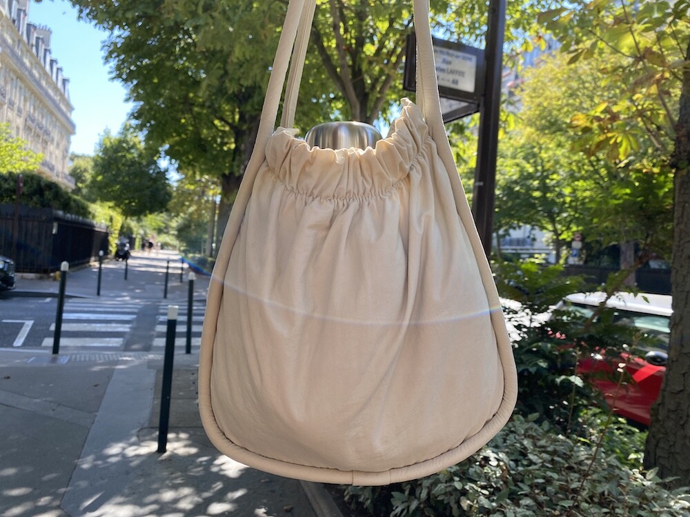 베이지빛 크림색의 버킷백이에요. 주머니처럼 생긴 가방으로, 크기가 크지 않지만 두께감이 있어서 물건들이 알차게 들어가요. 여밈 부분에 자석이 있어서 가방이 열릴 걱정이 없고, 안쪽에는 지퍼 달린 주머니가 있어서 카드 같은 작은 물건을 따로 넣을 수도 있어 좋아요. 특히 끈 부분이 납작한 게 아니라, 두께감 있는 동그란 모양이라 가방 모양 자체가 지루하지 않고, 색깔이 담백해서 어떤 옷에나 잘 어울려요.