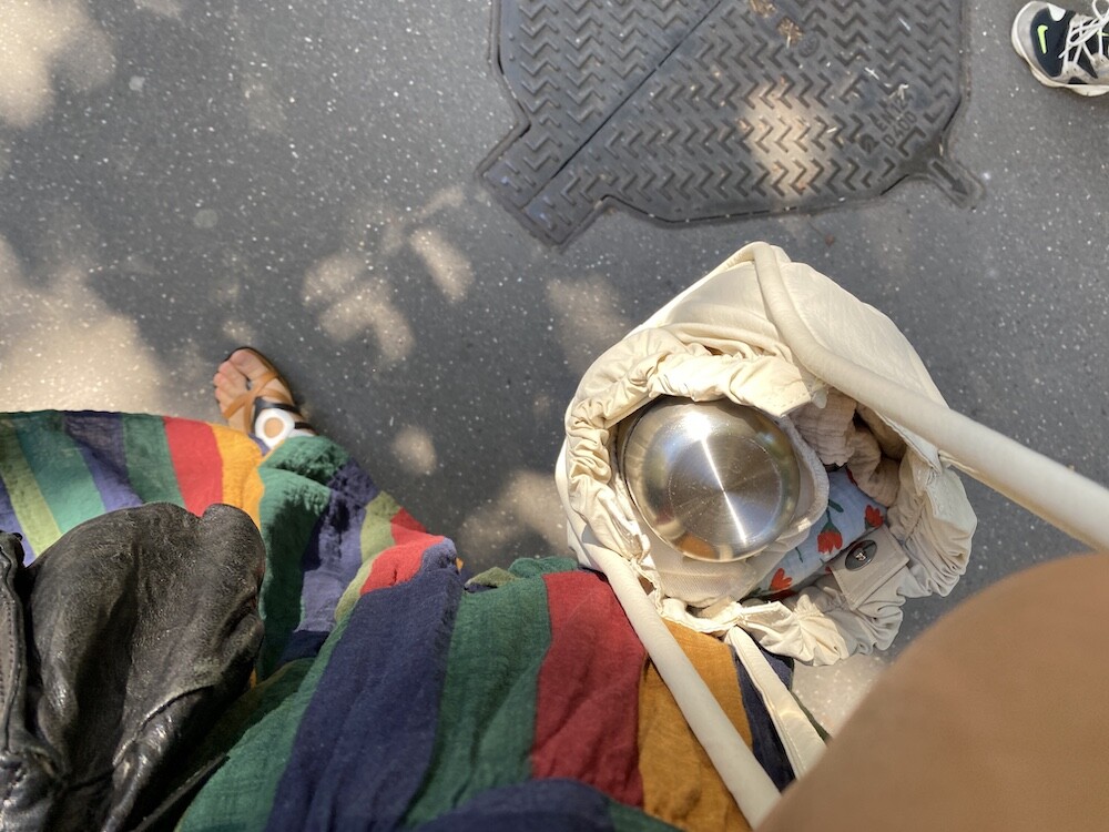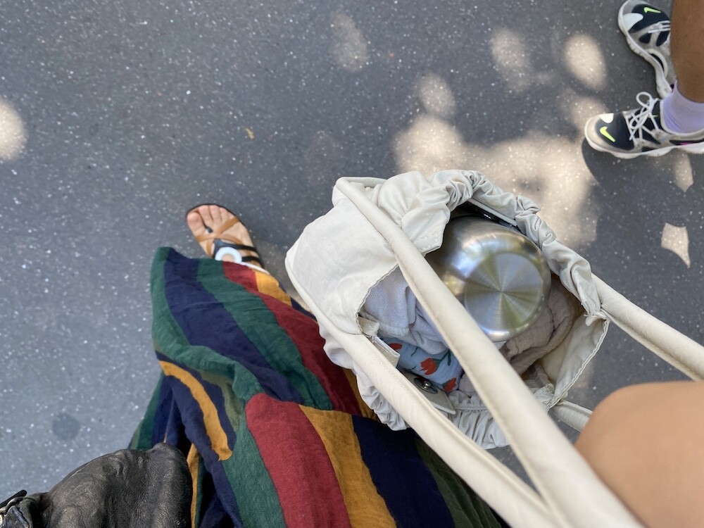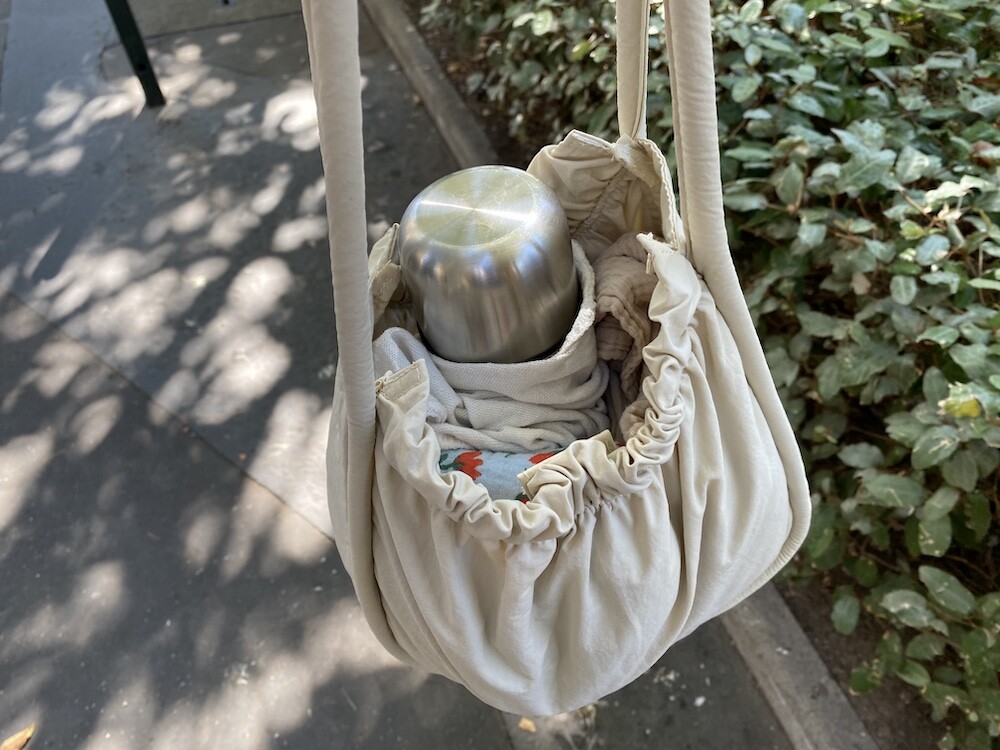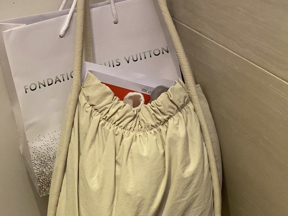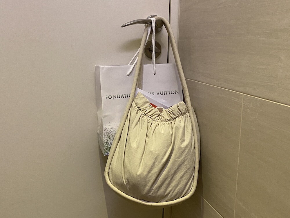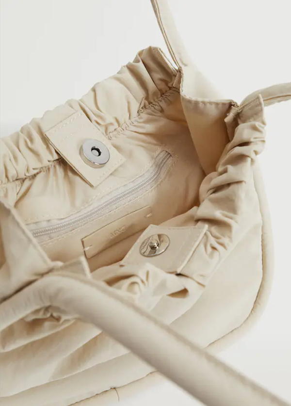 베이지빛 크림색의 버킷백이에요. 주머니처럼 생긴 가방으로, 크기가 크지 않지만 두께감이 있어서 물건들이 알차게 들어가요. 여밈 부분에 자석이 있어서 가방이 열릴 걱정이 없고, 안쪽에는 지퍼 달린 주머니가 있어서 카드 같은 작은 물건을 따로 넣을 수도 있어 좋아요. 특히 끈 부분이 납작한 게 아니라, 두께감 있는 동그란 모양이라 가방 모양 자체가 지루하지 않고, 색깔이 담백해서 어떤 옷에나 잘 어울려요.