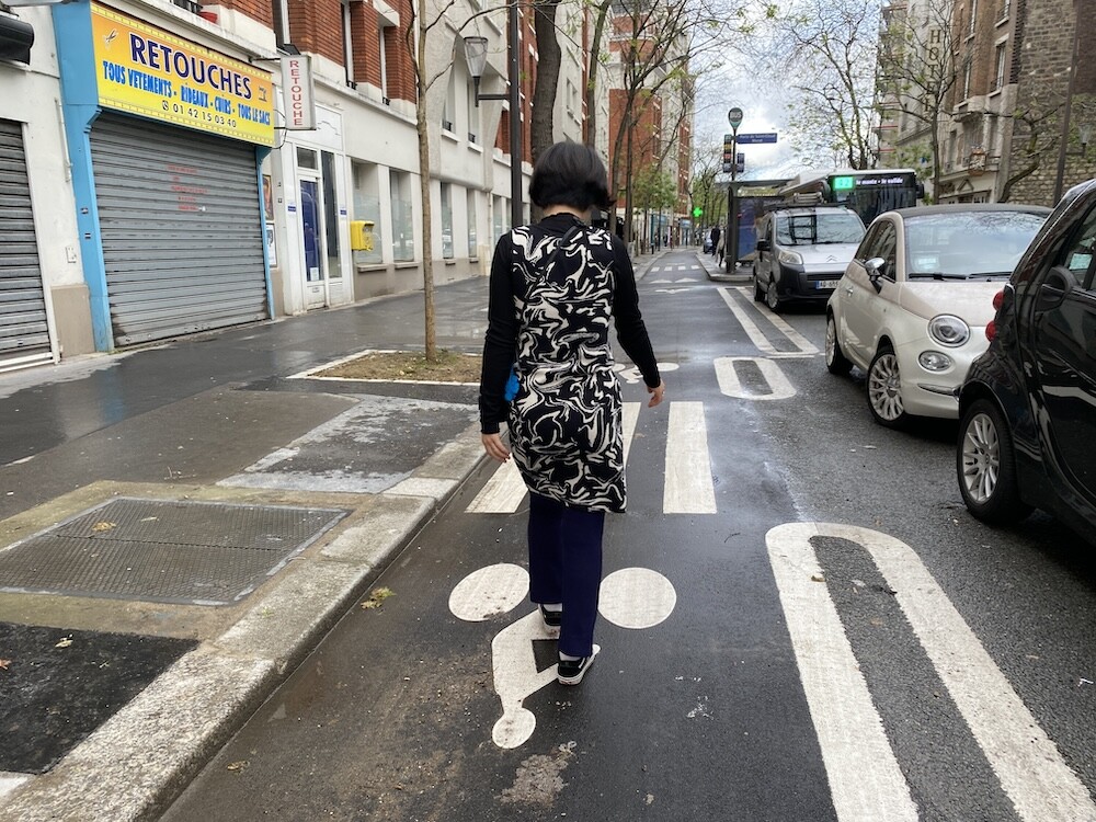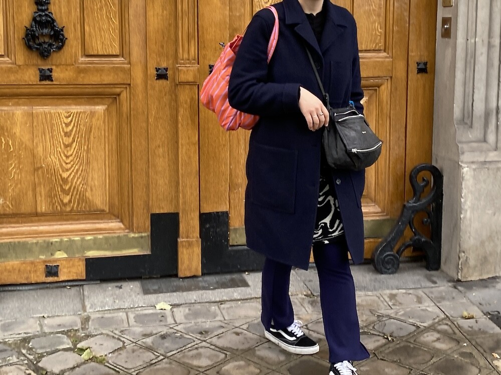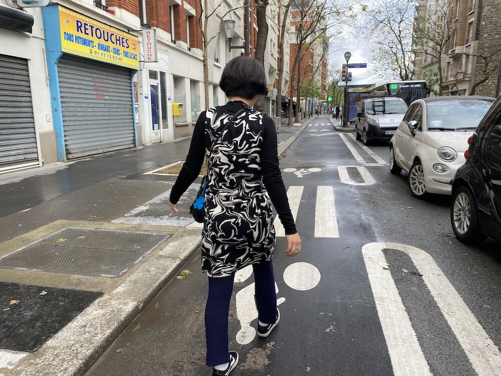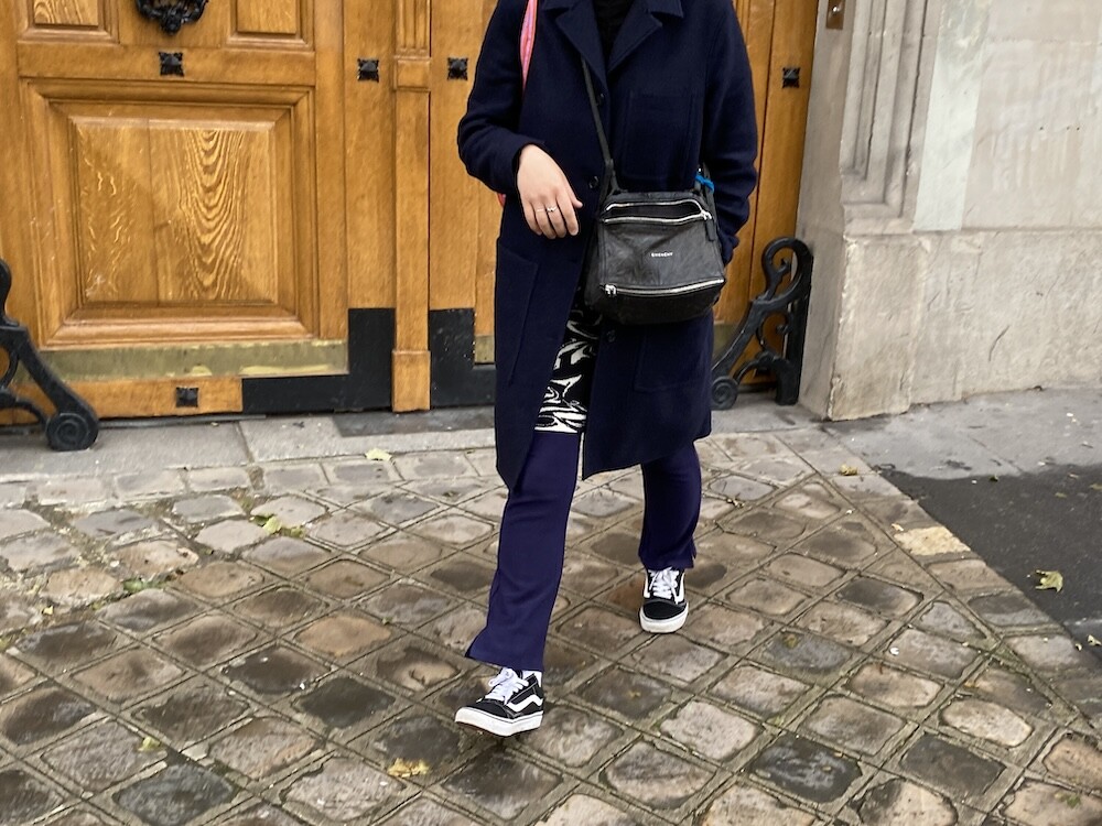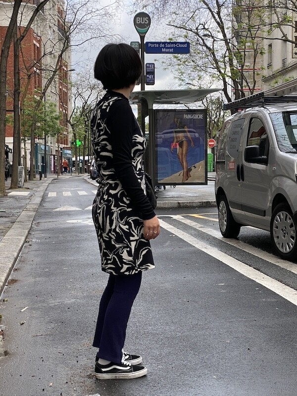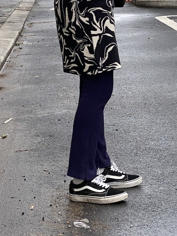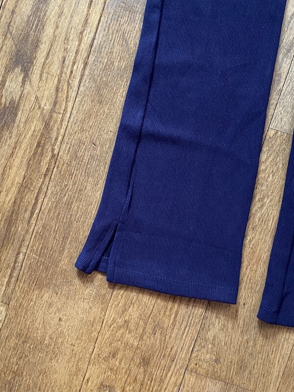 밑으로 내려갈수록 살짝 퍼지는 벨 라인의 팬츠가 다리가 굵어 보이지 않고 밑단 쪽에는 트임이 있어서 예뻐요. 얼른 맨발에 플랫슈즈를 신고 코디해 보고 싶은 바지입니다. 소재가 쫀쫀하고요. 특히 좋았던 건, 보통 이런 바지는 입고 다니다 보면 무릎이 튀어나와서 후줄근해 보이게 마련인데 이건 그런 느낌이 거의 없어요. 제가 이틀째 입으며 전시도 보고, 의자와 바닥에 앉아 아기와 놀기도 하고 낮잠도 자고 해 보았는데 무릎이 정말 많이 안 튀어나오네요. 아무래도 활동량이 많은 어린이들을 위한 제품이다 보니 소재에 신경을 많이 쓴 걸까요?