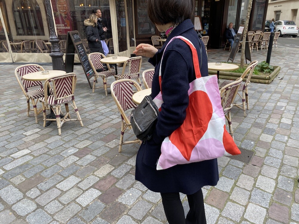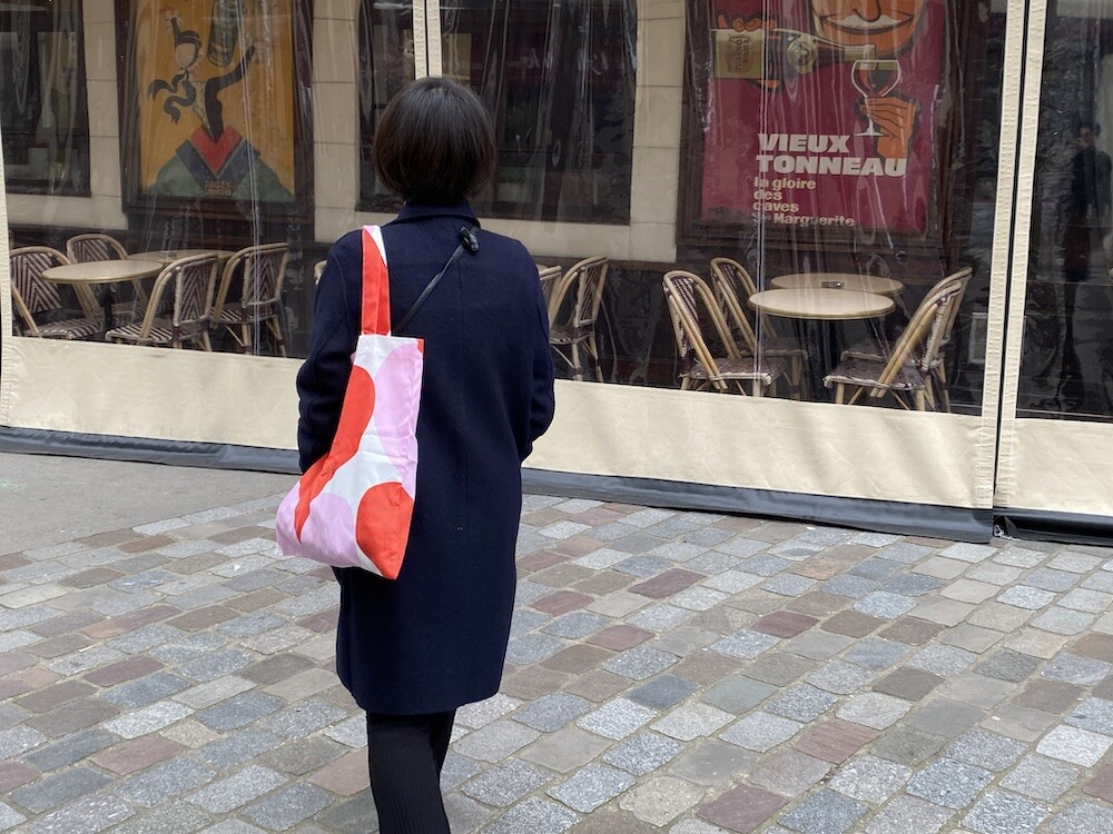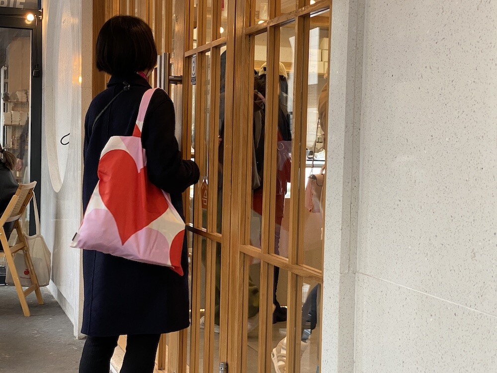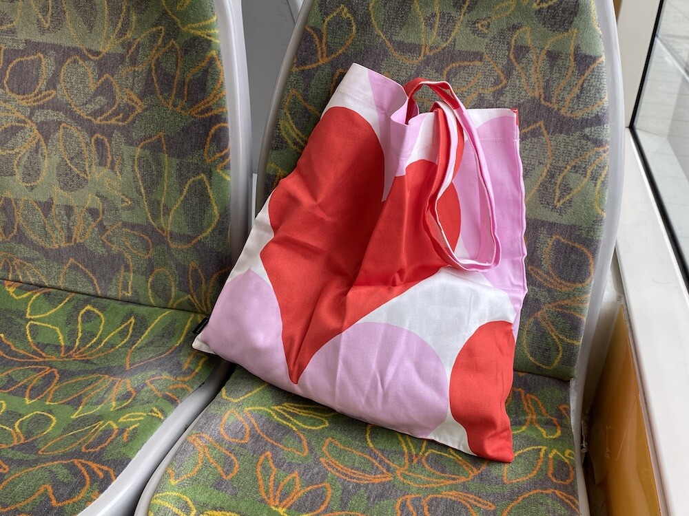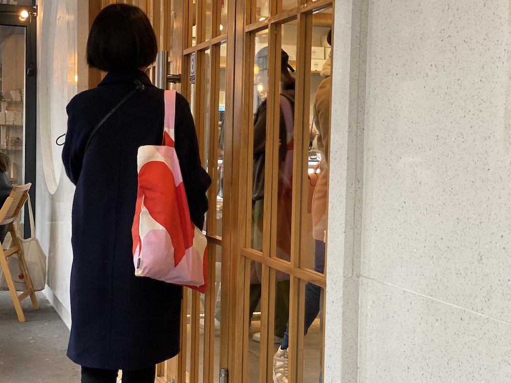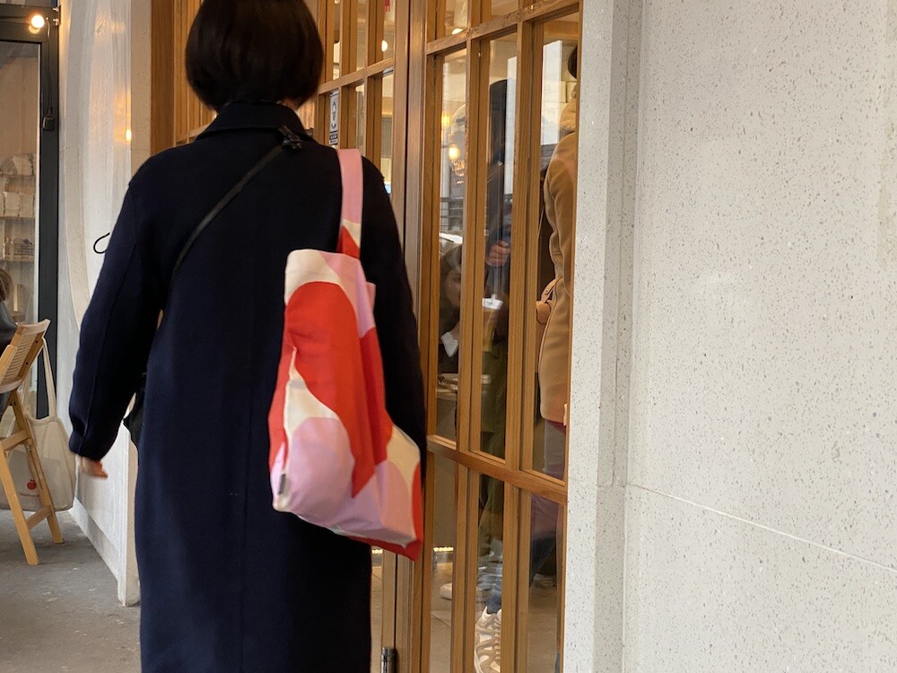 빨강색과 분홍색의 하트가 가득한 에코백이에요. 큼지막한 하트가 잔뜩 그려진 가방으로, 메는 것만으로도 기분이 좋아지는 것 같은 느낌이에요. 특히 마리메꼬 제품들은 바느질 퀄리티가 너무 좋아요. 이렇게 잘 만든 에코백은 오래오래 쓸 수 있어서 참 좋더라고요.