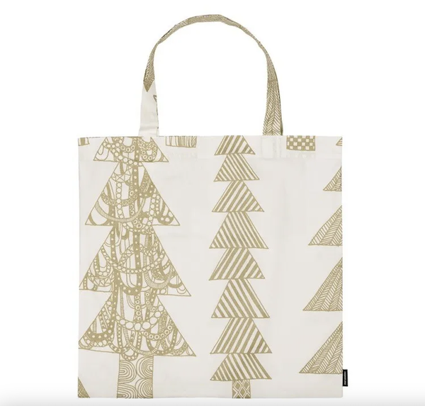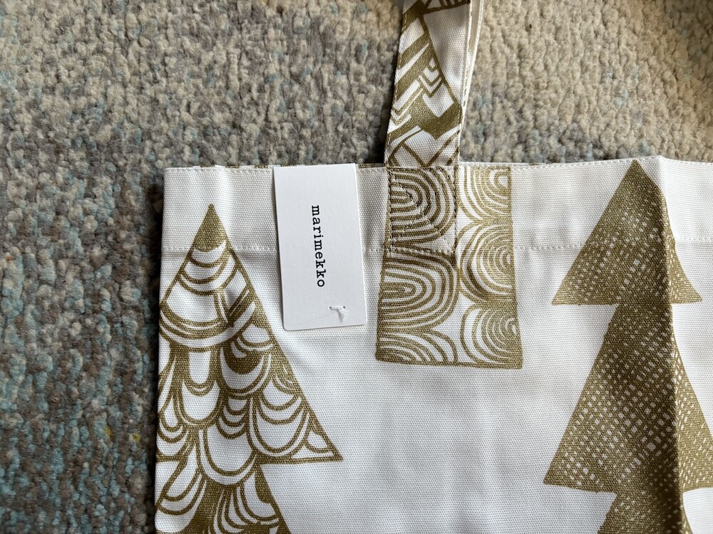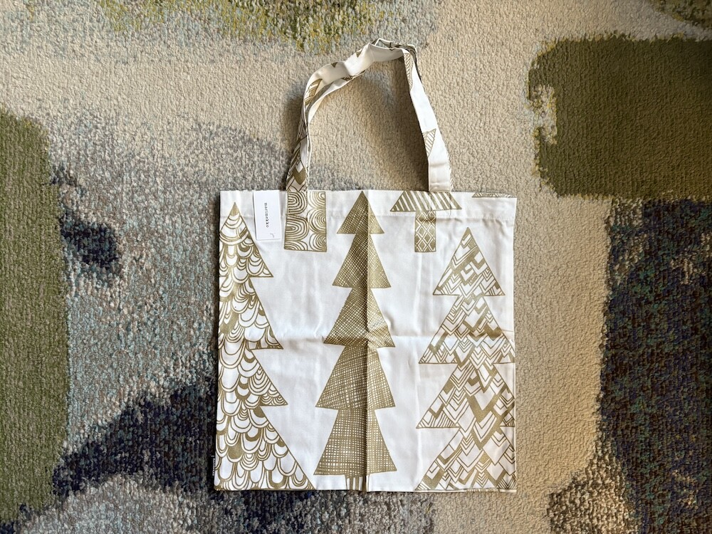 금색의 다양한 트리 모양 프린트가 예쁜 에코백이에요. 크리스마스를 앞둔 연말에 들어도 예쁘지만 평소에 들어도 기분이 좋아지는 가방이랍니다. 이 가방을 메면 일 년을 연말처럼 즐겁게 보낼 수 있을 것 같은 기분이 드네요. 특히 마리메꼬 제품들은 바느질 퀄리티가 너무 좋아요. 이렇게 잘 만든 에코백은 오래오래 쓸 수 있어서 참 좋더라고요.