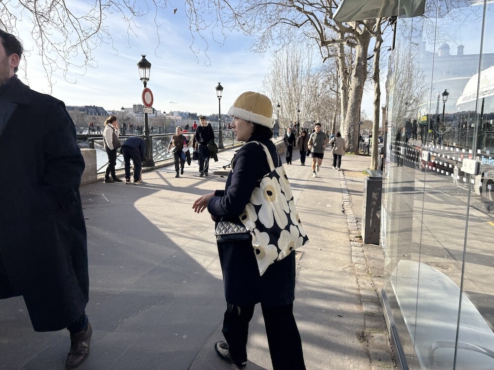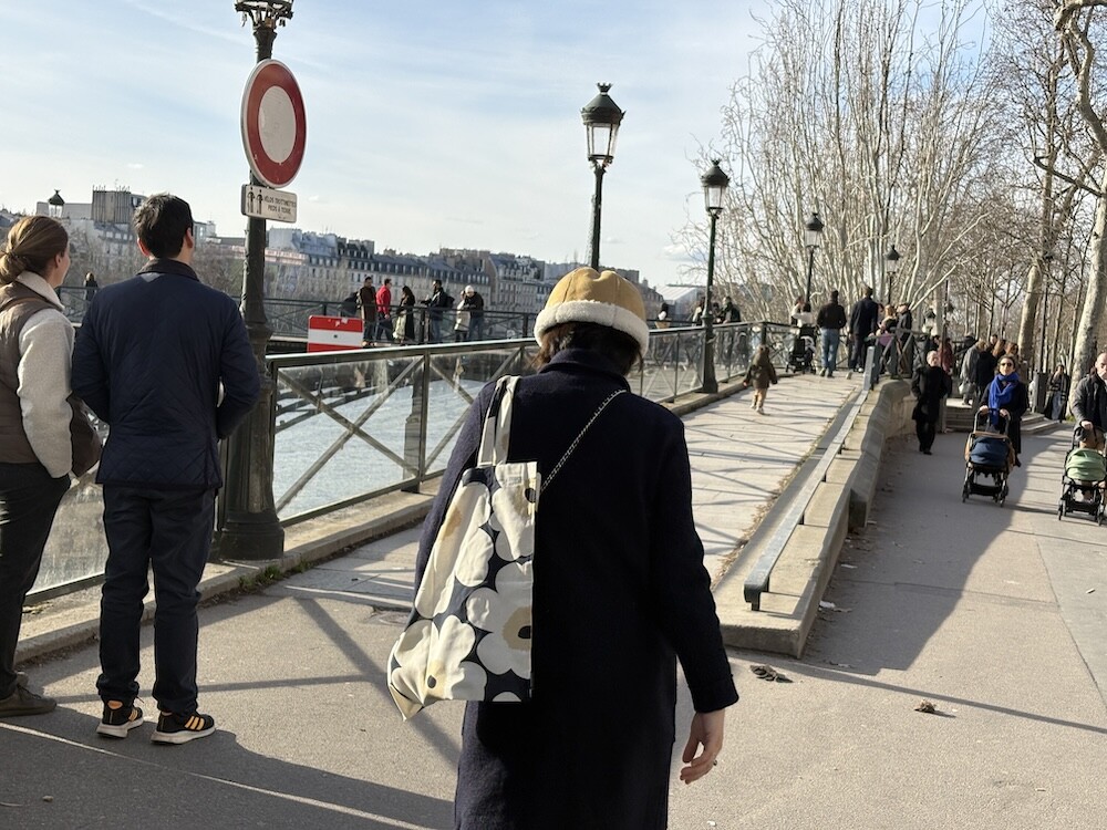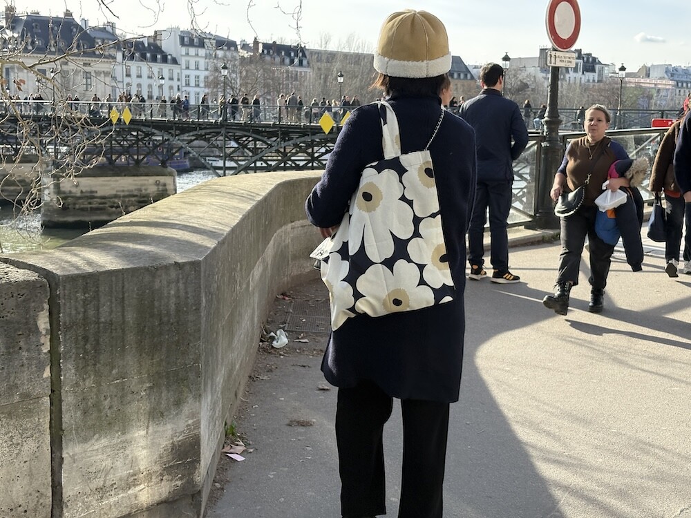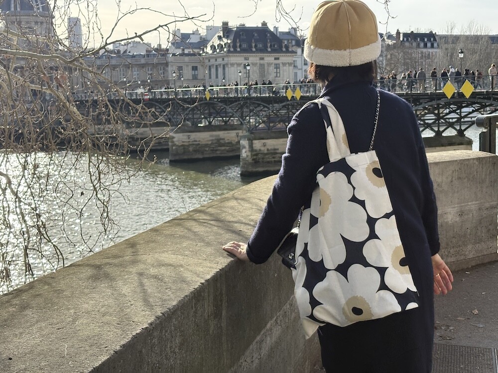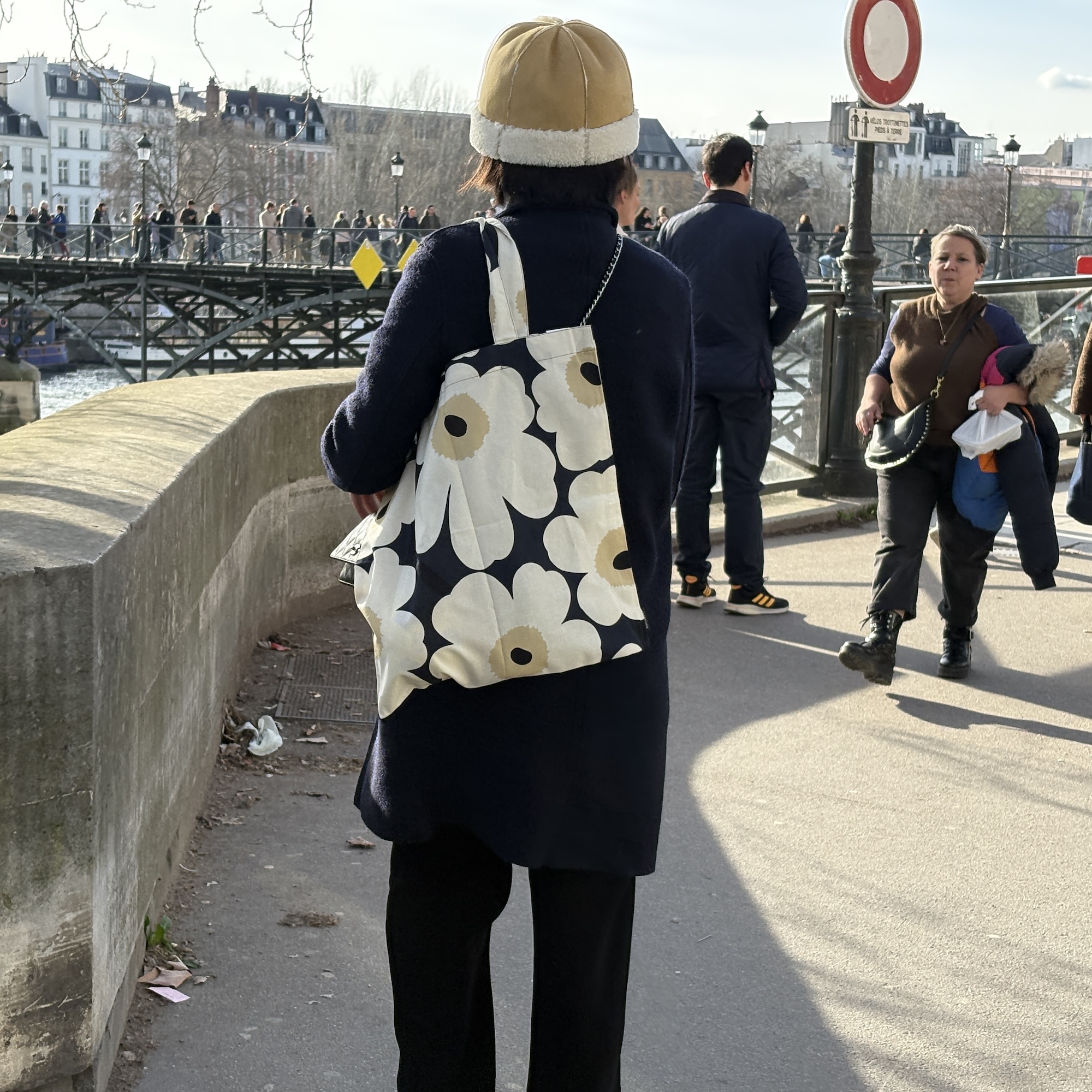 마리메꼬의 대표 패턴인 우니꼬가 프린트된 에코백이에요. 마리메꼬 하면 첫 번째로 떠오르는 패턴으로 만들어진 가방으로, 바탕이 진한 남색에 꽃이 크림색이라 그간 나왔던 우니꼬 에코백들보다 차분한 느낌이 있어요. 특히 마리메꼬 제품들은 바느질 퀄리티가 너무 좋아요. 이렇게 잘 만든 에코백은 오래오래 쓸 수 있어서 참 좋더라고요.
