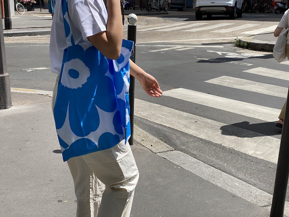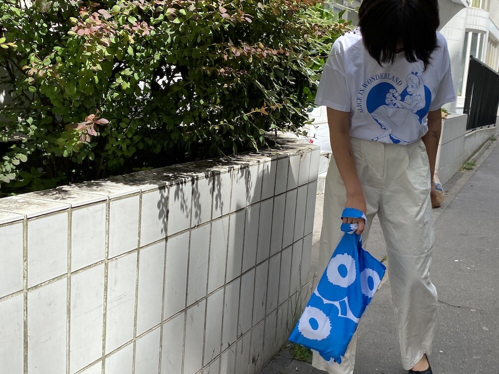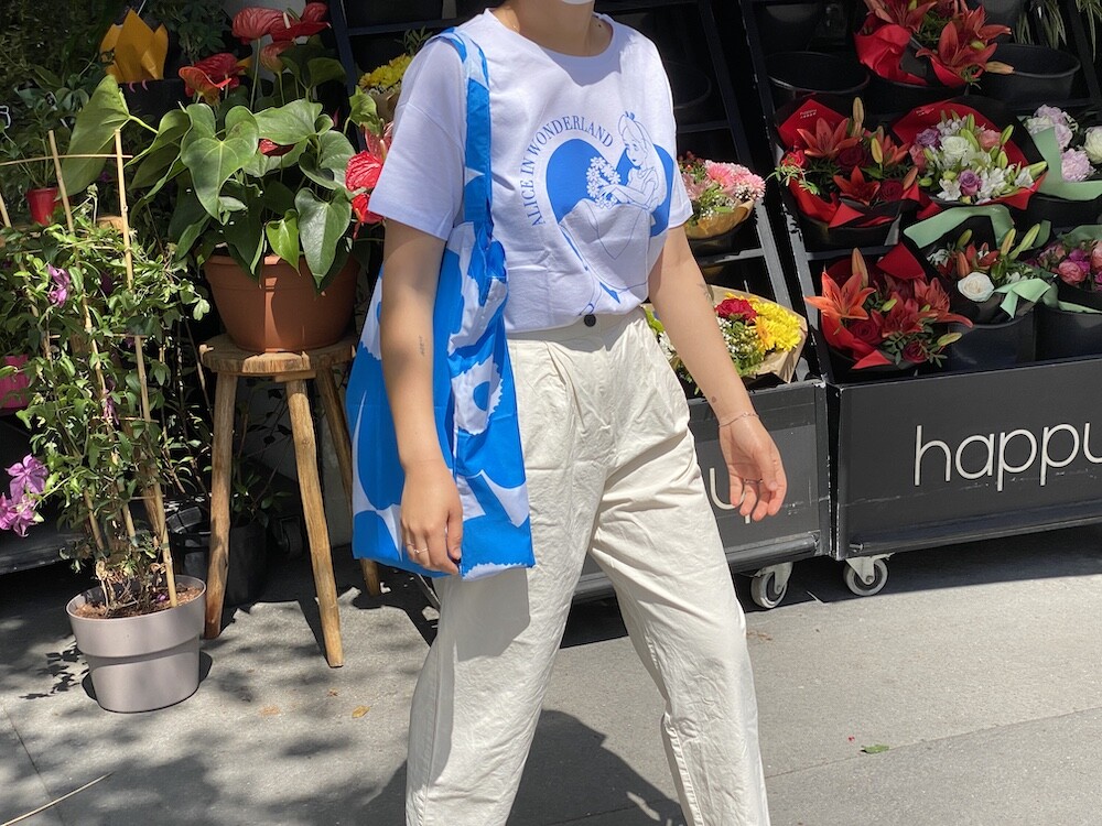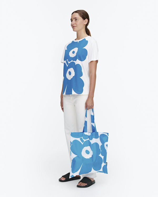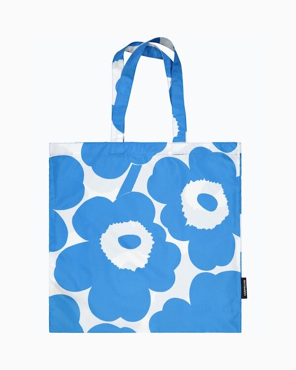 마리메꼬의 대표 패턴인 우니꼬가 큼지막하게 들어간 이 에코백은 마리메꼬 70주년 기념 키오스키 KIOSKI 컬렉션에서 나온 가방이에요. 파랑색으로만 프린트 된 우니꼬 패턴이 시원해 보이는 데다가 박음질이 튼튼해서 내구성도 좋아요. 100% 재활용 폴리에스테르를 사용했기 때문에 환경을 생각한 착한 가방이기까지 해요.
