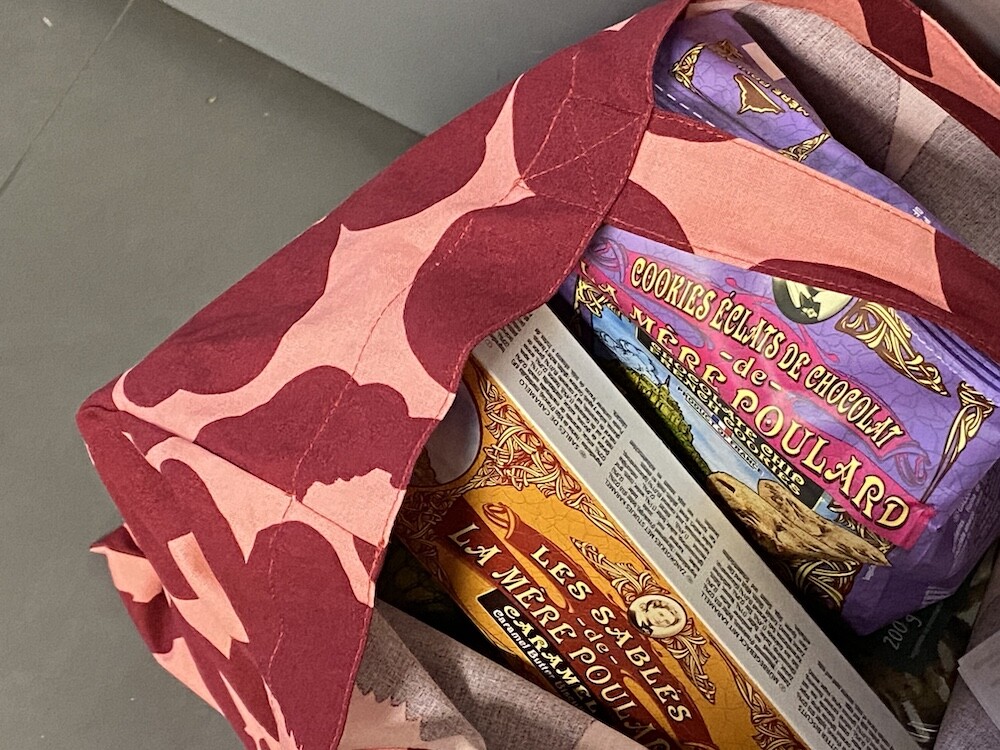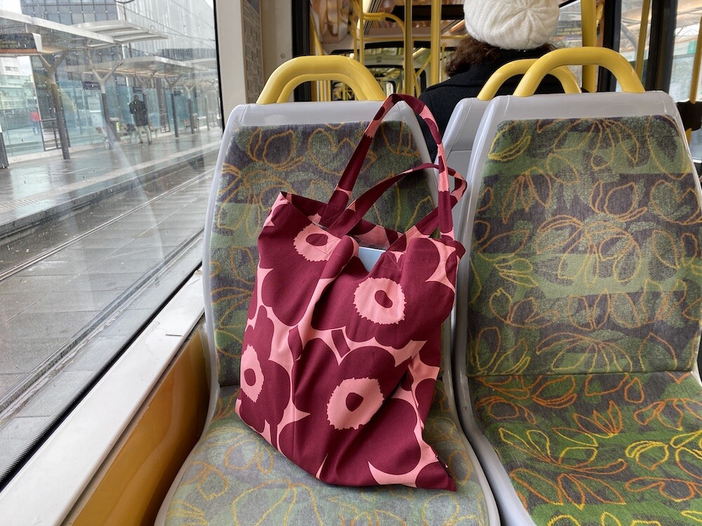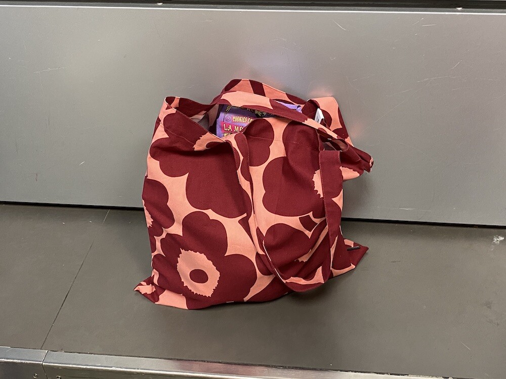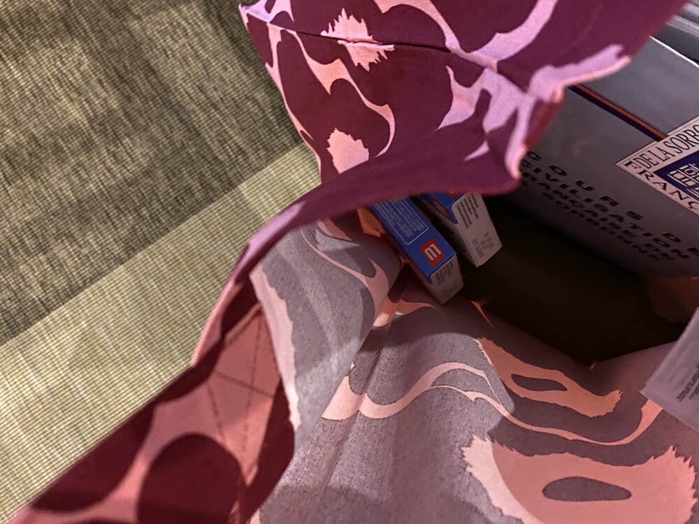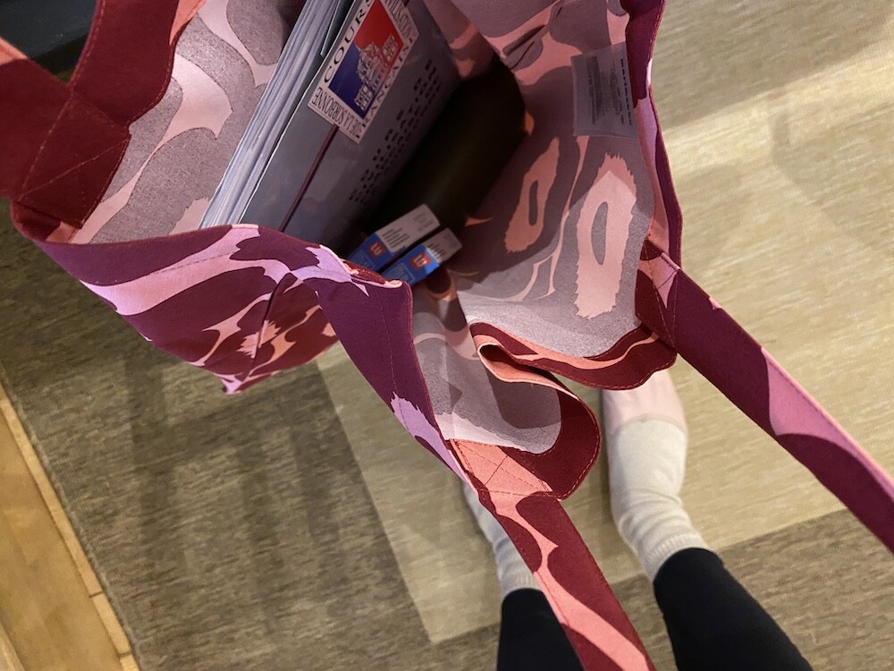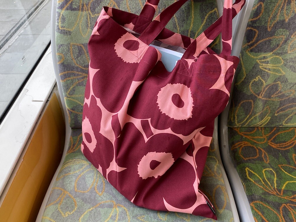 마리메꼬의 대표 패턴인 우니꼬가 큼지막하게 들어간 에코백이에요. 마리메꼬 하면 첫 번째로 떠오르는 패턴으로 만들어진 가방으로, 주황이 살짝 섞인 살구빛 분홍과 버건디 색의 조화가 너무 예뻐요. 특히 마리메꼬 제품들은 바느질 퀄리티가 너무 좋아요. 이렇게 잘 만든 에코백은 오래오래 쓸 수 있어서 참 좋더라고요.