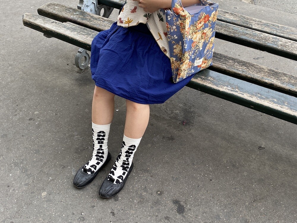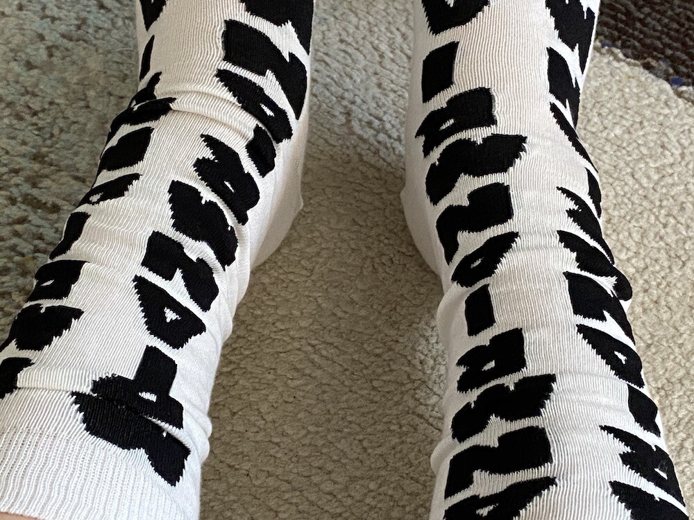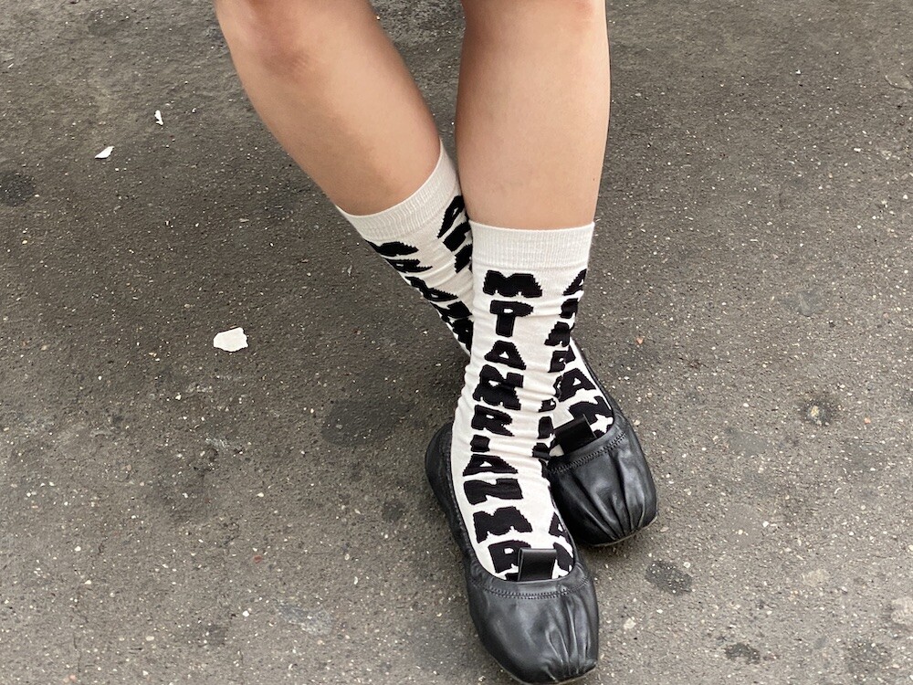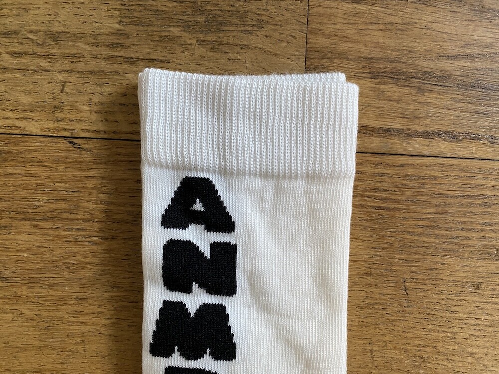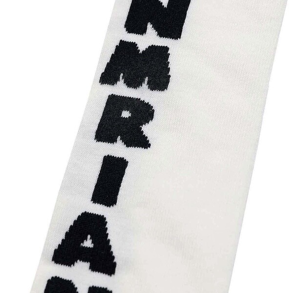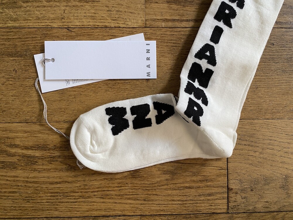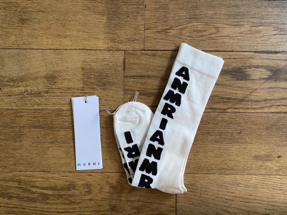 양말의 앞 부분에 MARNI 로고가 써져 있는 양말이에요. 흰색 바탕에 검정색 로고가 적혀 있는데 강렬해 보이지만 코디하면 또 엄청 튀지는 않아서 딱 포인트 주기에 좋더라고요. 원피스에도, 바지에도 잘 어울려요! 종아리 반 정도까지 올라오는 길이감에, 쫀쫀한 밴드로 흘러내리지 않아서 좋아요. 저는 보통 외국 신발 37사이즈를 신는데 이 양말은 조이지 않게 딱 맞았습니다.