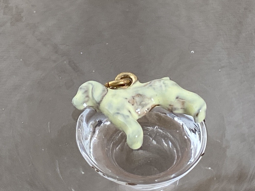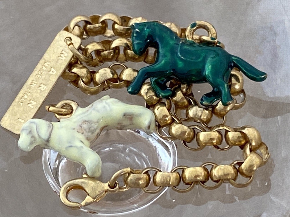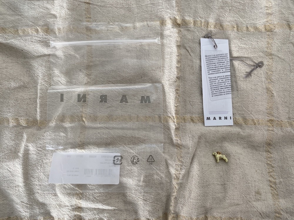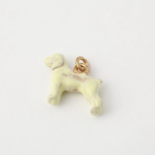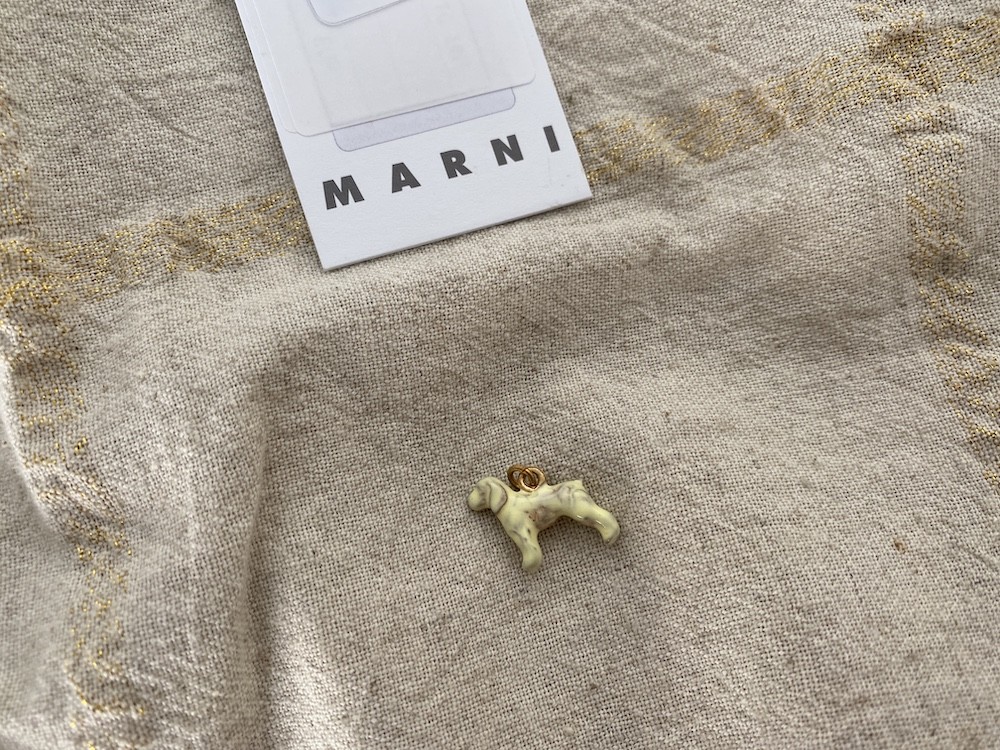 마르니 토이(TOYS) 시리즈에서 나왔던 펜던트로, 가지고 계신 목걸이나 팔찌에 걸면 귀여운 느낌을 완성시켜주는 참이에요. 메탈 소재의 모양 위에 노란빛 베이지의 색깔을 덧입혀 장난감 같기도 하고 사탕같기도 한 느낌이 나네요.