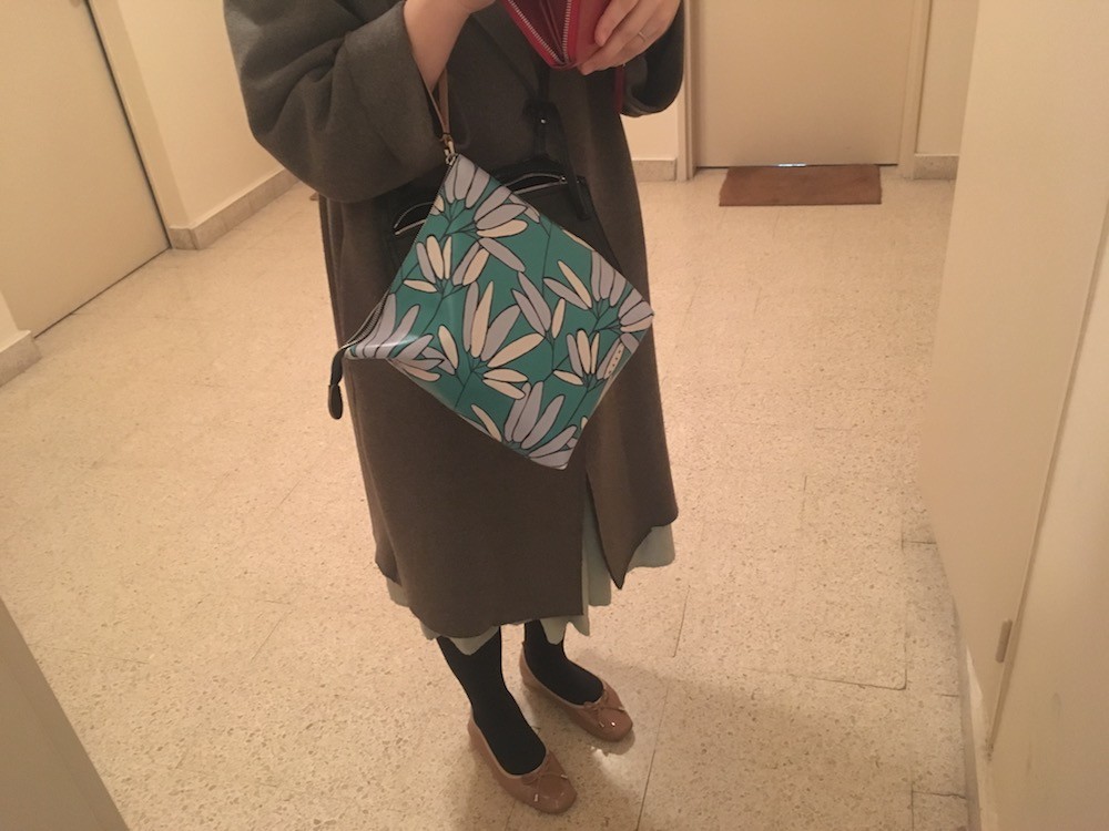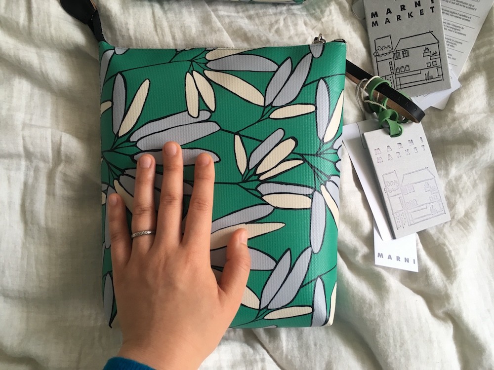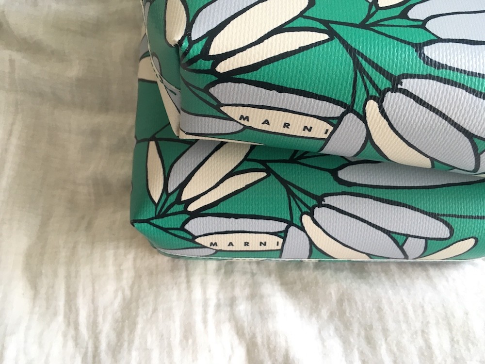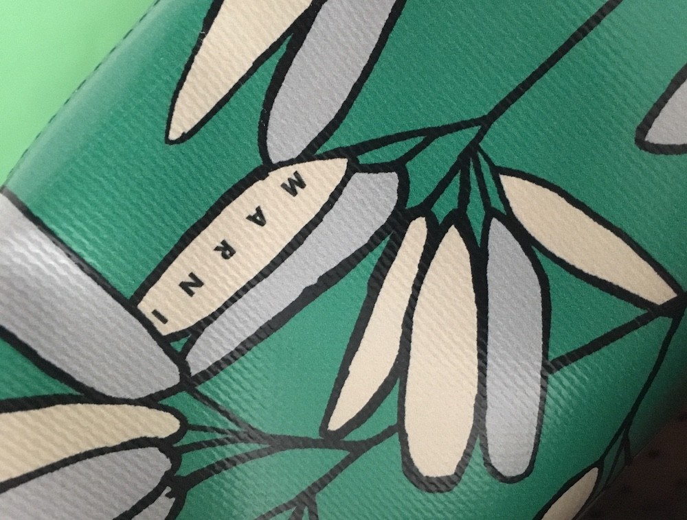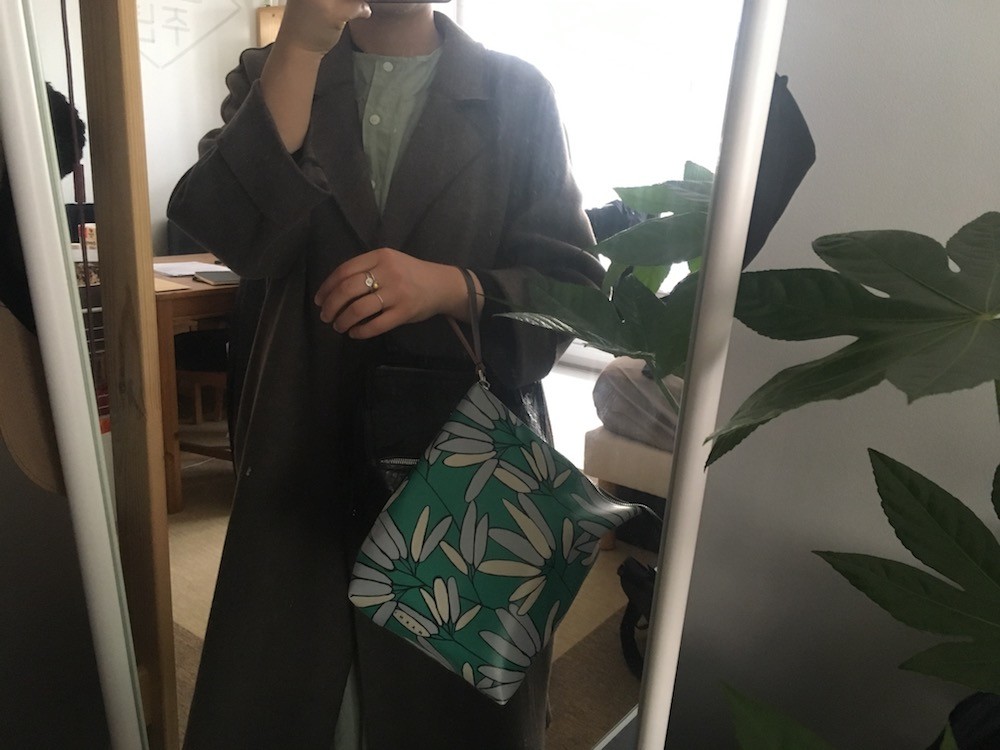 민트빛 도는 녹색이 예쁘고요, 나뭇잎같은 모양에 숨어있듯이 써져있는 MARNI라는 글씨가 귀여워요. 색깔과 모양에서 느껴지는 귀여운 위트는 마르니에서만 찾아볼 수 있는 것 같아요.
