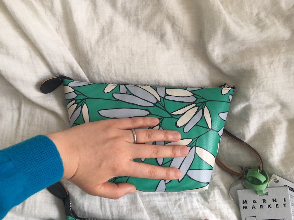 민트빛 도는 녹색이 예쁘고요, 나뭇잎같은 모양에 숨어있듯이 써져있는 MARNI라는 글씨가 귀여워요. 색깔과 모양에서 느껴지는 귀여운 위트는 마르니에서만 찾아볼 수 있는 것 같아요.