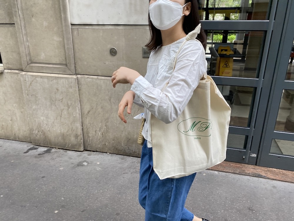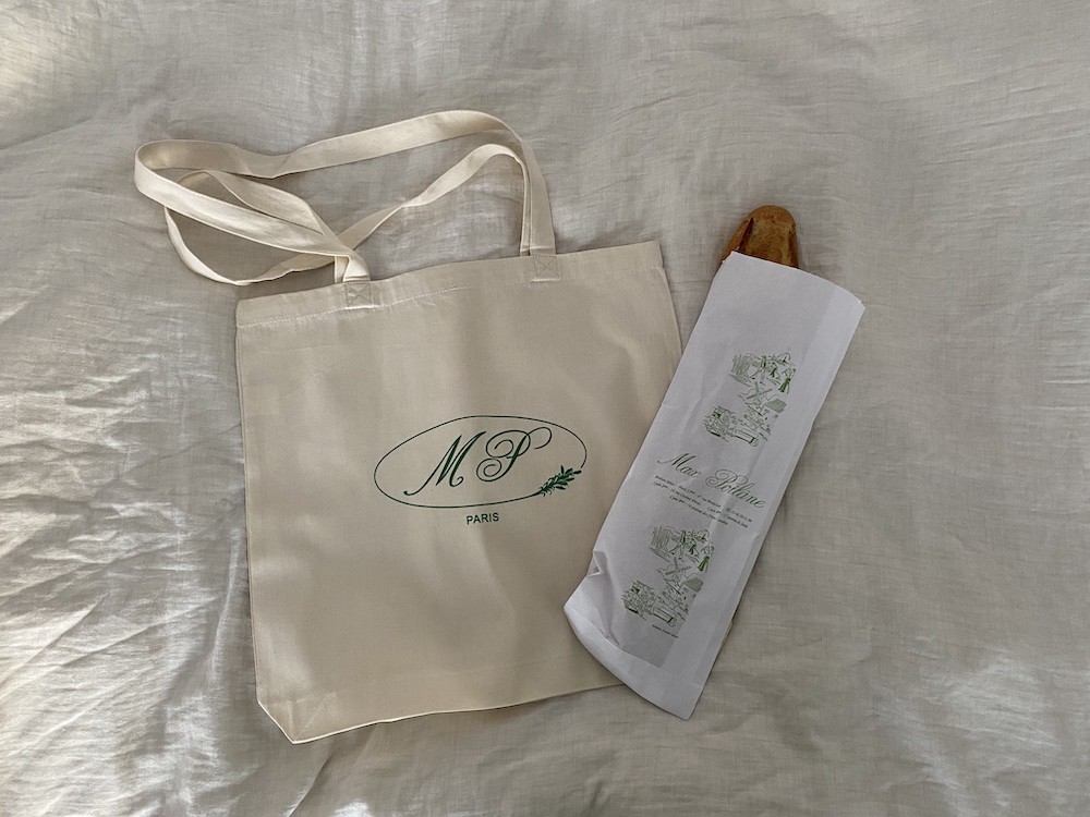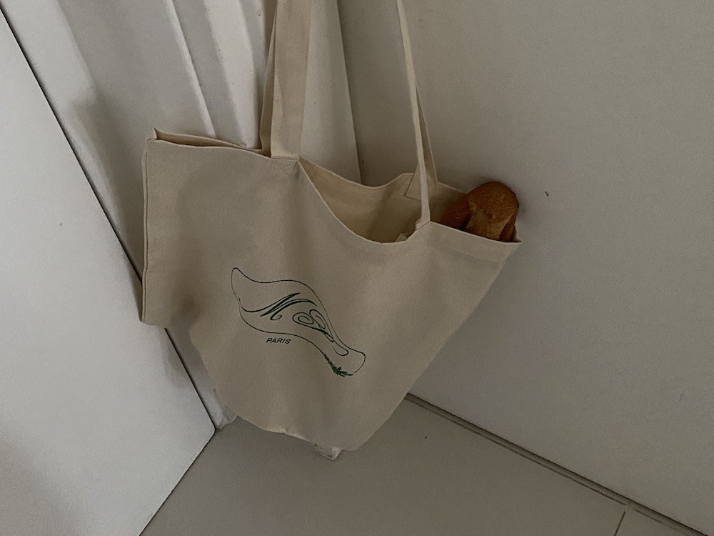 우선 짱짱한 면이라 소재 튼튼하고요. 빵을 담는 용도로 만들어진 가방이라 그런지 크기가 넉넉해요. 한국사람 체형엔 끈이 좀 길다 느껴질 수 있는데, 윗부분을 질끈 묶어 메면 너무 예뻐요.