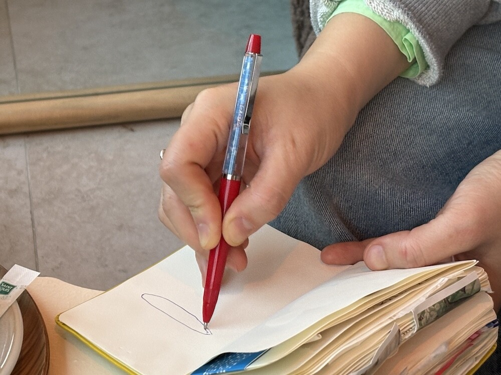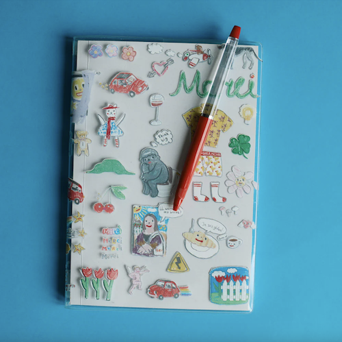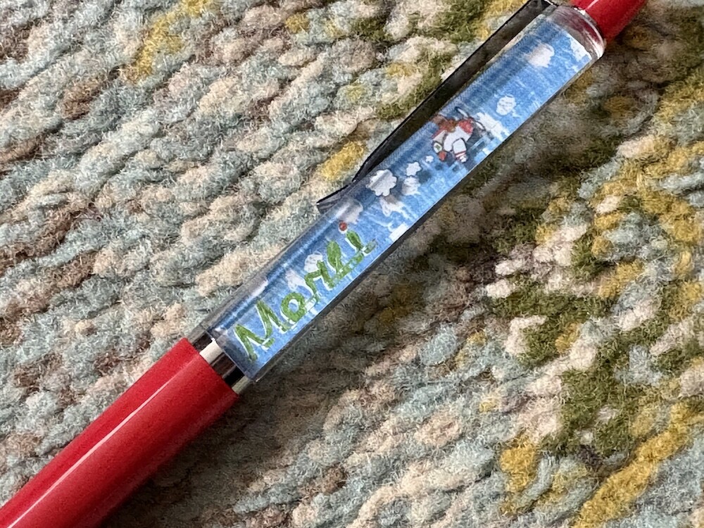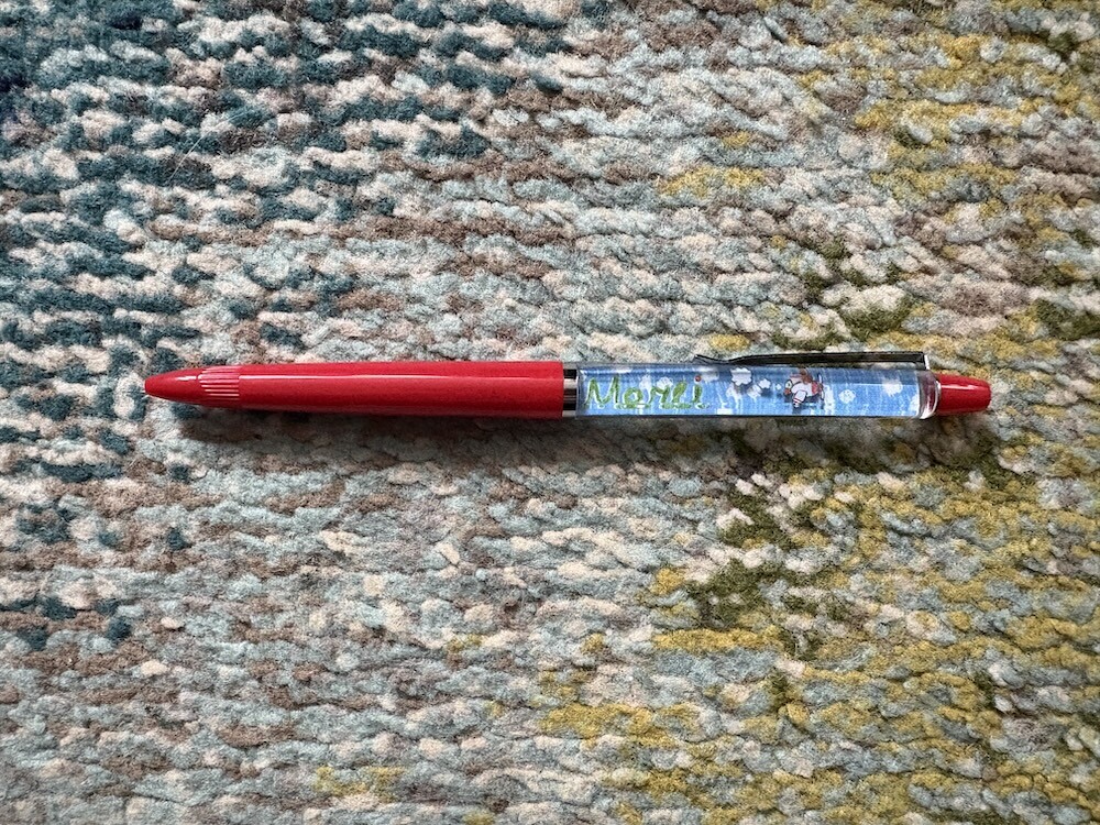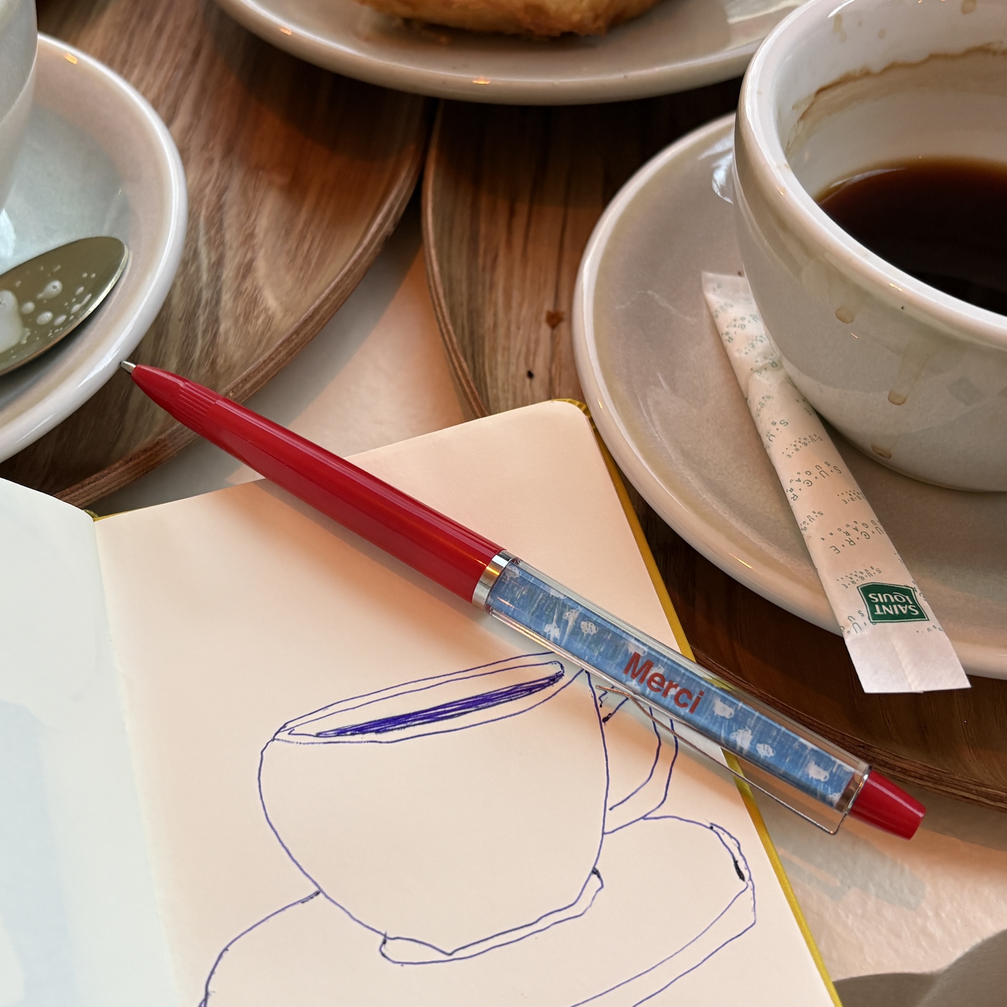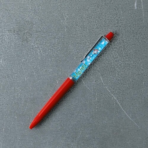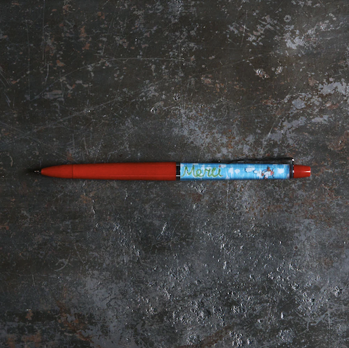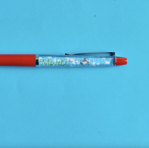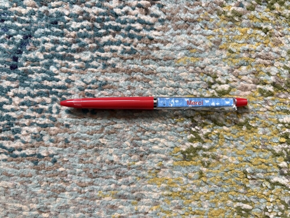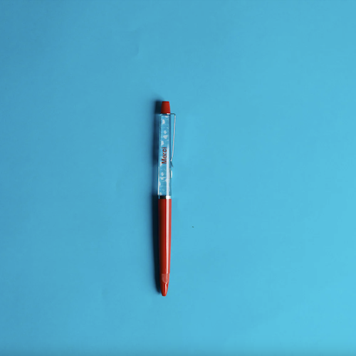 빨간 바탕의 몸체에 윗부분은 투명한 소재로 되어 있고, 그 안에 한쪽 면에는 구름 그림 바탕에 메르시 Merci의 빨간 로고가, 한쪽 면에는 샤이아가 그린 메르시 글씨와 비행기 그림이 있는데요. 재미있는 건, 이 투명한 부분의 안쪽이 액체로 채워져 있어서 비행기 그림이 움직여요. 그래서 보고 있으면 시간 가는 줄을 모르겠더라고요. 펜의 머리 부분을 돌리면 안에서 펜촉이 나오는 형태의 제품이라 가방에 케이스 없이 넣어 다녀도 펜이 저절로 나와 지저분하게 될 일이 없어서 편했어요. 펜 색깔이 검정색이 아닌 파란색인 것도 의외의 매력이 있어서 좋네요.