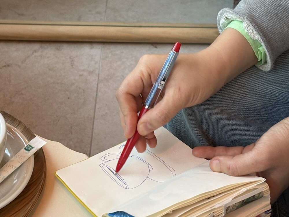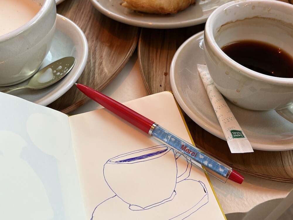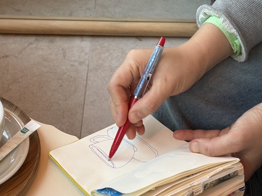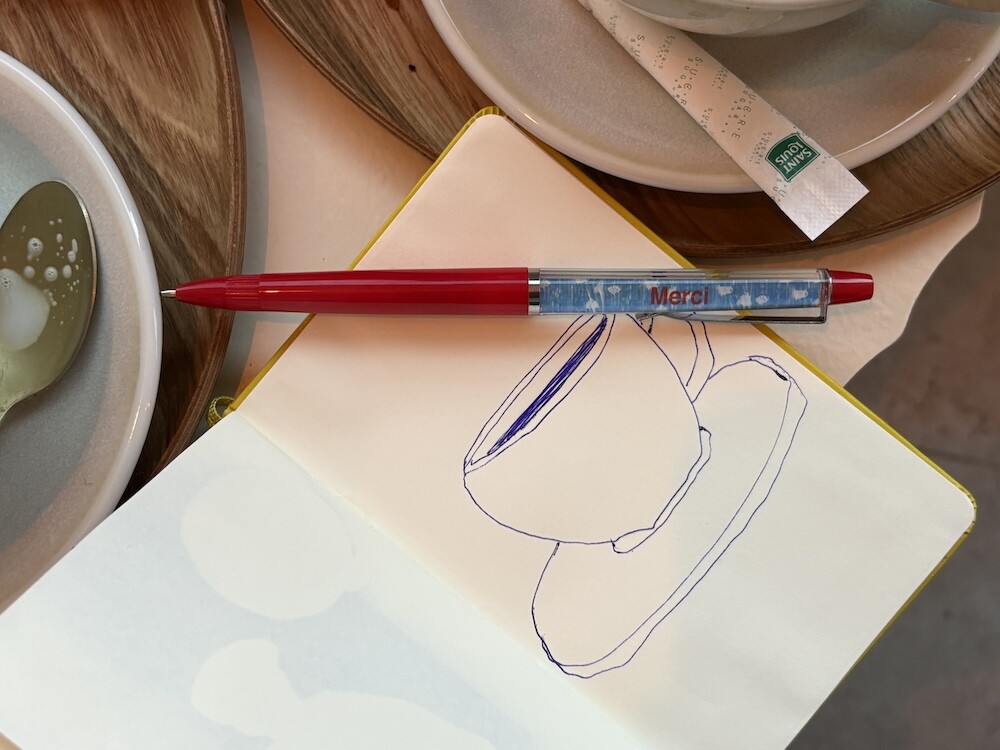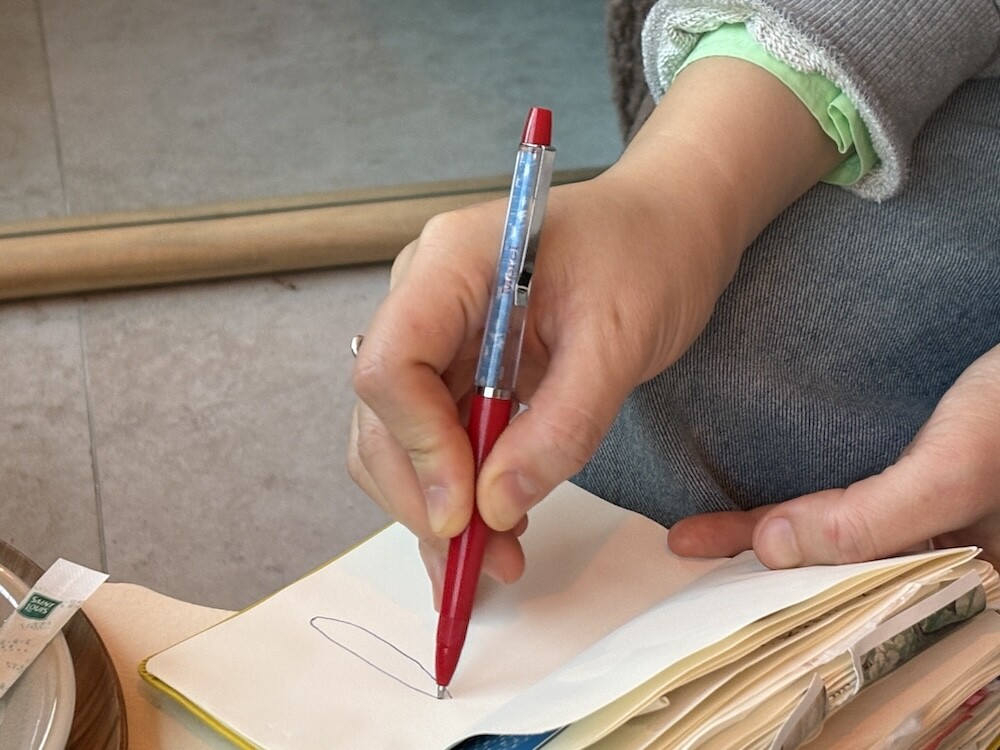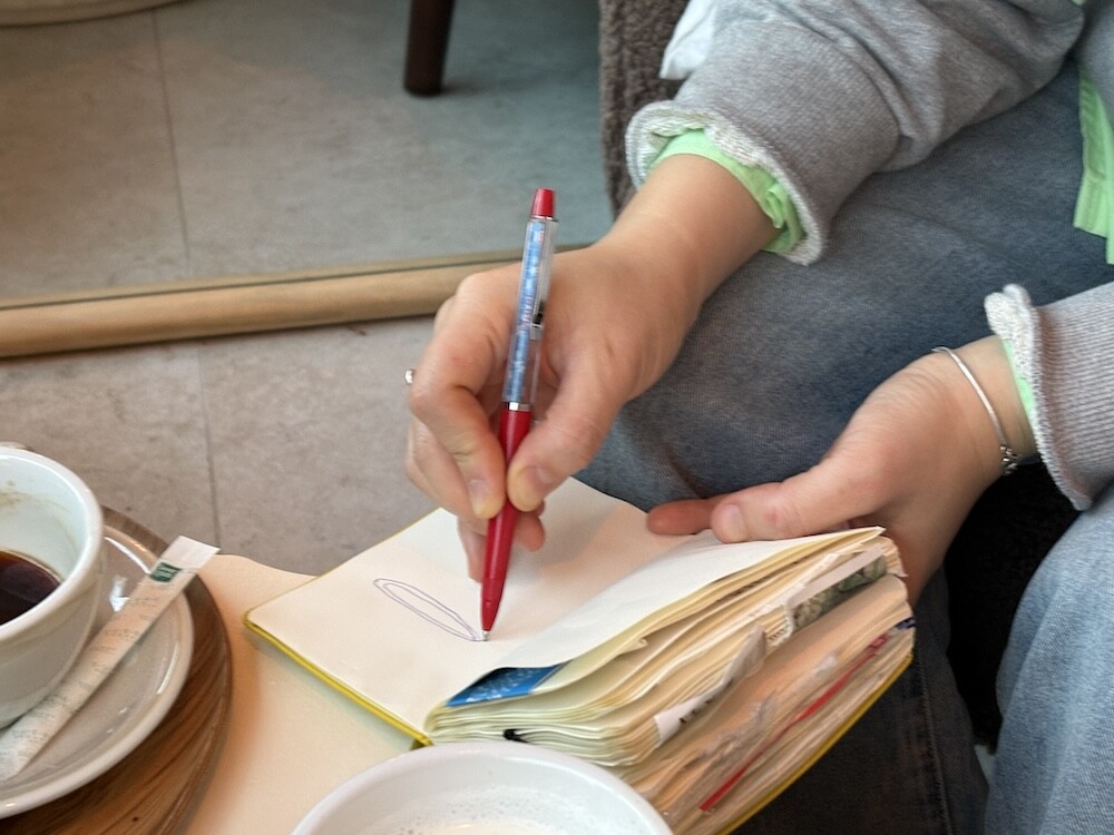 빨간 바탕의 몸체에 윗부분은 투명한 소재로 되어 있고, 그 안에 한쪽 면에는 구름 그림 바탕에 메르시 Merci의 빨간 로고가, 한쪽 면에는 샤이아가 그린 메르시 글씨와 비행기 그림이 있는데요. 재미있는 건, 이 투명한 부분의 안쪽이 액체로 채워져 있어서 비행기 그림이 움직여요. 그래서 보고 있으면 시간 가는 줄을 모르겠더라고요. 펜의 머리 부분을 돌리면 안에서 펜촉이 나오는 형태의 제품이라 가방에 케이스 없이 넣어 다녀도 펜이 저절로 나와 지저분하게 될 일이 없어서 편했어요. 펜 색깔이 검정색이 아닌 파란색인 것도 의외의 매력이 있어서 좋네요.