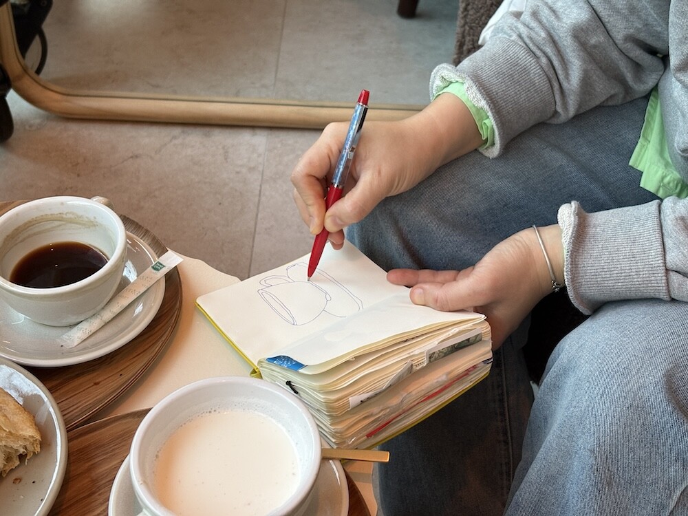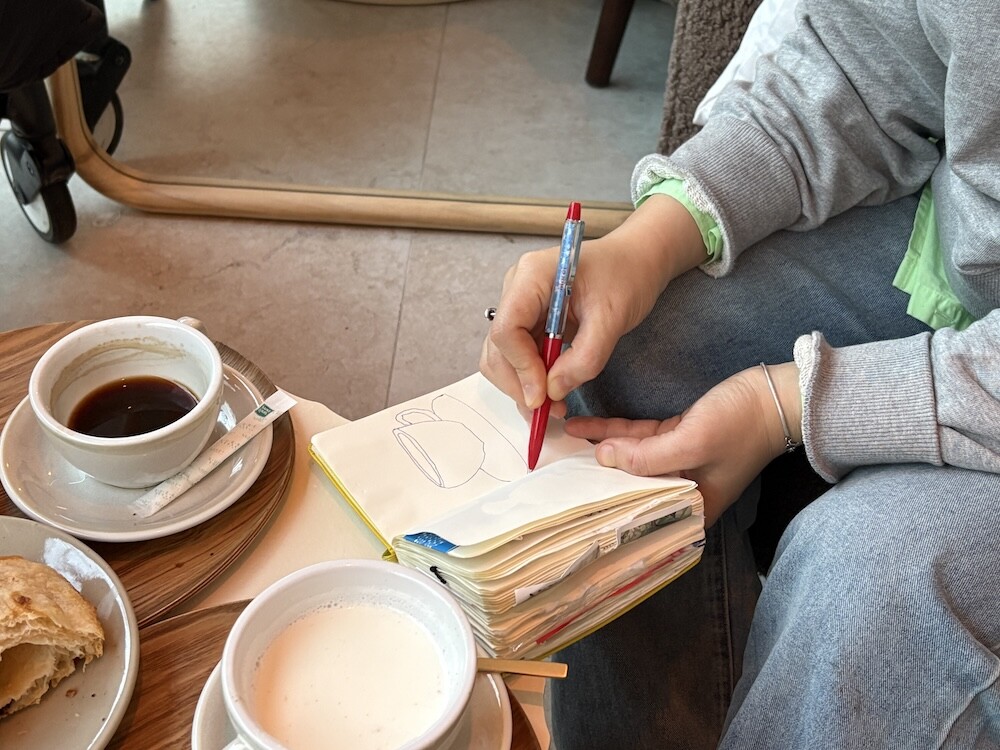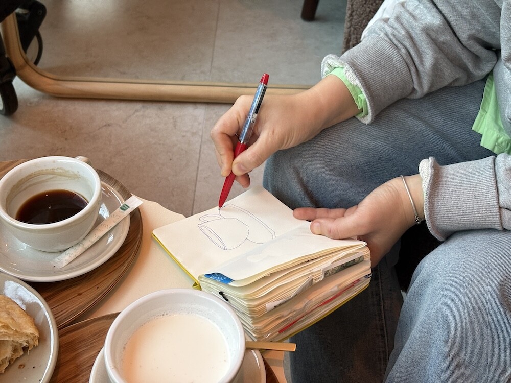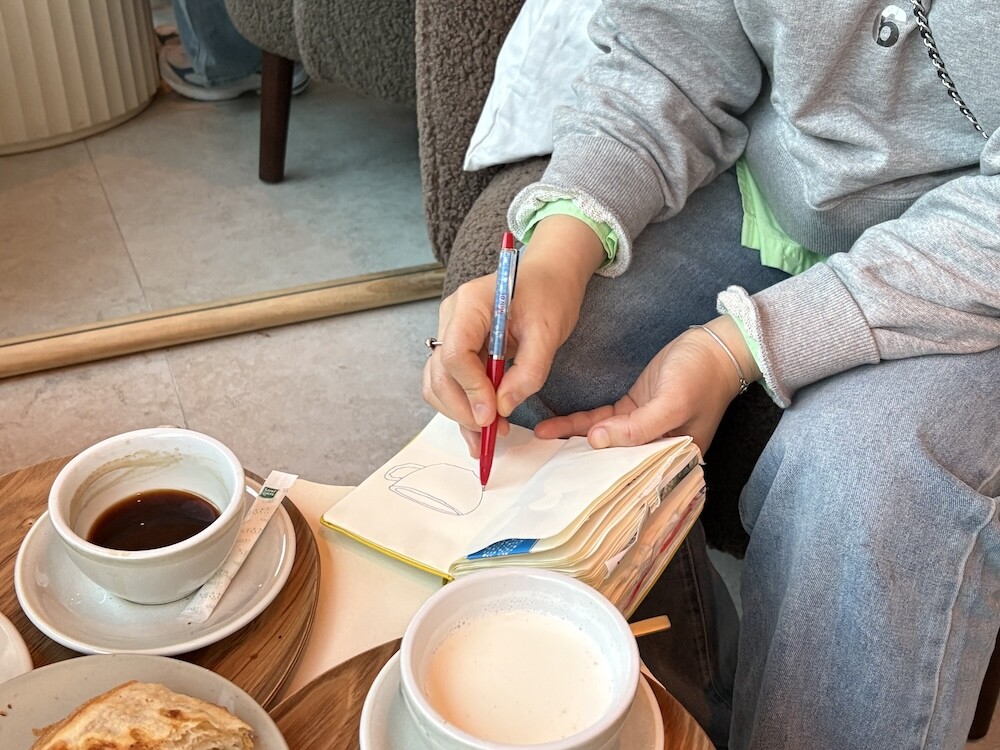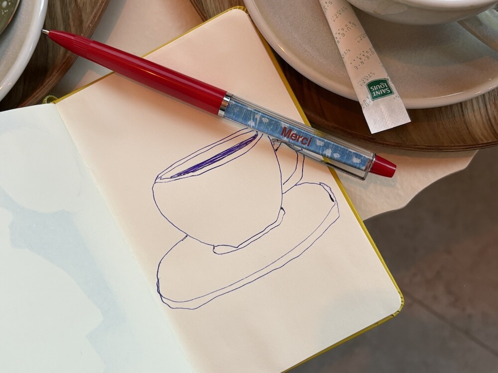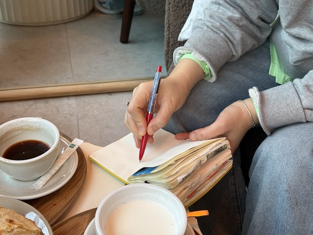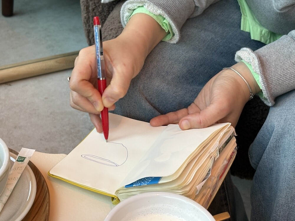 빨간 바탕의 몸체에 윗부분은 투명한 소재로 되어 있고, 그 안에 한쪽 면에는 구름 그림 바탕에 메르시 Merci의 빨간 로고가, 한쪽 면에는 샤이아가 그린 메르시 글씨와 비행기 그림이 있는데요. 재미있는 건, 이 투명한 부분의 안쪽이 액체로 채워져 있어서 비행기 그림이 움직여요. 그래서 보고 있으면 시간 가는 줄을 모르겠더라고요. 펜의 머리 부분을 돌리면 안에서 펜촉이 나오는 형태의 제품이라 가방에 케이스 없이 넣어 다녀도 펜이 저절로 나와 지저분하게 될 일이 없어서 편했어요. 펜 색깔이 검정색이 아닌 파란색인 것도 의외의 매력이 있어서 좋네요.