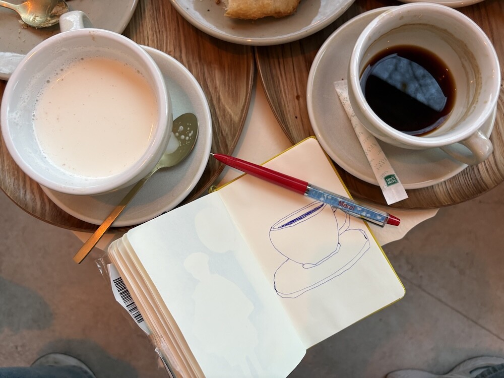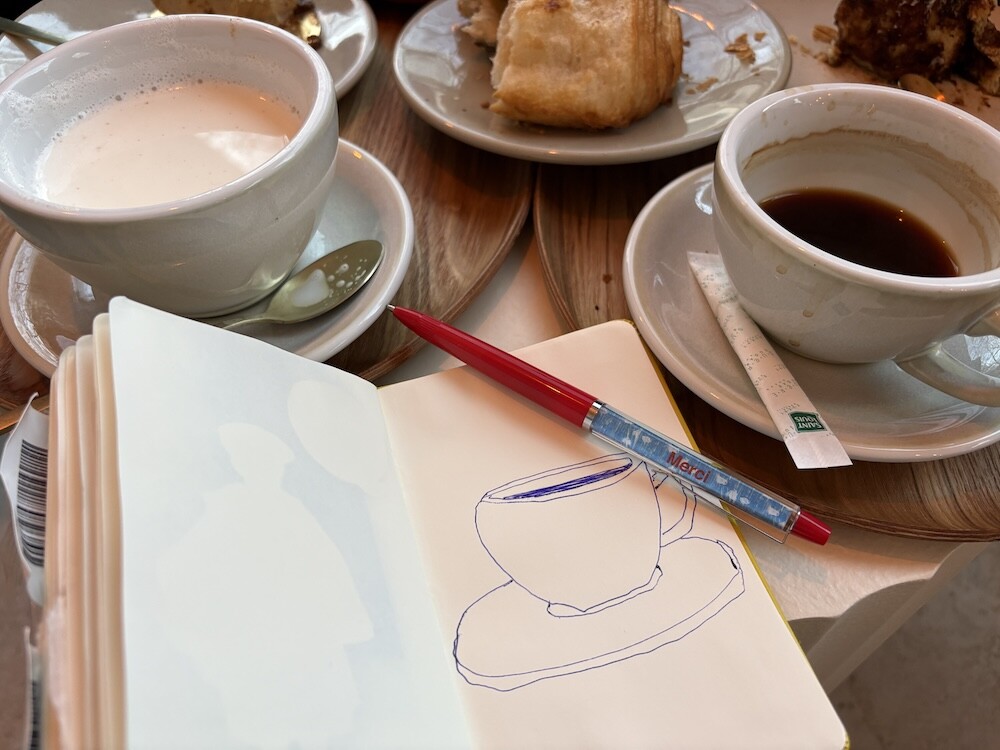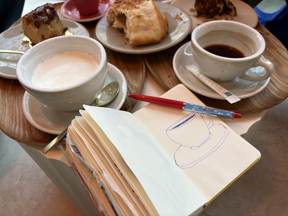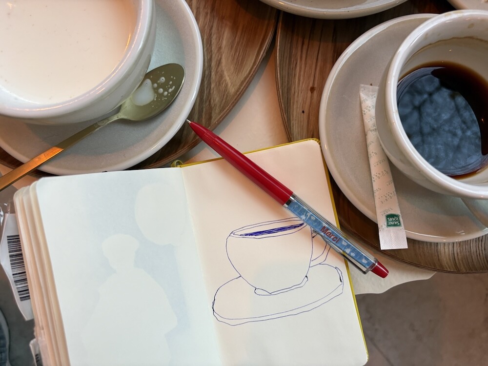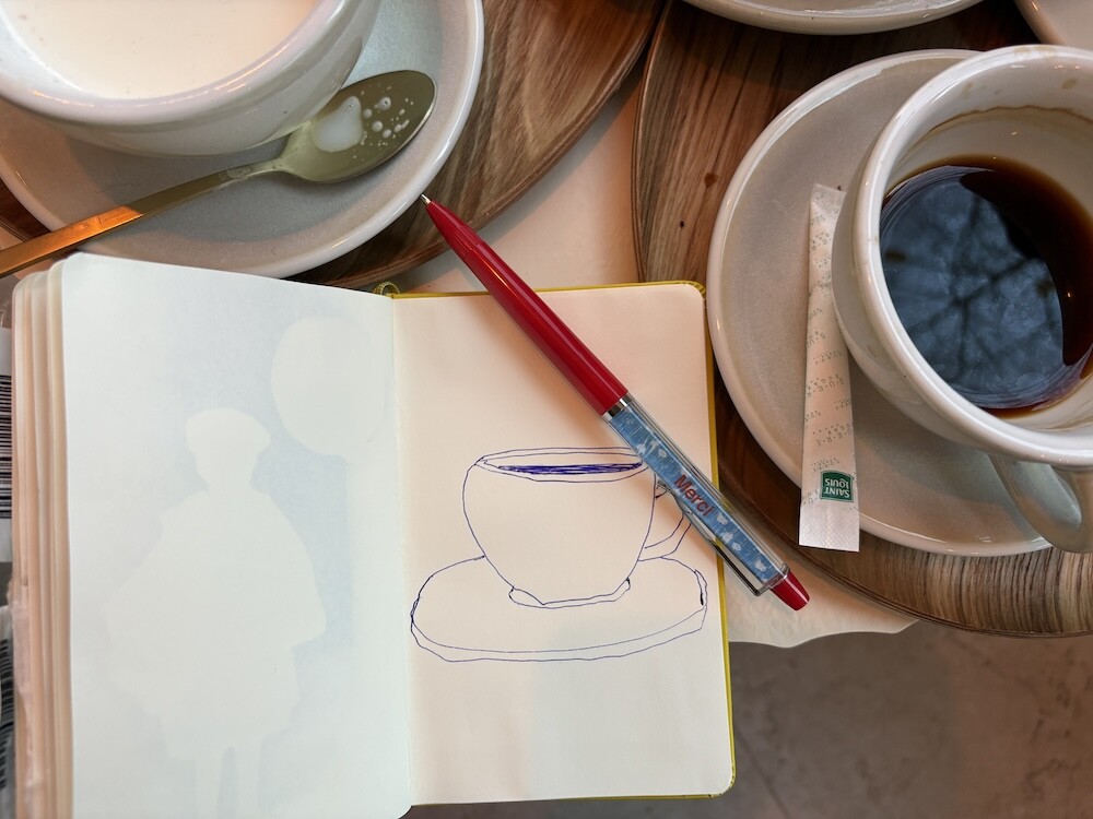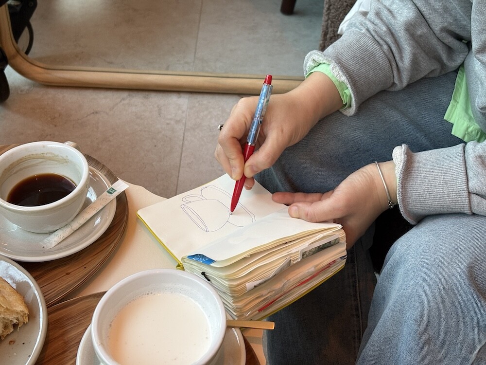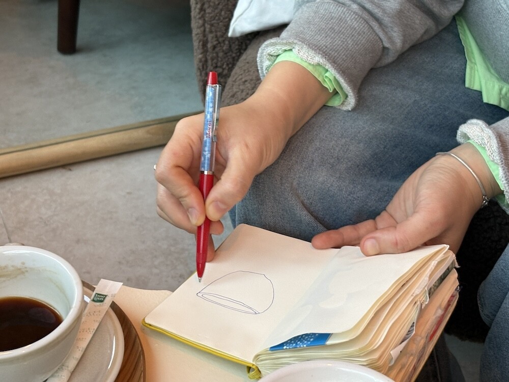 빨간 바탕의 몸체에 윗부분은 투명한 소재로 되어 있고, 그 안에 한쪽 면에는 구름 그림 바탕에 메르시 Merci의 빨간 로고가, 한쪽 면에는 샤이아가 그린 메르시 글씨와 비행기 그림이 있는데요. 재미있는 건, 이 투명한 부분의 안쪽이 액체로 채워져 있어서 비행기 그림이 움직여요. 그래서 보고 있으면 시간 가는 줄을 모르겠더라고요. 펜의 머리 부분을 돌리면 안에서 펜촉이 나오는 형태의 제품이라 가방에 케이스 없이 넣어 다녀도 펜이 저절로 나와 지저분하게 될 일이 없어서 편했어요. 펜 색깔이 검정색이 아닌 파란색인 것도 의외의 매력이 있어서 좋네요.