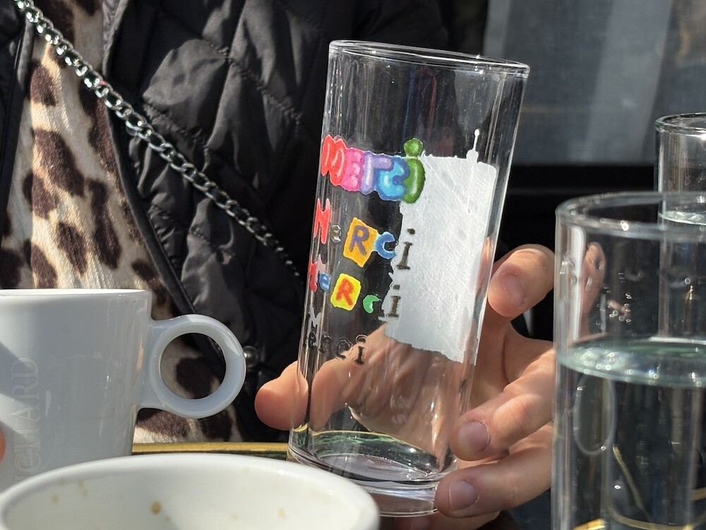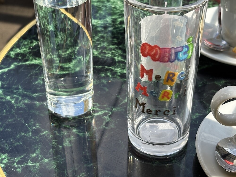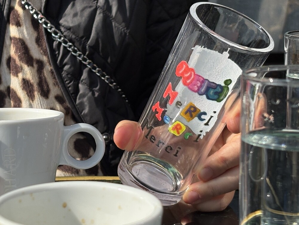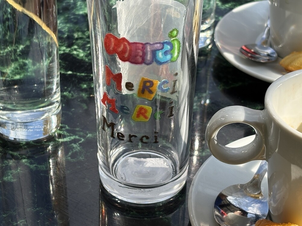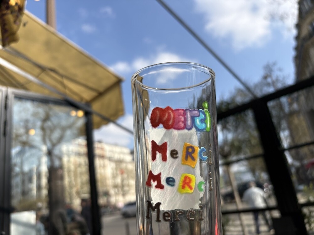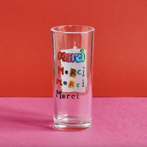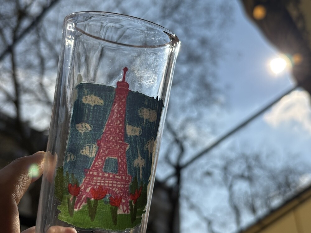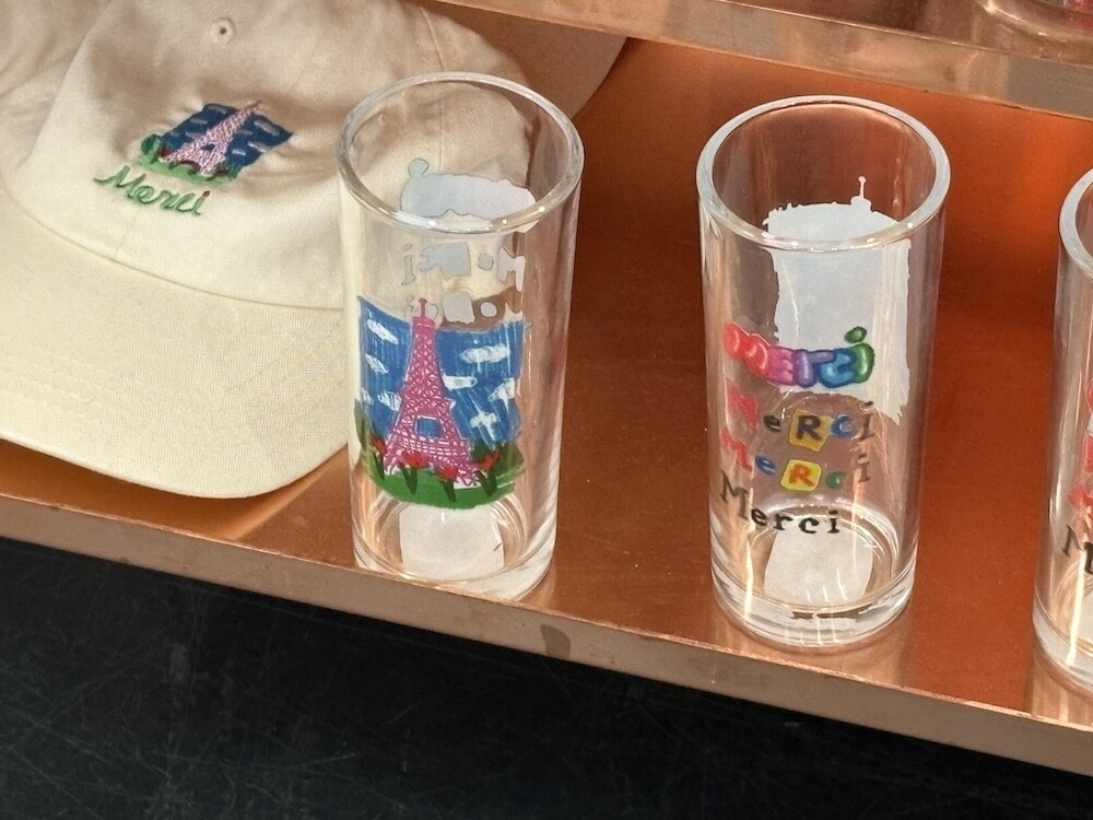 앞쪽에는 에펠탑 그림이, 뒤쪽에는 메르시 Merci라고 써진 다양한 글씨들이 그려져 있어요. 앞뒷면 그림이 달라서 두 가지 느낌으로 사용할 수 있는 것도 좋네요. 두툼한 유리라 튼튼하게 오래오래 사용하실 수 있으실 거예요.