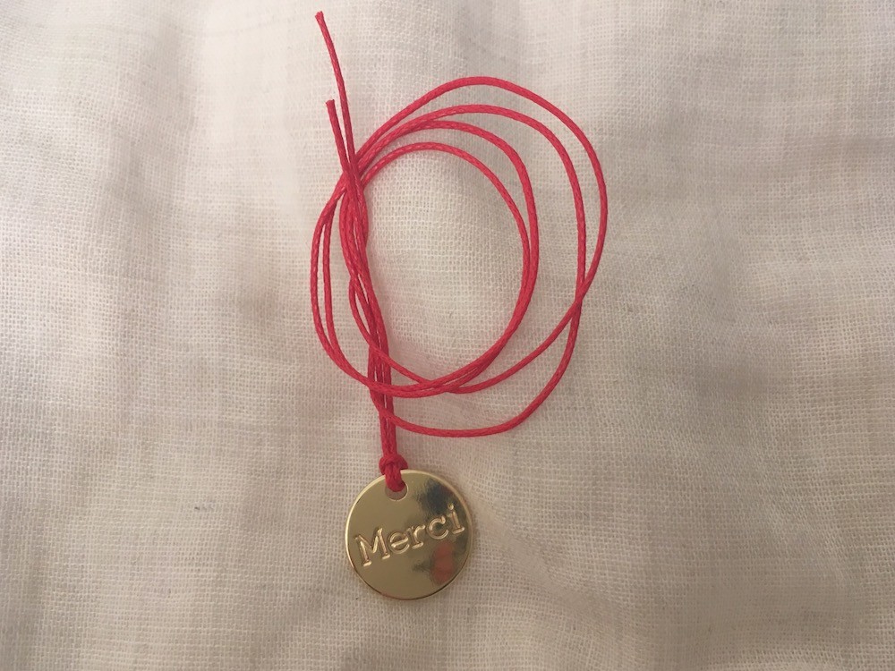 빨간색 줄에 매달린 금색 메달과 Merci 글씨, 심플하지만 포인트 아이템으로 활용하기 좋아요. 팔찌이지만 목걸이로 사용해도 예쁘답니다!