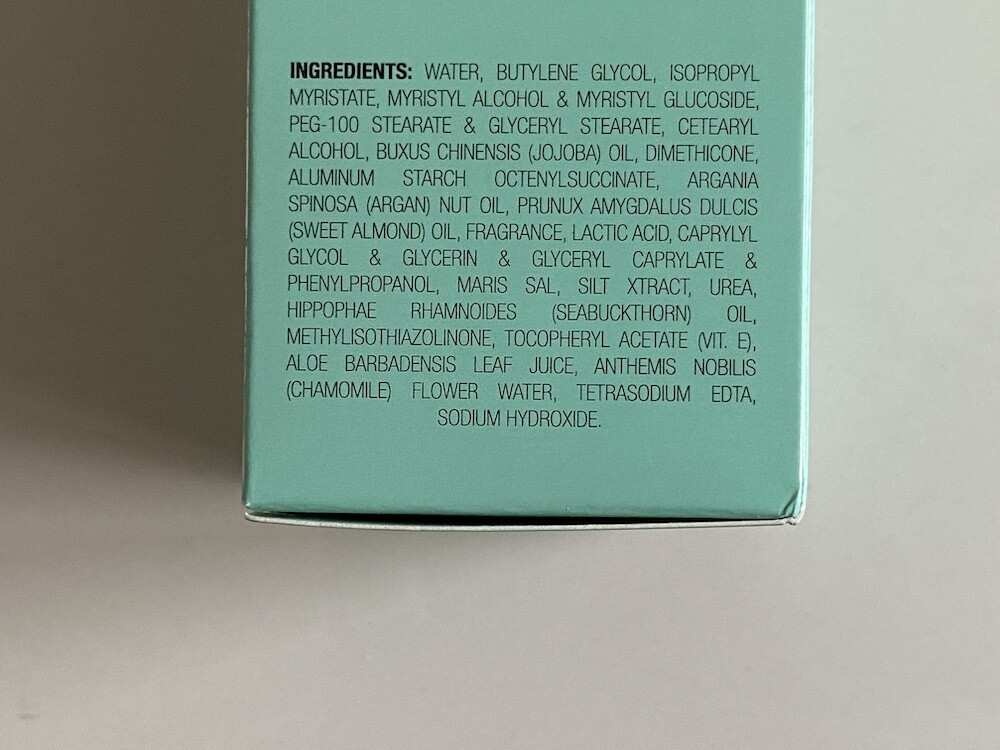 WATER, BUTYLENE GLYCOL, ISOPROPYL MYRISTATE, MYRISTYL ALCOHOL & MYRISTYL GLUCOSIDE, PEG-100 STEARATE & GLYCERYL STEARATE, CETEARYL ALCOHOL, BUXUS CHINENSIS (JOJOBA) OIL, DIMETHICONE, ALUMINUM STARCH OCTENYLSUCCINATE, ARGANIA SPINOSA (ARGAN) NUT OIL, PRUNUX AMYGDALUS DULCIS (SWEET ALMOND) OIL, FRAGRANCE, LACTIC ACID, CAPRYLYL GLYCOL & GLYCERIN & GLYCERYL CAPRYLATE & PHENYLPROPANOL, MARIS SAL, SILT XTRACT, UREA, HIPPOPHAE RHAMNOIDES (SEABUCKTHORN) OIL, METHYLISOTHIAZOLINONE, TOCOPHERYL ACETATE (VIT.E), ALOE BARBADENSIS LEAF JUICE, ANTHEMIS NOBILIS (CHAMOMILE) FLOWER WATER, TETRASODIUM EDTA, SODIUM HYDROXIDE