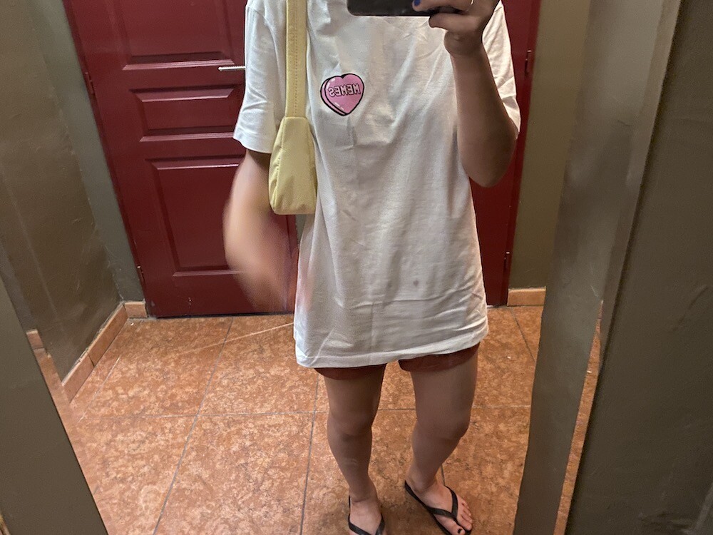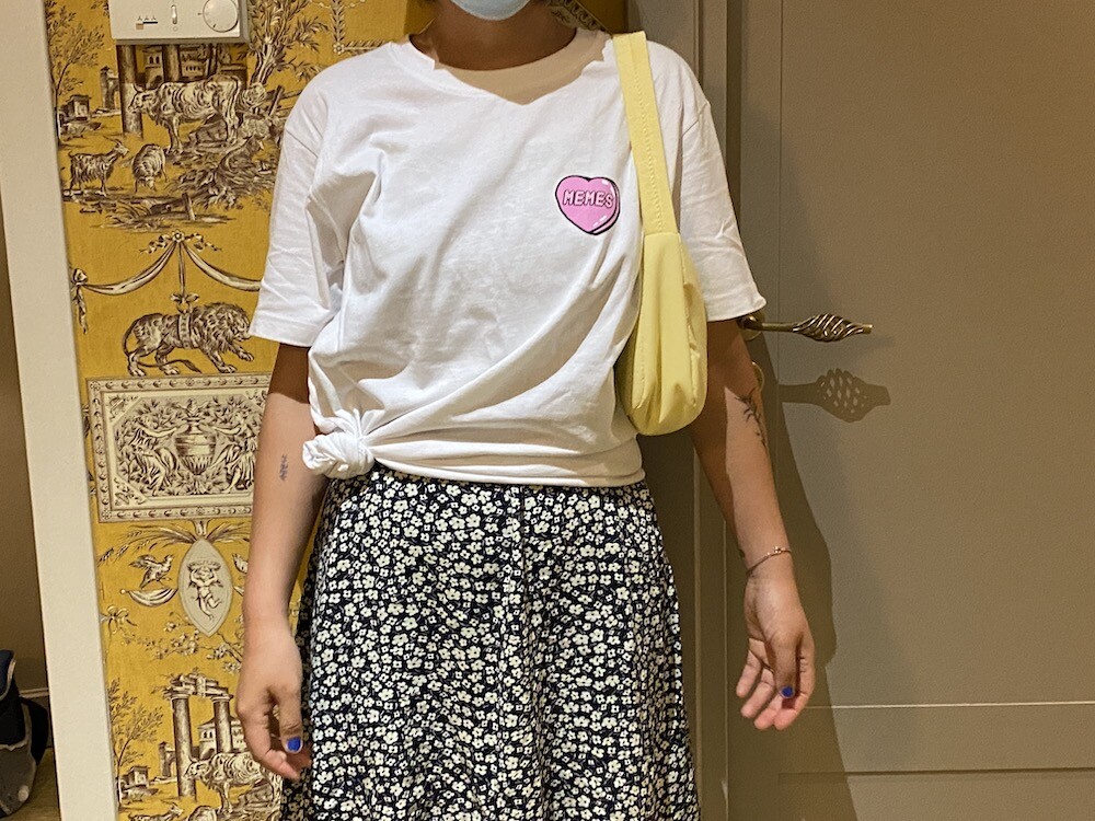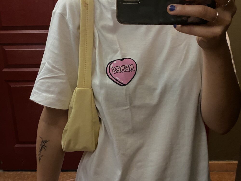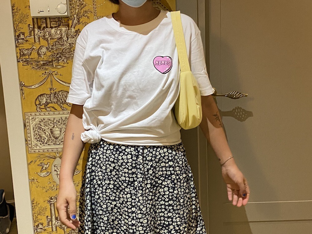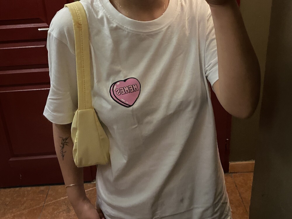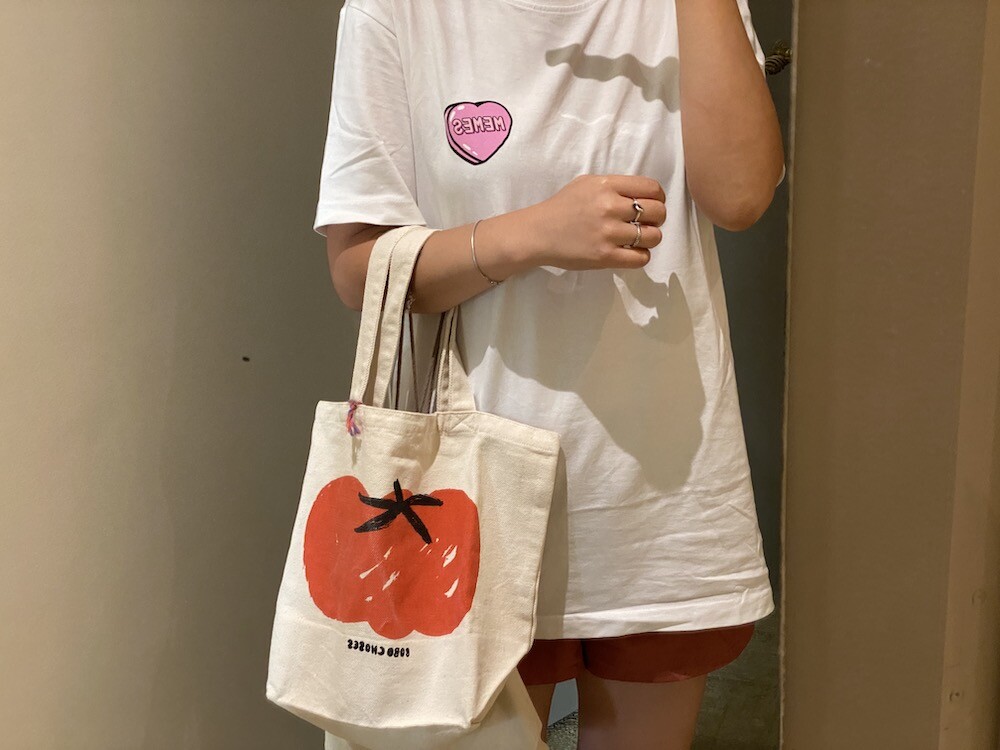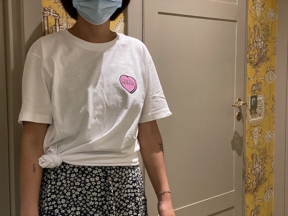 기본 면 티셔츠에 귀여운 하트 프린트가 되어있는 이 티셔츠는, 하트 위에 새겨진 멤 MEMES이라는 프랑스어 단어가 귀여우면서도 예뻐요. MEMES(mêmes)이라는 단어는 보통 '~와 같은"이라는 뜻으로 쓰이는데, 사람한테 쓰면 '그 자신'이라는 뜻이기도 해요. '나 자신' 같은 뜻인데 저는 이 단어가 참 좋더라고요. 단어 맨 뒤에 s가 붙어있기 때문에 '우리 자신, 그들 자신'같은 뜻이라고 생각하시면 될 것 같아요.