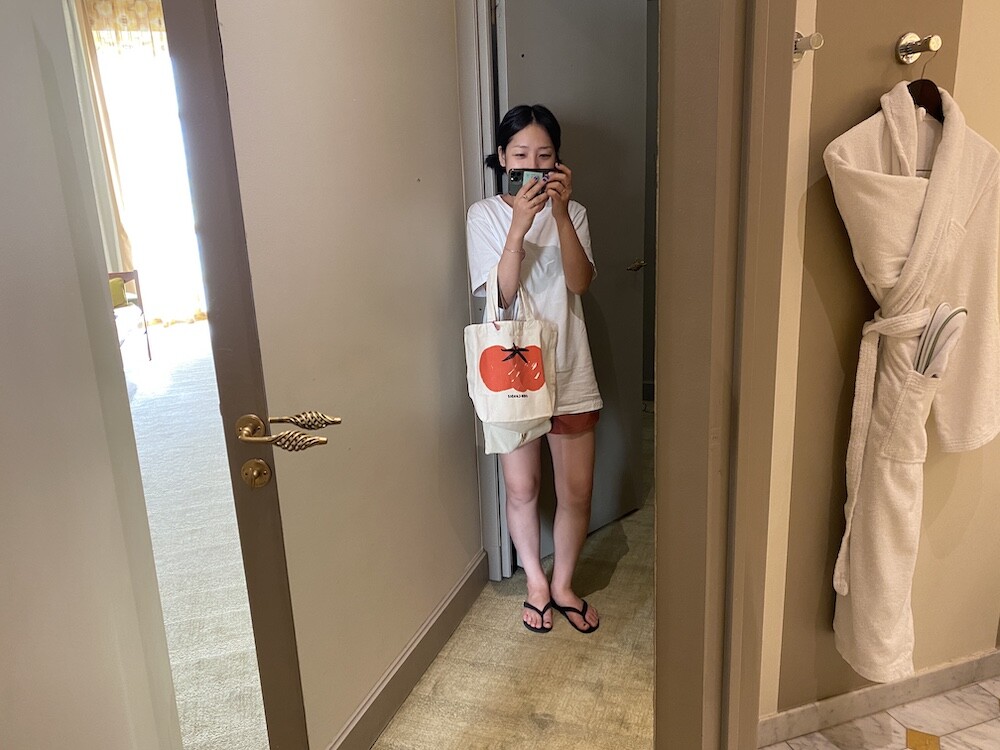 그냥 여기저기 입기 예뻐요. 귀엽고 깔끔해요. 작년에 구할 수 있는 수량이 많지 않았어서, 많은 수량이 풀릴 때까지 기다렸다가 올 여름에야 진행하게 된 티셔츠입니다. 길이감이 넉넉해서 바지 안에 넣어 입고 앉아도 허리나 엉덩이가 보이지 않아요. (넣어입을 적에 이 부분 아주 중요하죠!)