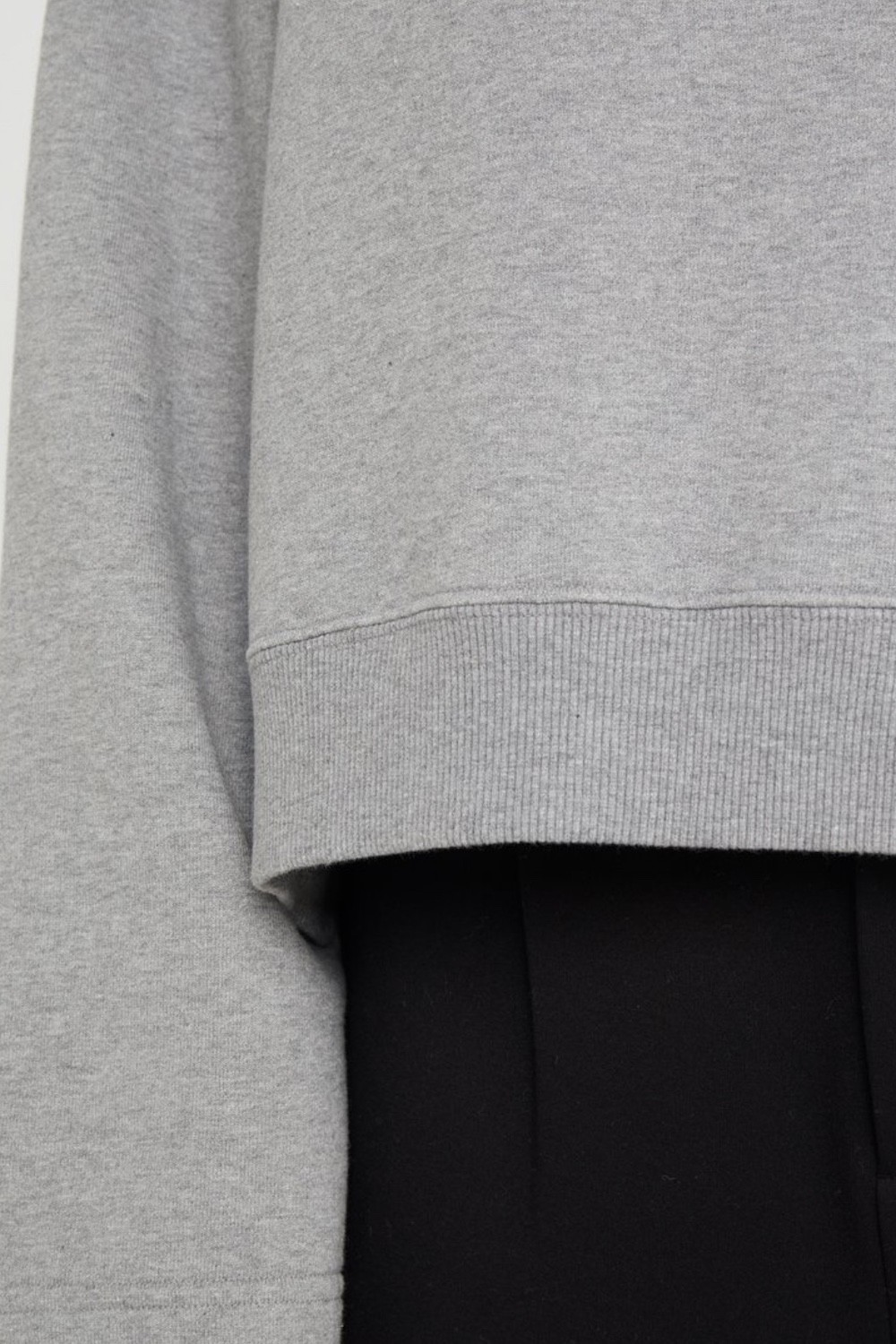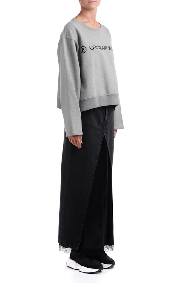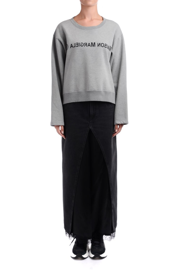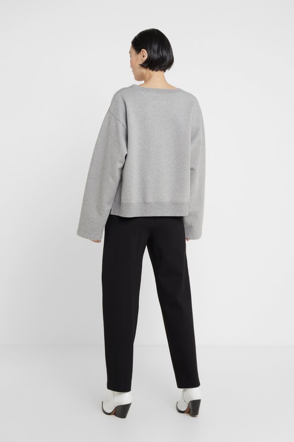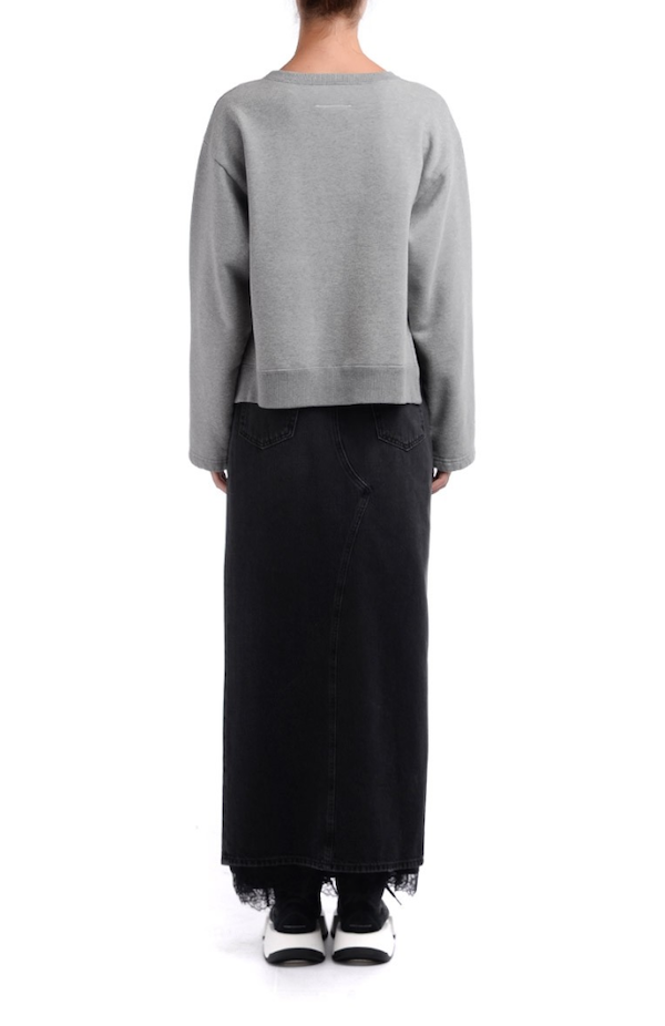 이 스웻셔츠는 우선 "MAISON MARGIELA 6" 이라고 씌여진 앞면에서 포인트를 한번 확 주어서 눈길을 끌어요. 소매는 일반 스웻셔츠보다 길어서 손등을 반정도 덮는 디자인이고요, 옆선이 트여 있어서 통 넓은 원피스나 바지와 입어도 예뻐요.