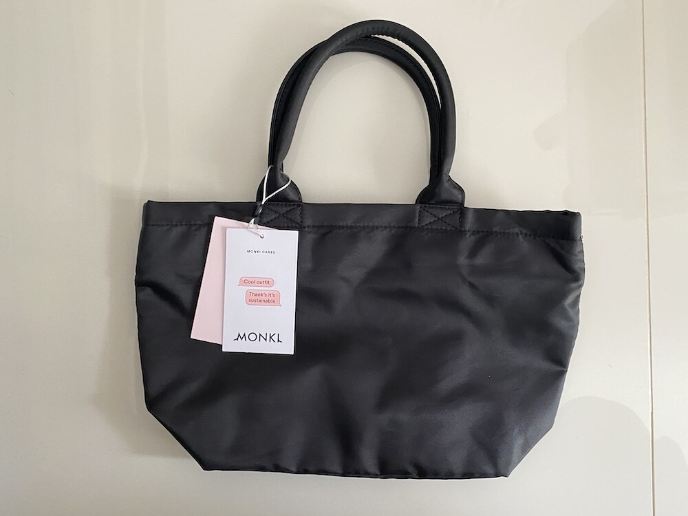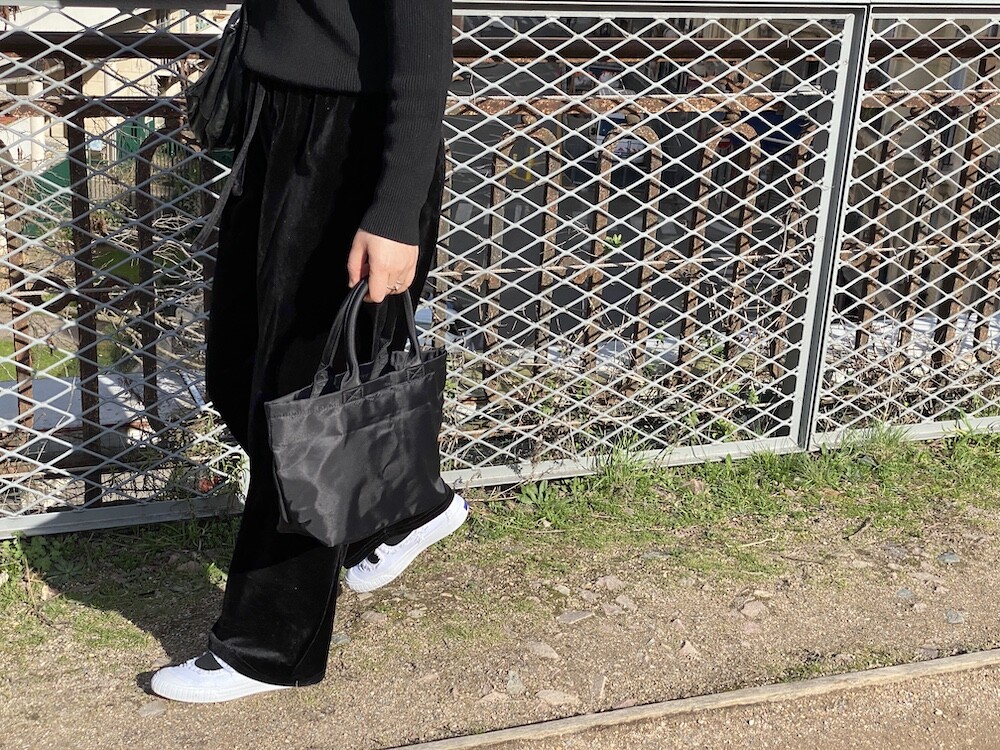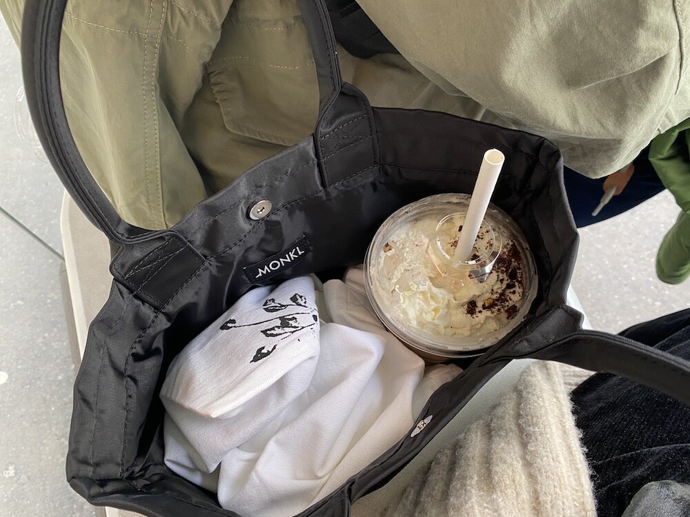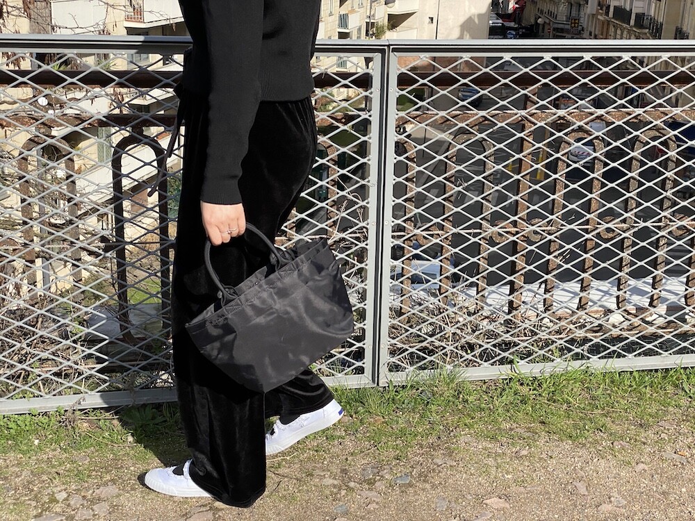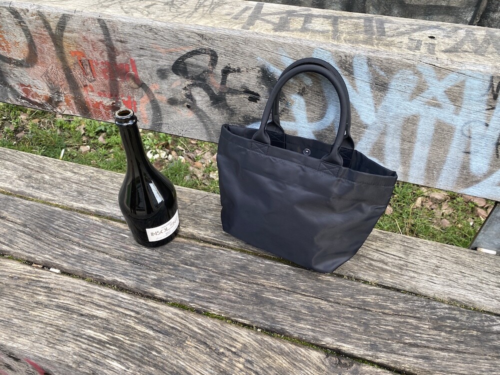 이 귀여운 가방은 재생 폴리에스테르로 만들어진, 환경을 생각하는 가방이에요. 한국 여성들한테 잘 어울리는 사이즈라 손으로 들어도, 팔에 걸쳐도 딱 예뻐요. 밑면이 넓어서 모양이 안정적이라 텀블러나 음료를 넣어 가지고 다녀도 넘어지지 않고 좋더라고요. 또, 입구에 자석으로 된 똑딱이 단추가 있어서 가방을 벌어지지 않게 들고 다닐 수 있어요. 롱샴에서 제일 유명한 디자인 가방 아시죠? 그것과 비슷한데 소재감이 조금 더 부드러운 느낌이라고 생각하시면 좋을 것 같아요.