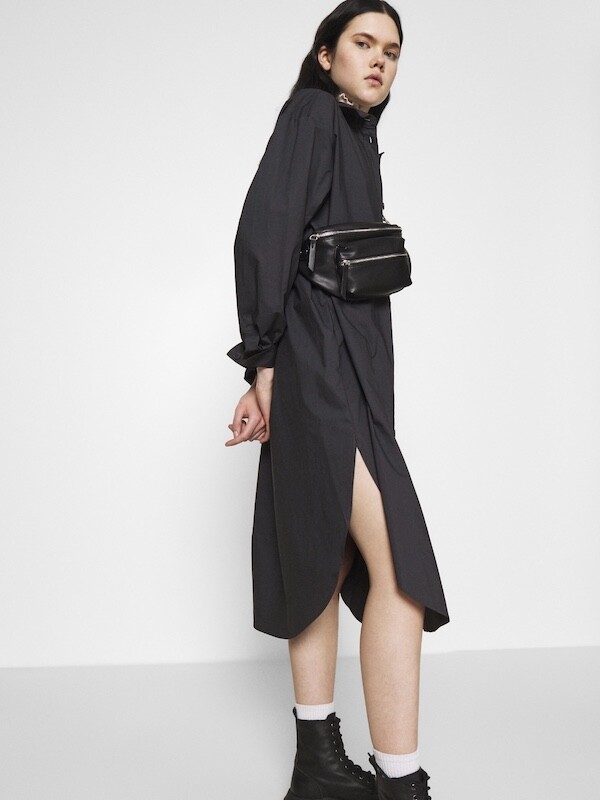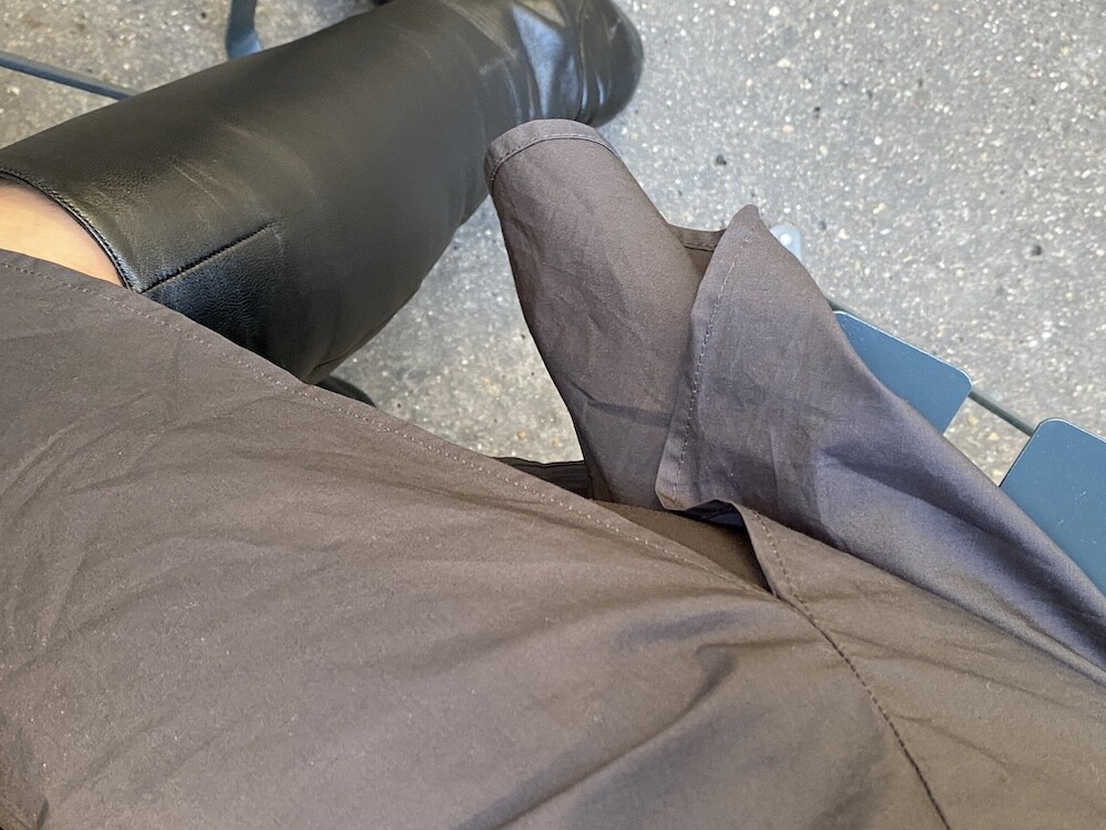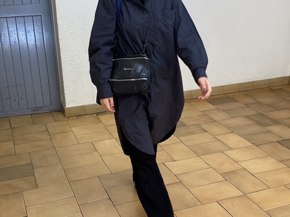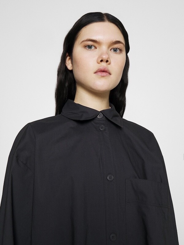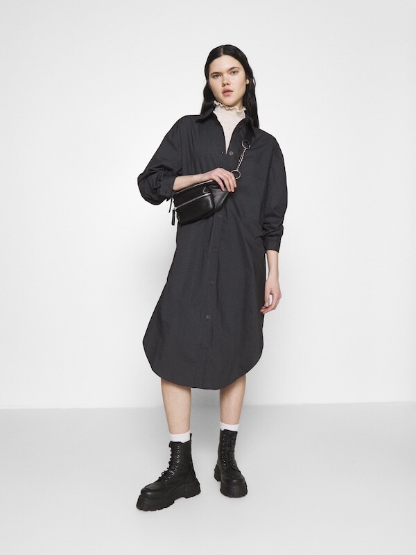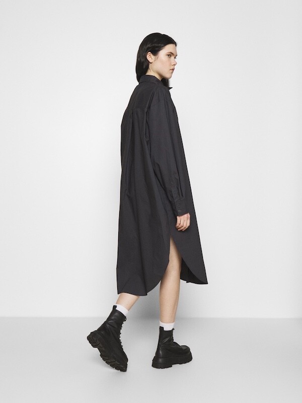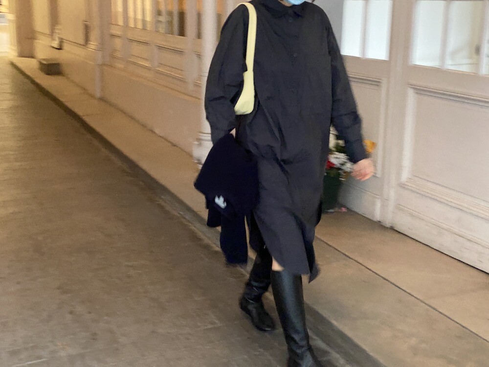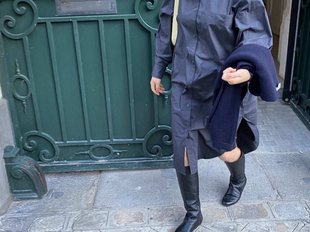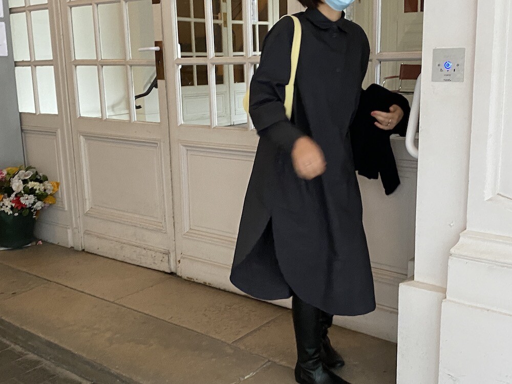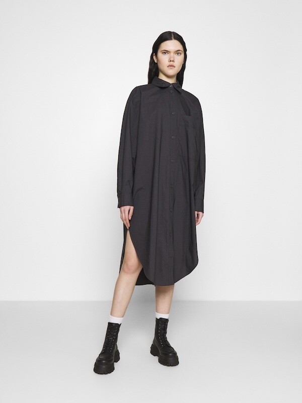 챠콜색 원단이 예쁜 이 셔츠는 우선 원단이 톡톡해서 몸매가 마구 드러나지 않아요. 종아리까지 내려오는 길이라 원피스처럼 단독으로 입으셔도 예쁘고 니트와 함께 매치해도 정말 예뻐요. 게다가 박음질 퀄리티가 진짜 좋아요. 받아 보시면 아실 거예요. 앞면 단추 달리는 부분의 박음질과 마감 퀄리티가 얼마나 좋은지!