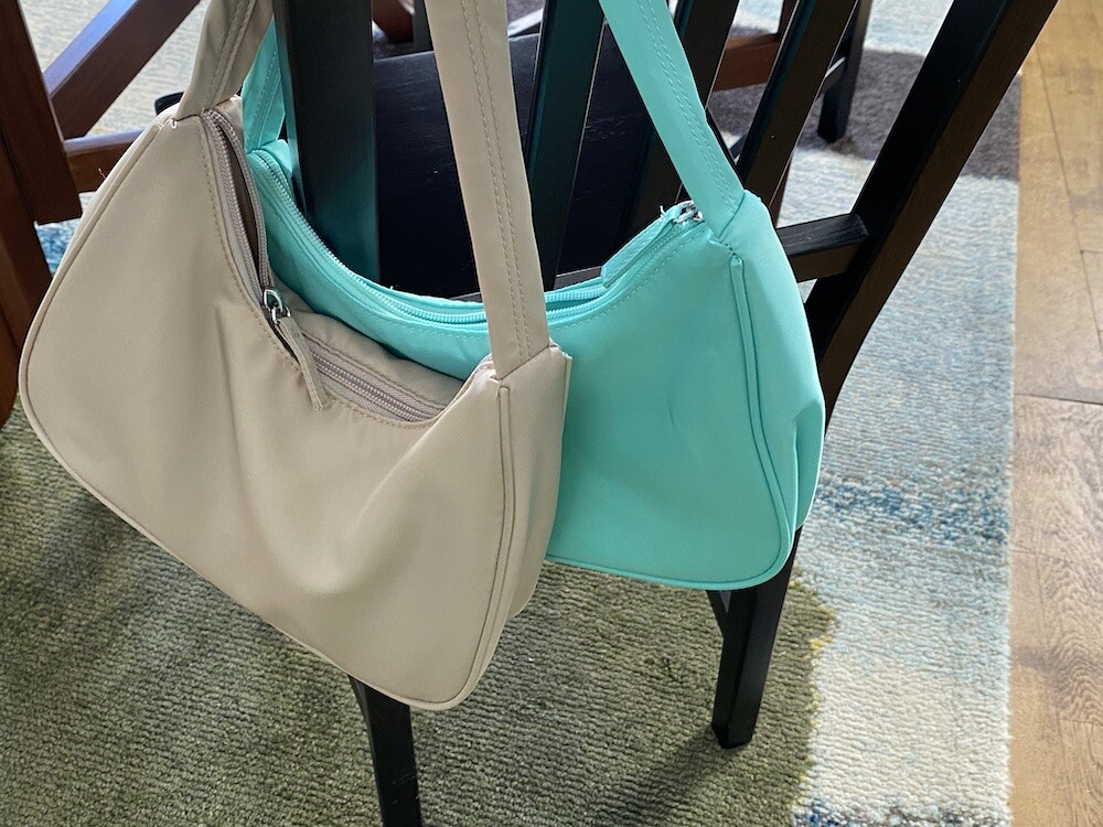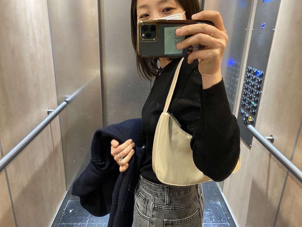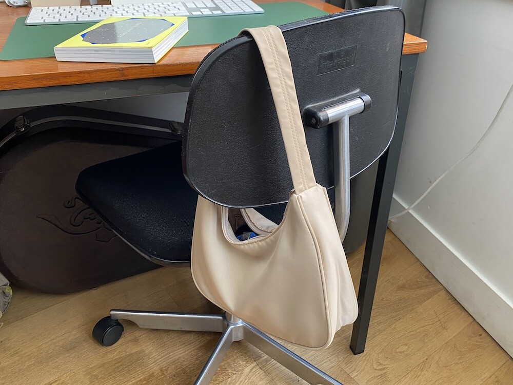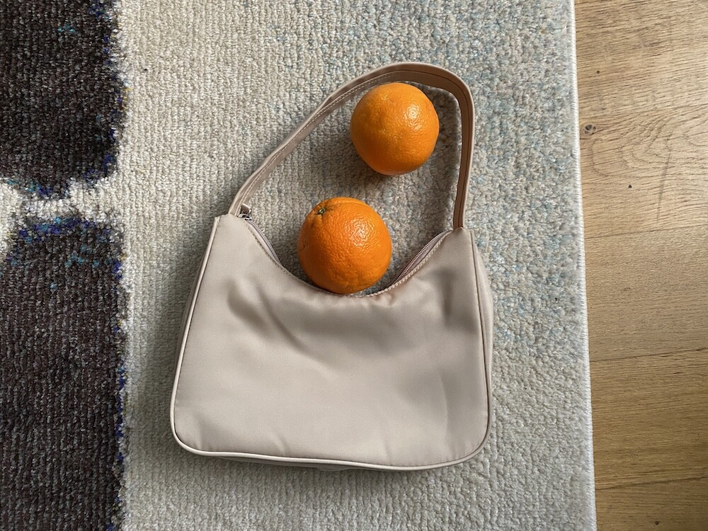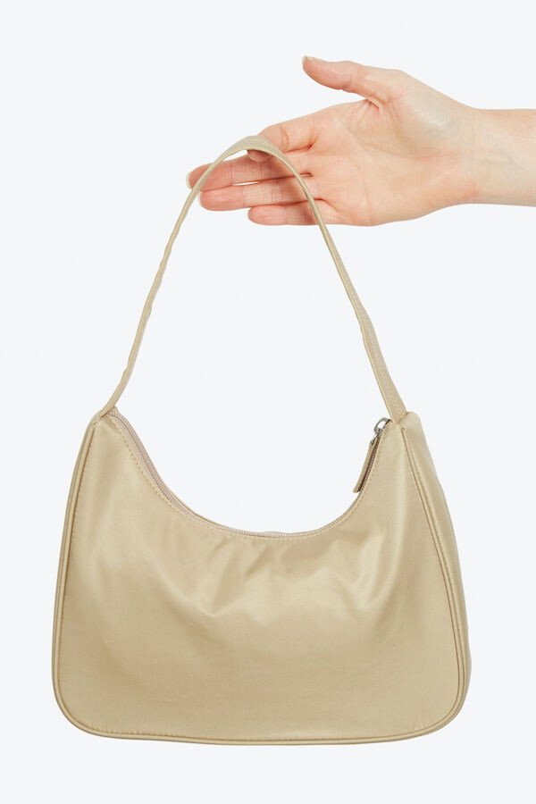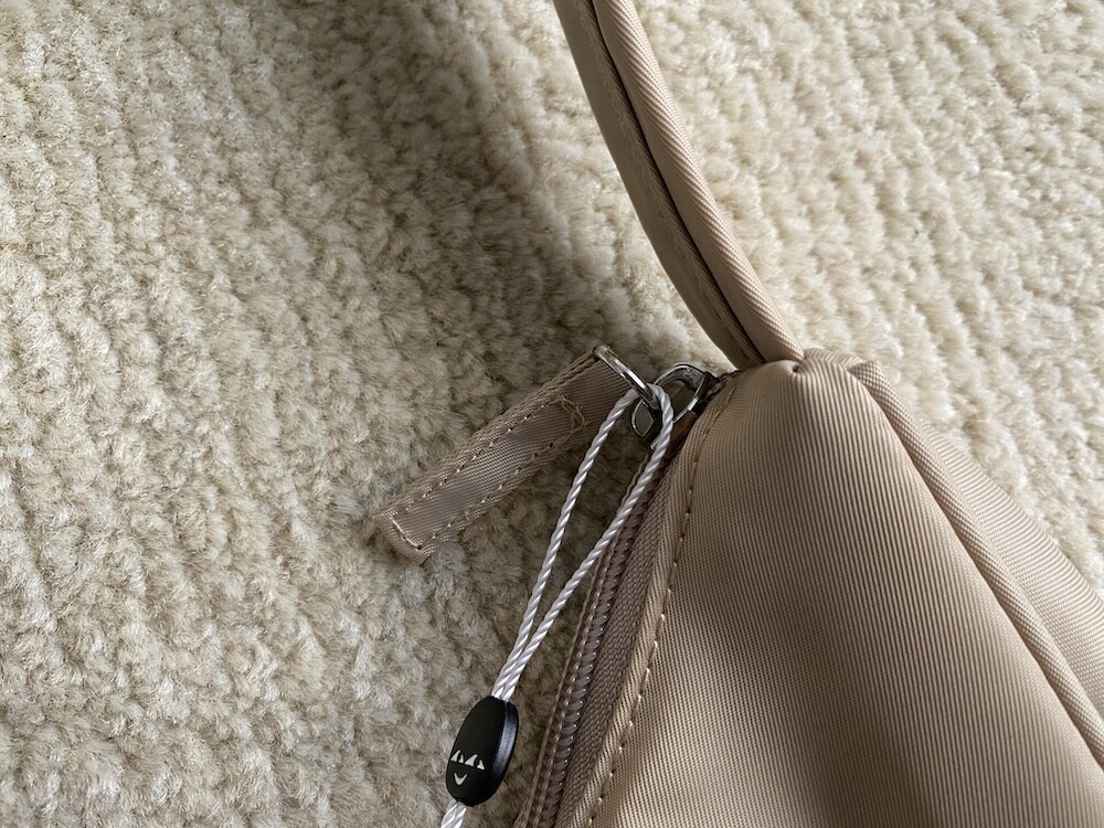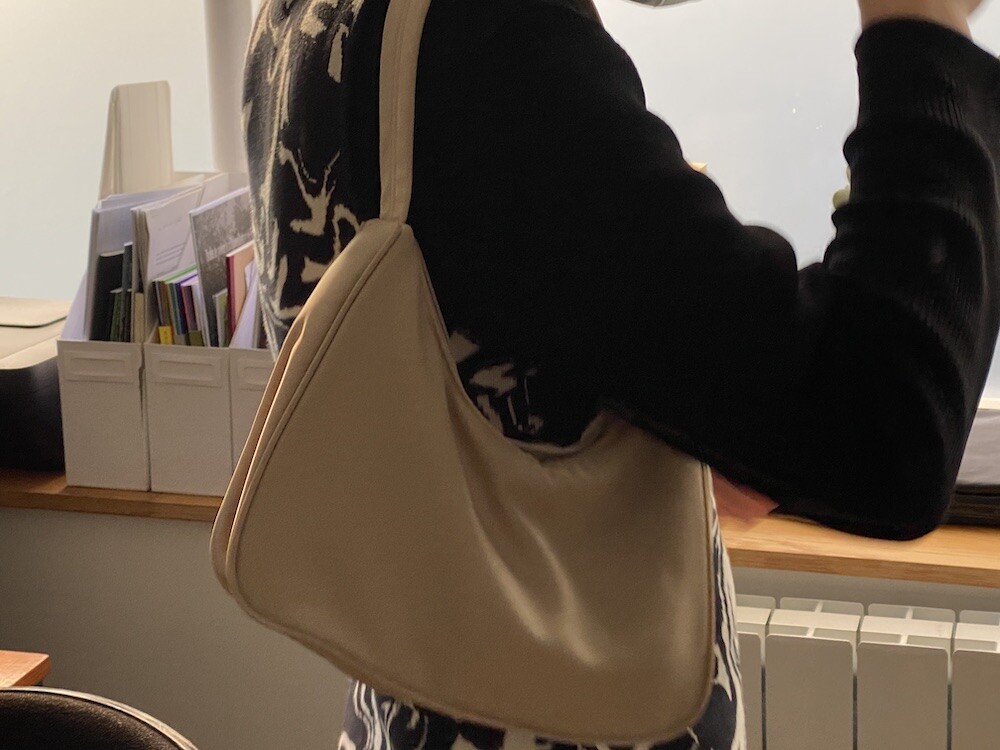 베이지색의 숄더백이에요. 작은 사이즈이지만 두께가 있어서 핸드폰, 장지갑 같은 것들이 충분히 들어가요. 안쪽에는 작은 속주머니가 있어서 카드 같은 것들은 따로 넣어 실용적이고 깔끔하게 들고 다니실 수 있어요. 채도가 낮은 베이지색이라 어떤 옷에나 잘 어울리고, 리사이클 폴리 소재라 일반 폴리에스테르보다 환경을 조금 더 생각한 제품이에요.