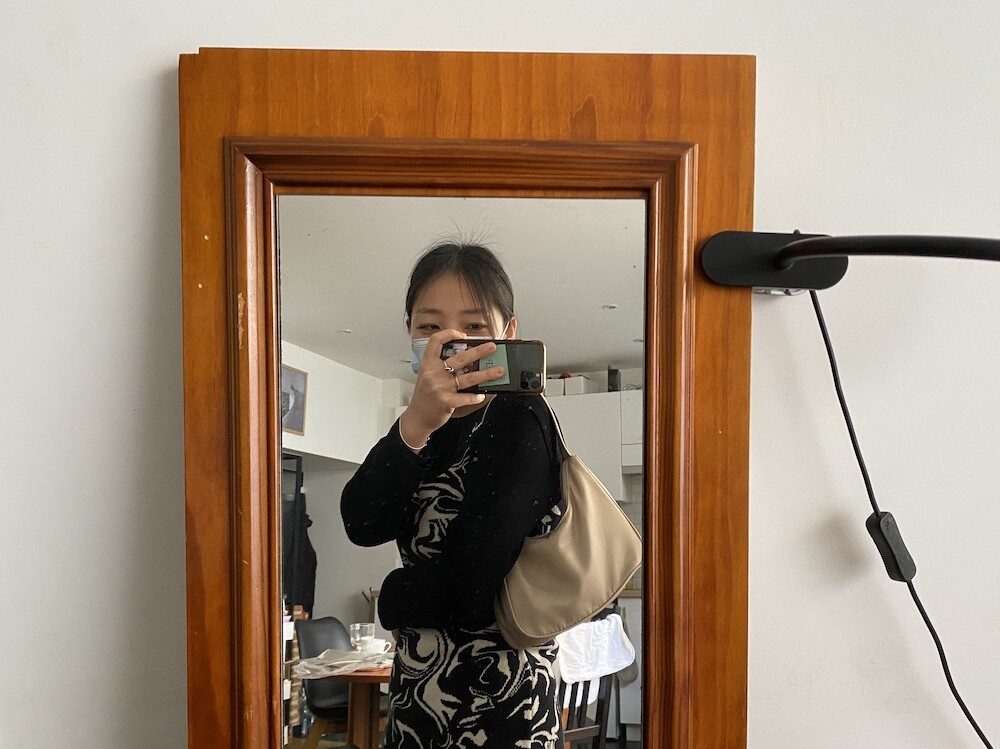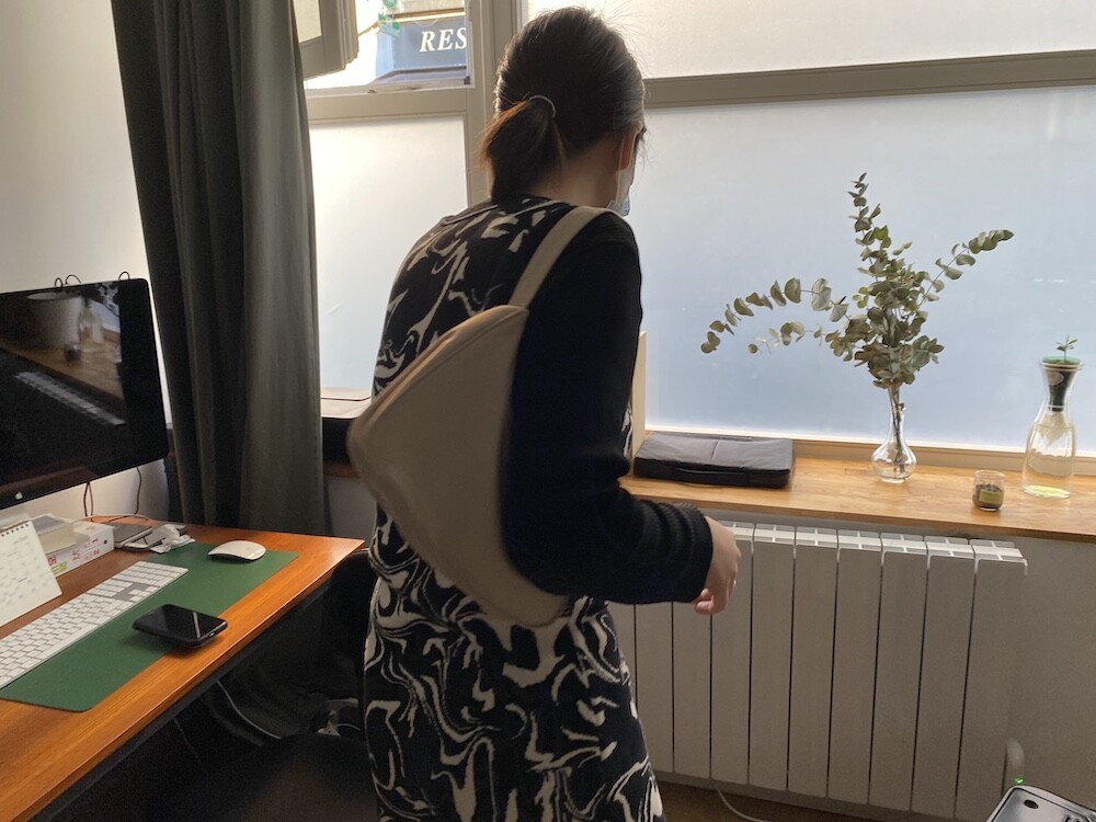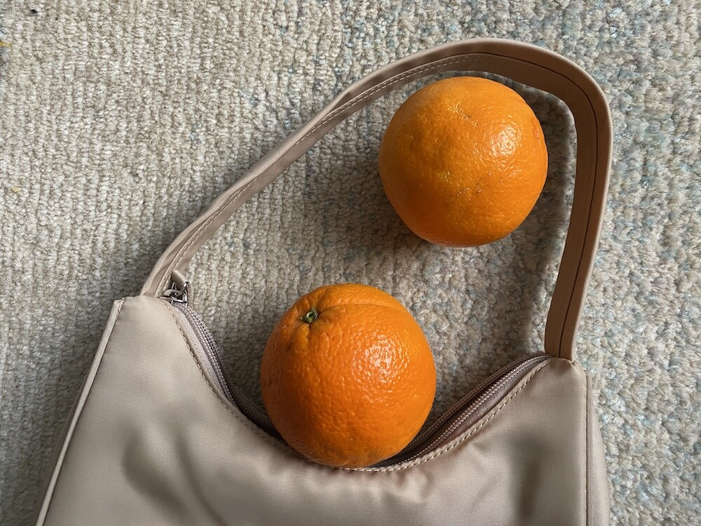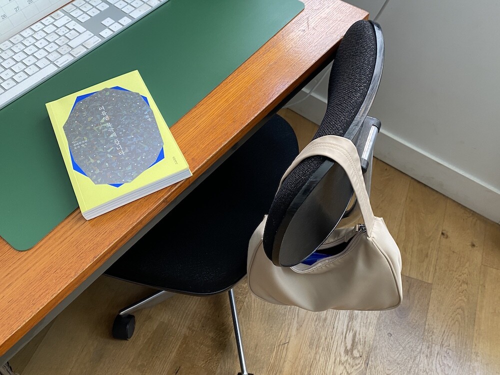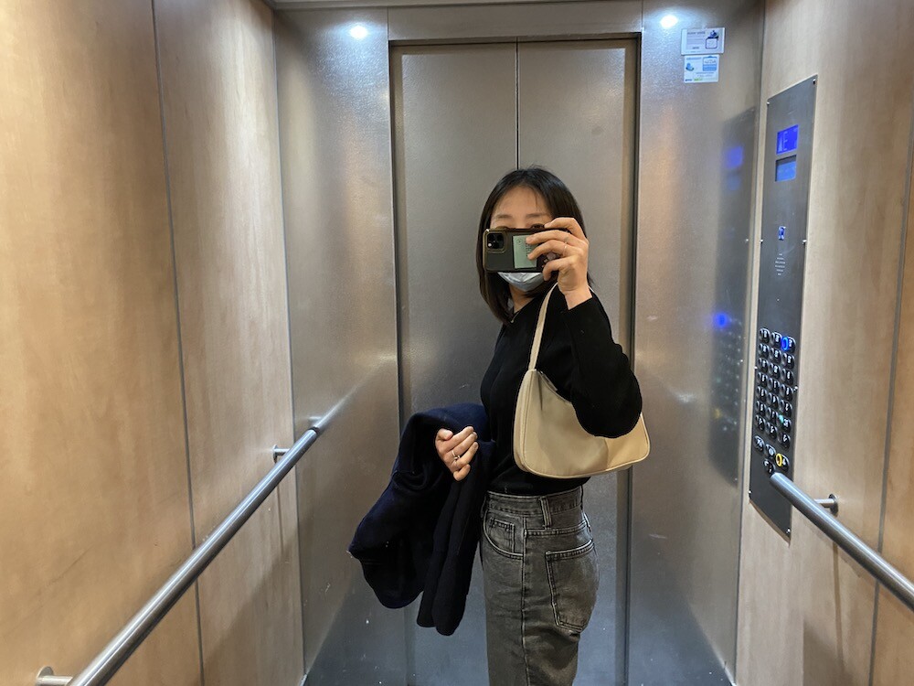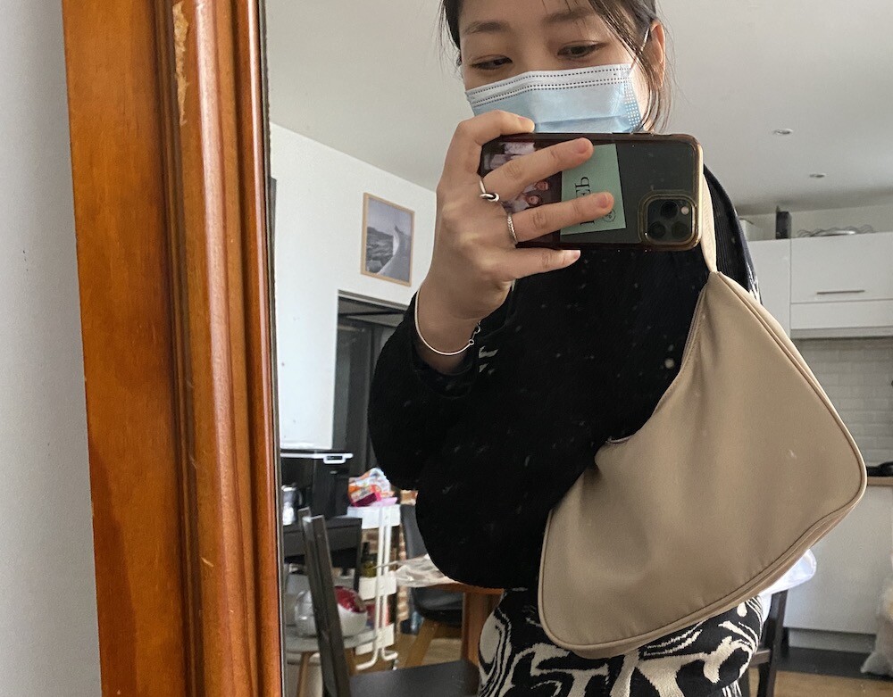 베이지색의 숄더백이에요. 작은 사이즈이지만 두께가 있어서 핸드폰, 장지갑 같은 것들이 충분히 들어가요. 안쪽에는 작은 속주머니가 있어서 카드 같은 것들은 따로 넣어 실용적이고 깔끔하게 들고 다니실 수 있어요. 채도가 낮은 베이지색이라 어떤 옷에나 잘 어울리고, 리사이클 폴리 소재라 일반 폴리에스테르보다 환경을 조금 더 생각한 제품이에요.