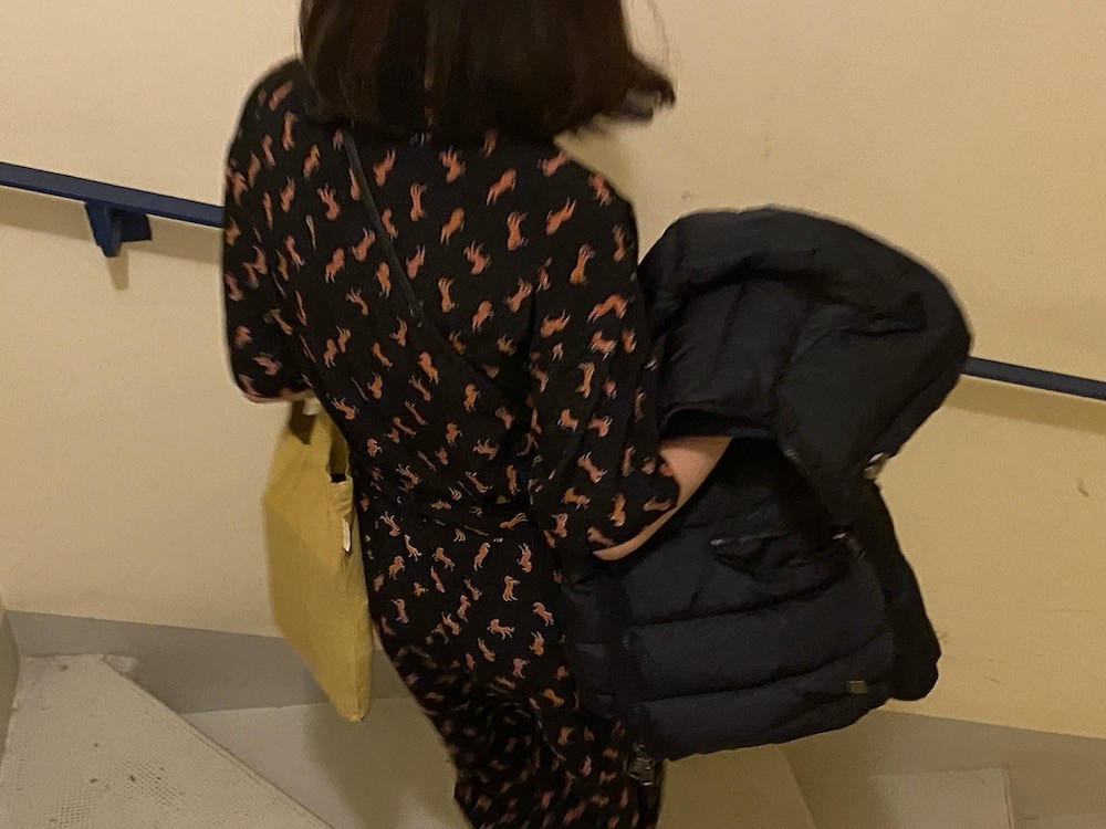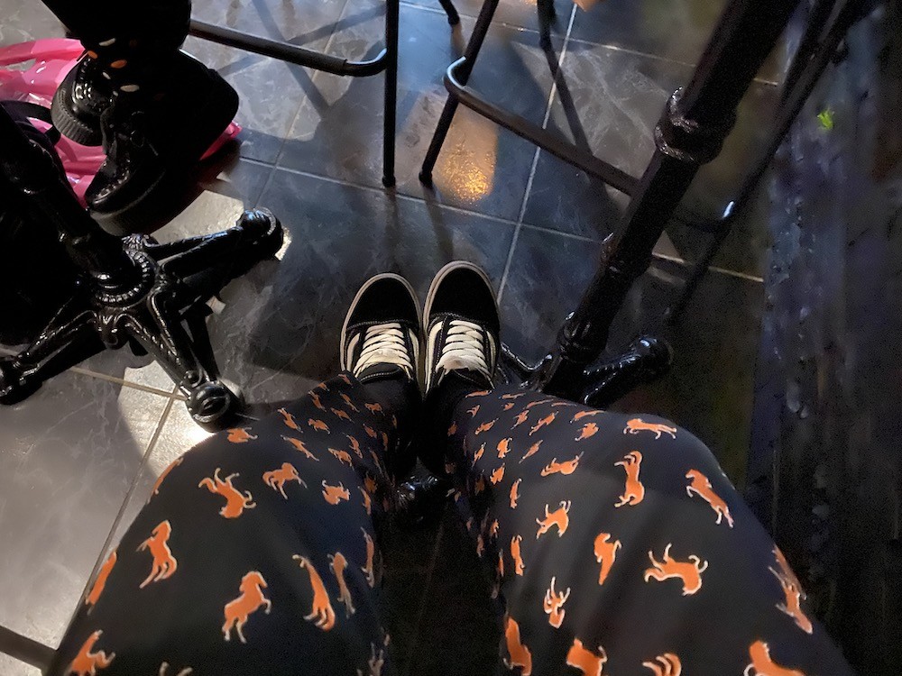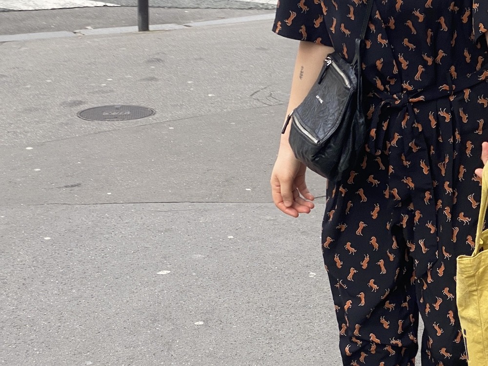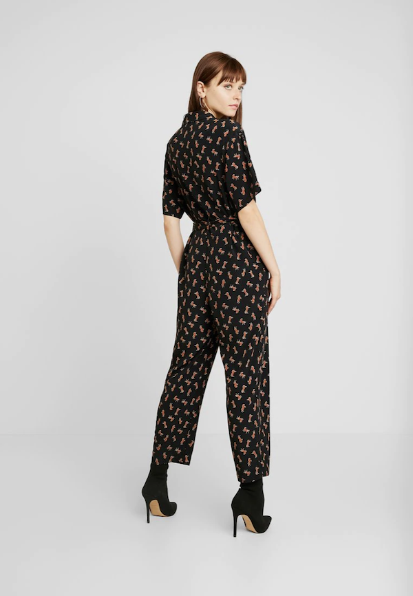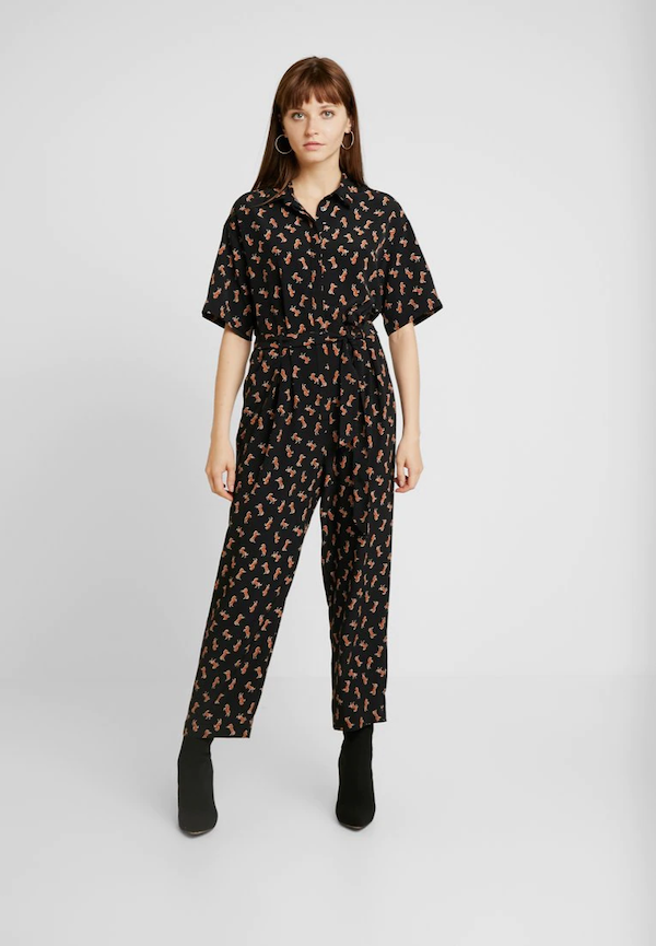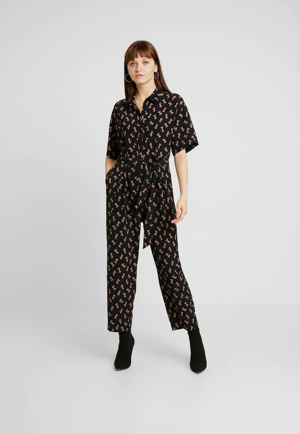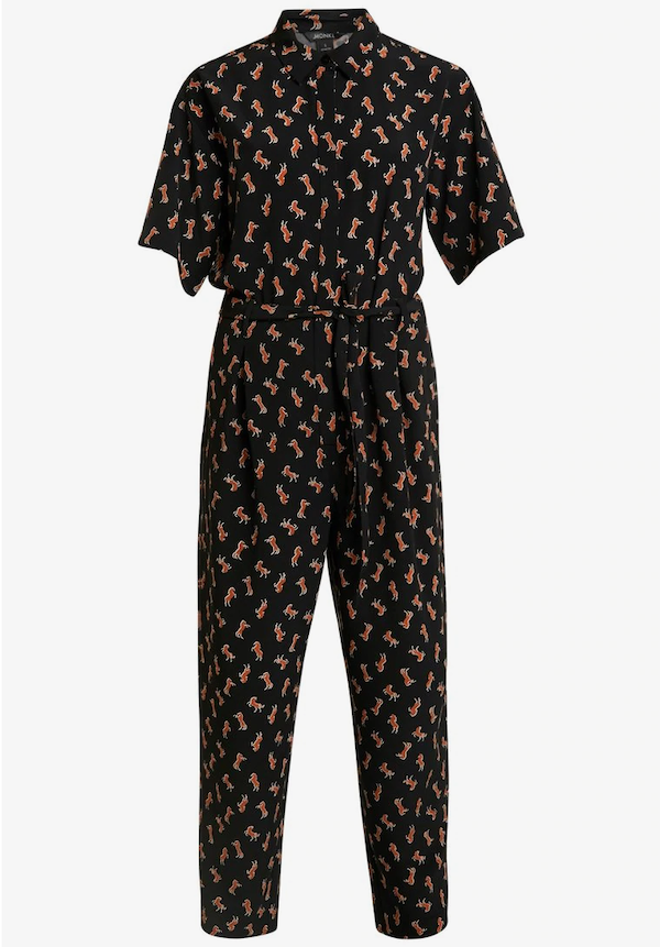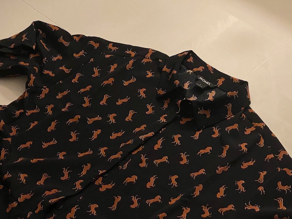 이 점프수트는 몽키 제품답게 우선 패턴이 예뻐요. 검정색 바탕에 주황색 말이 쭈주룩 프린트되어 있는데 색이 대조적인데 비해 부담스럽게 튀지 않아요. 게다가 소재에 두께감이 있어서 몸매가 확 드러나지 않으면서도 힘있게 실루엣을 잘 잡아줘요. 반팔이라 경쾌한 느낌도 나고요!