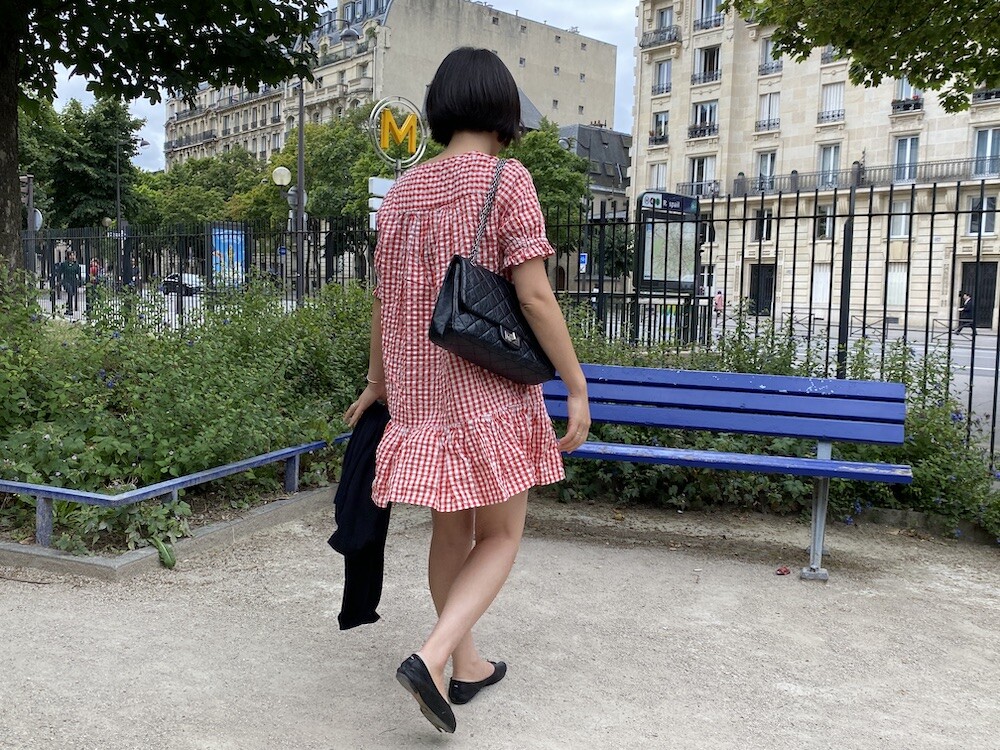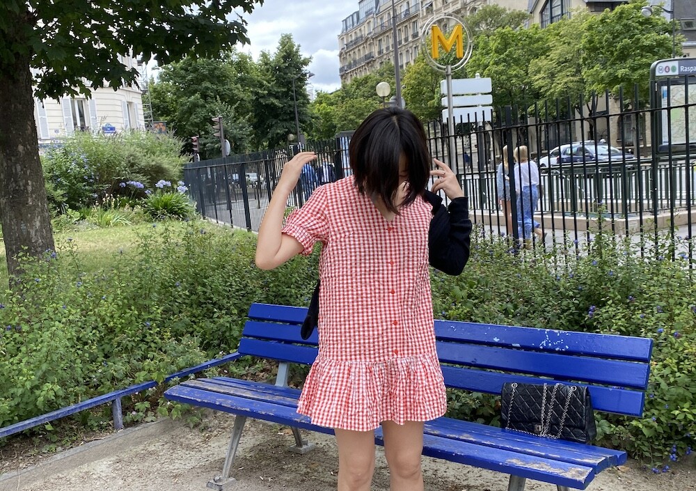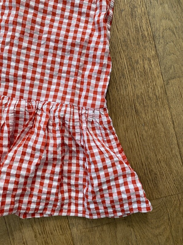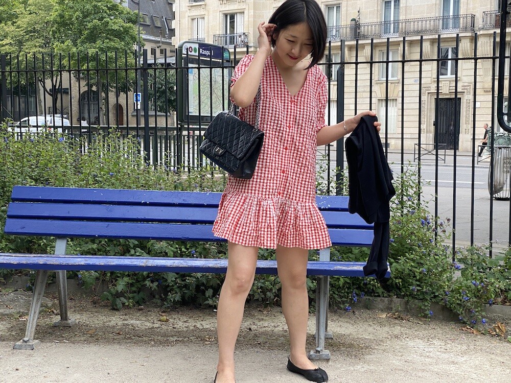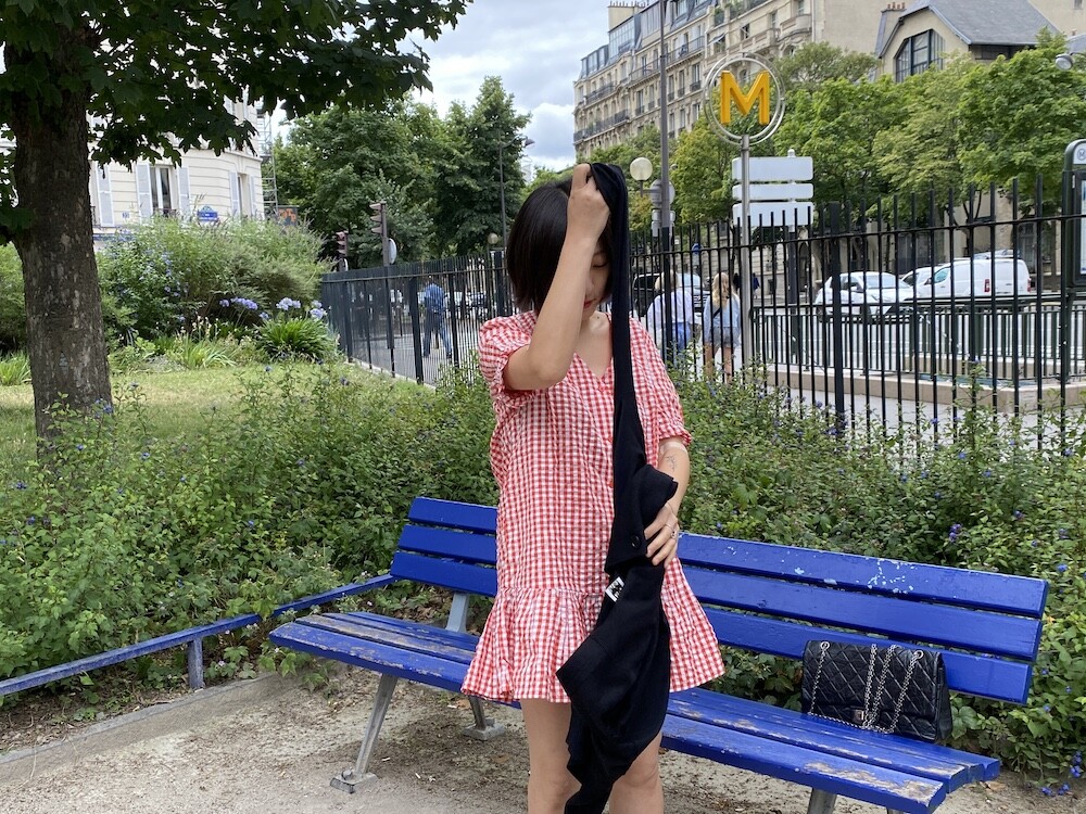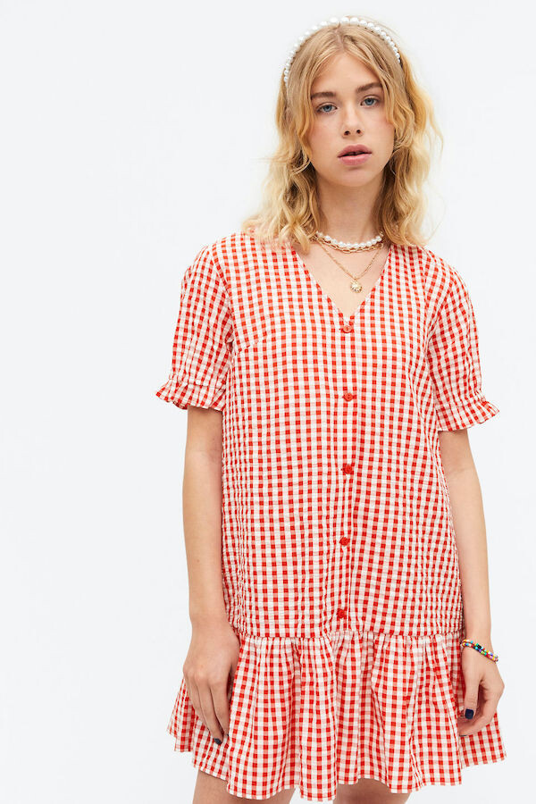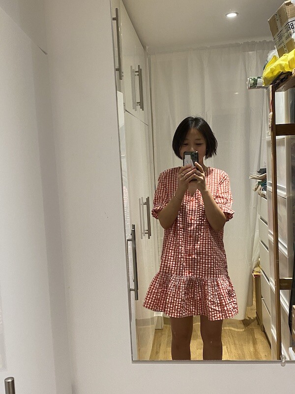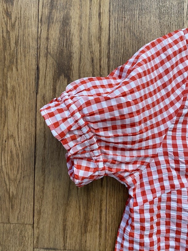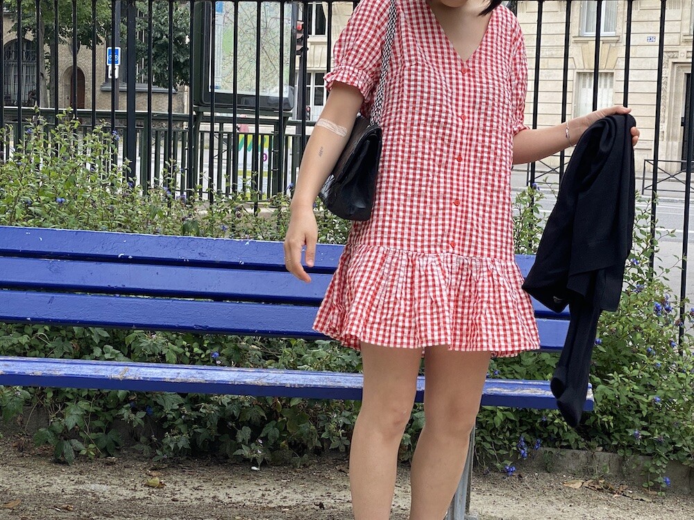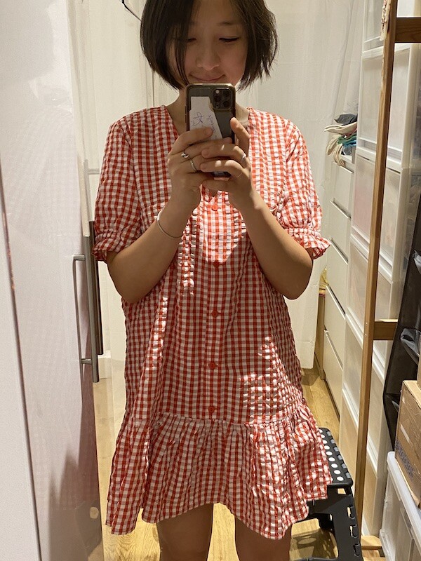 빨간색의 깅엄 체크 원단이 상큼한 미니 드레스예요. 시어서커 Seersucker 원단은 원단 직조시에 수축 정도가 다른 원사를 사용하기 때문에 소재가 평평하지 않고 지글지글한 직조감이 드러나는 소재를 말하는데요. 이 원단으로 옷을 만들면 몸에 잘 들러붙지 않기 때문에 여름용 원단으로 많이 쓰여요. 보통 시어서커 원단은 면으로 많이 직조되지만 이 원피스는 폴리에스테르로 짜여졌기 때문에 더욱 시원한 느낌이 듭니다.