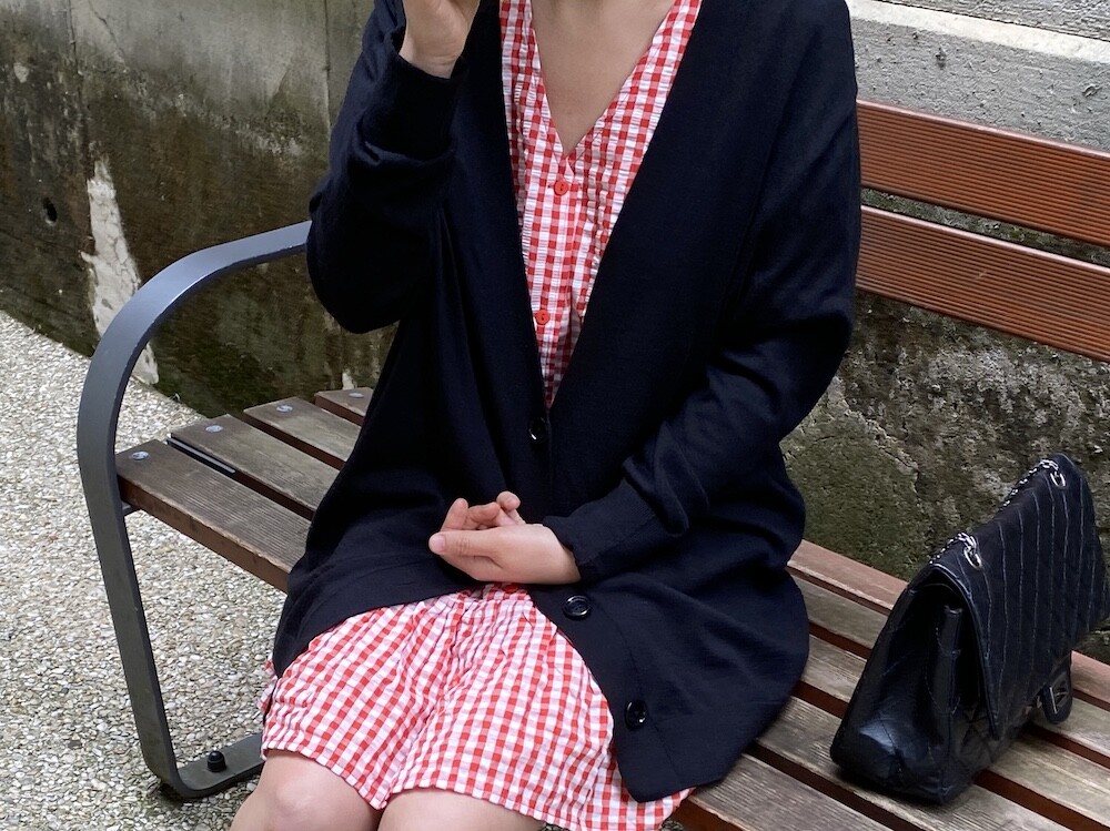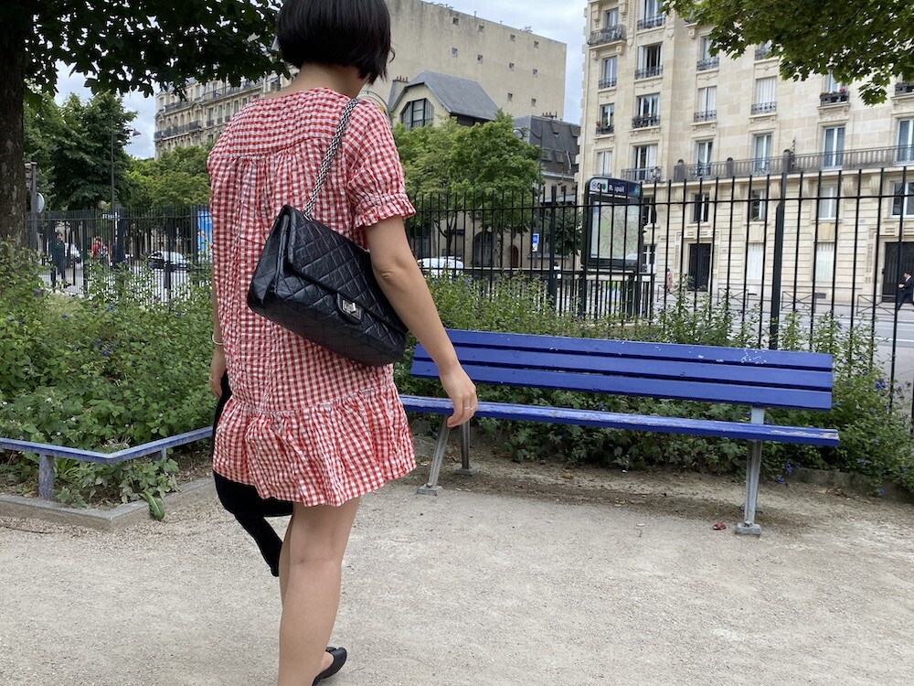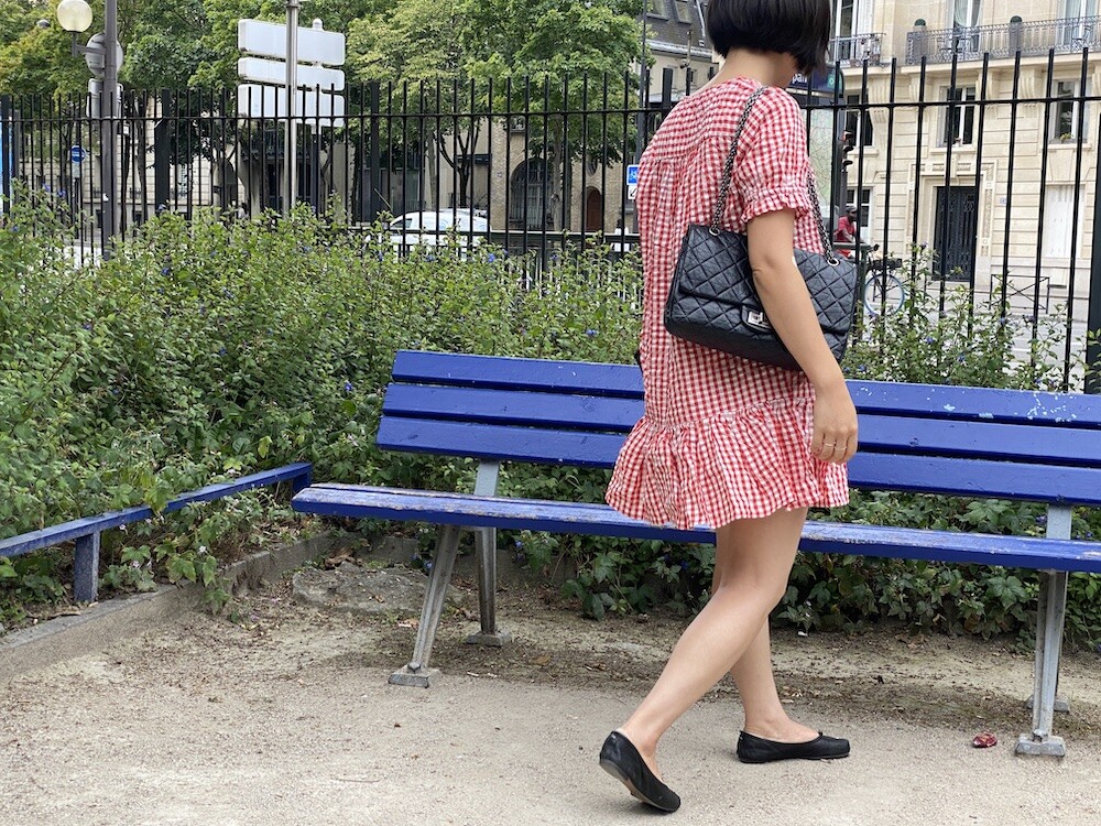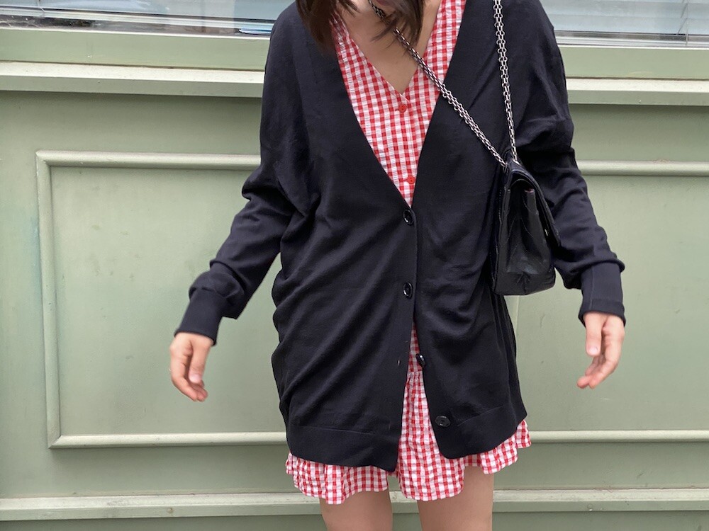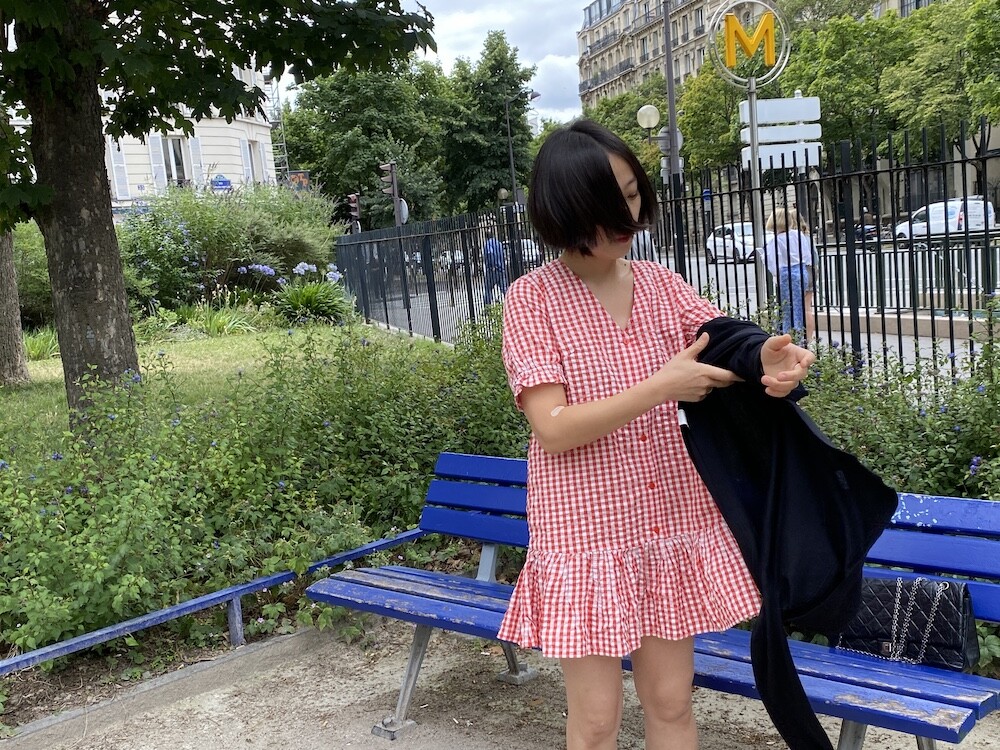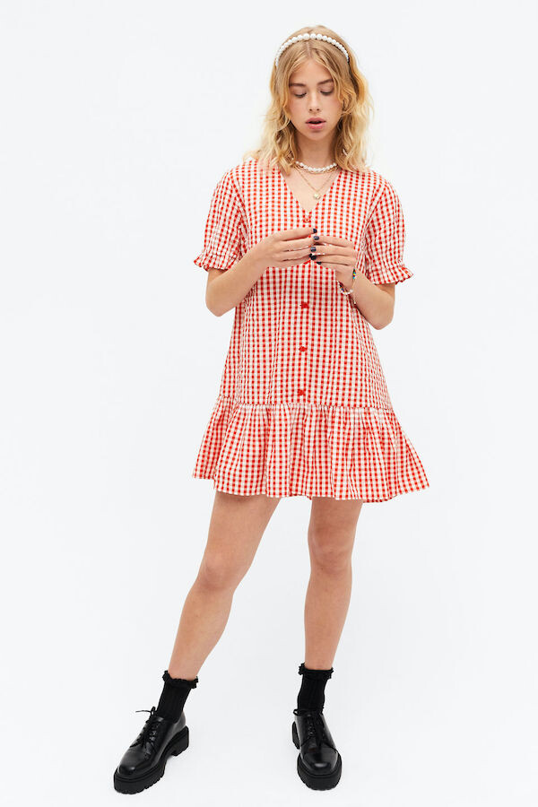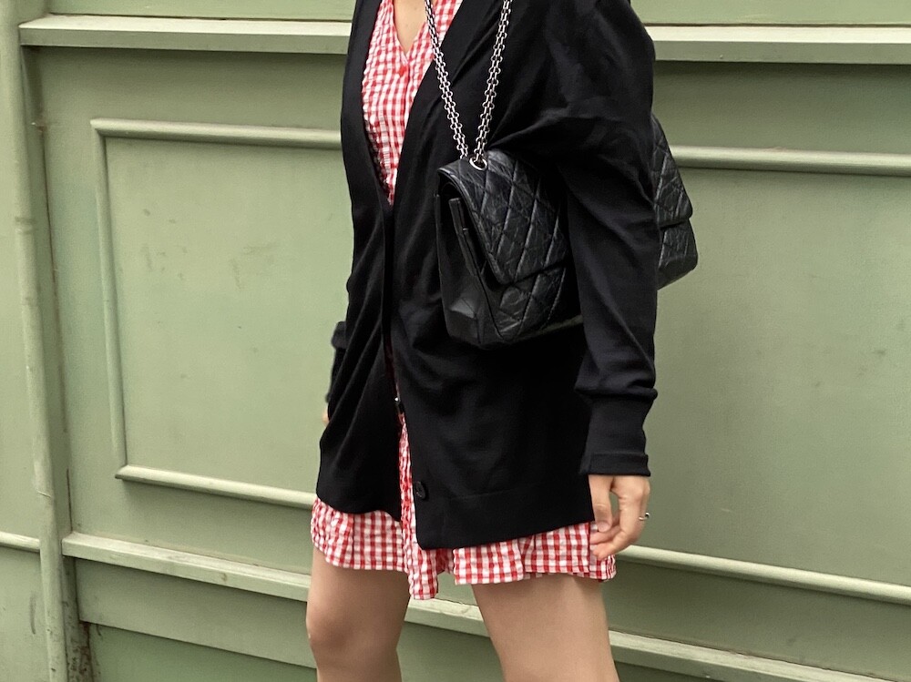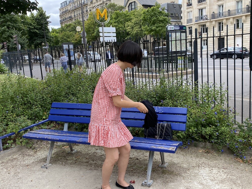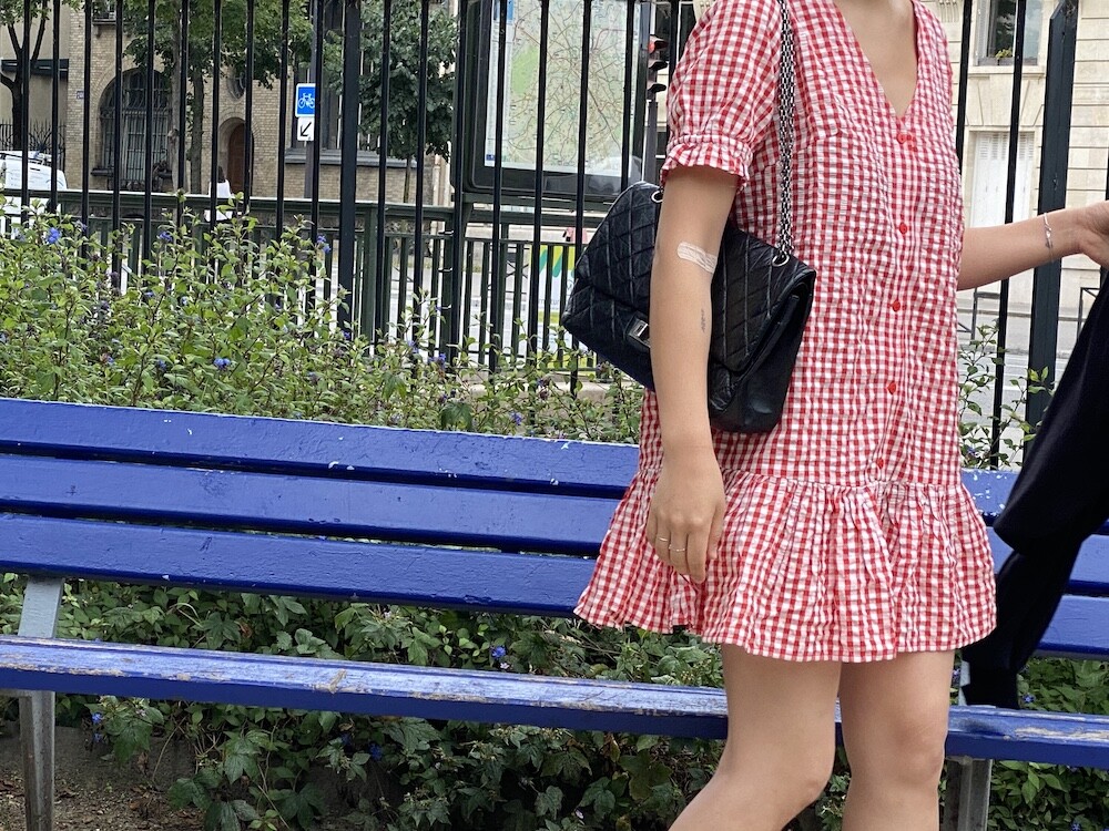 빨간색의 깅엄 체크 원단이 상큼한 미니 드레스예요. 시어서커 Seersucker 원단은 원단 직조시에 수축 정도가 다른 원사를 사용하기 때문에 소재가 평평하지 않고 지글지글한 직조감이 드러나는 소재를 말하는데요. 이 원단으로 옷을 만들면 몸에 잘 들러붙지 않기 때문에 여름용 원단으로 많이 쓰여요. 보통 시어서커 원단은 면으로 많이 직조되지만 이 원피스는 폴리에스테르로 짜여졌기 때문에 더욱 시원한 느낌이 듭니다.