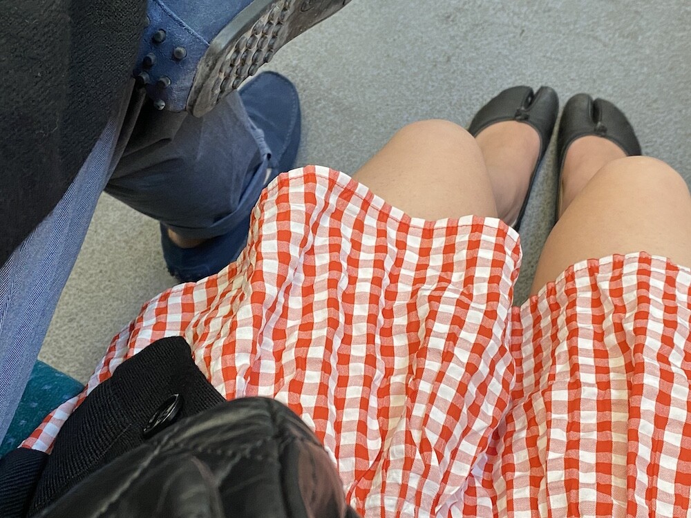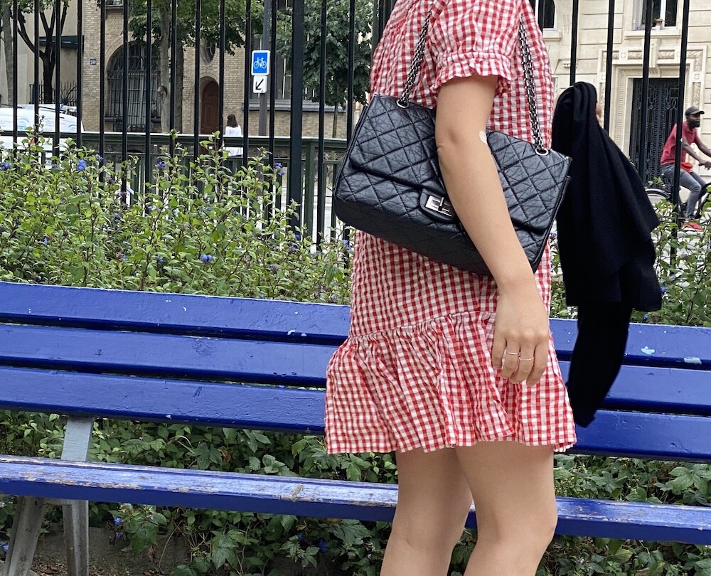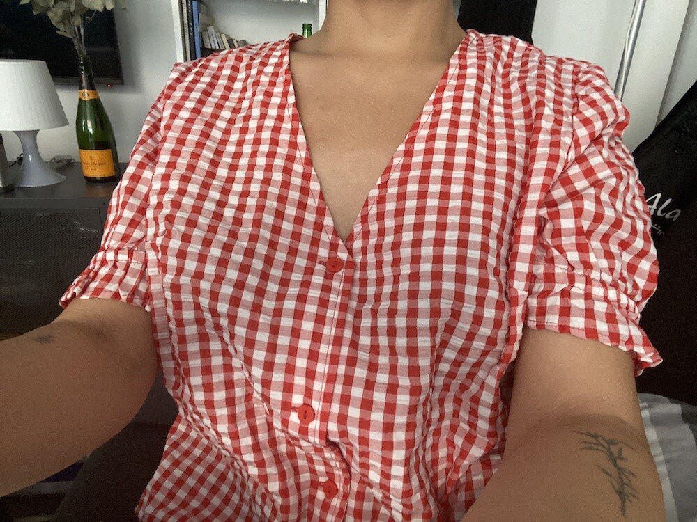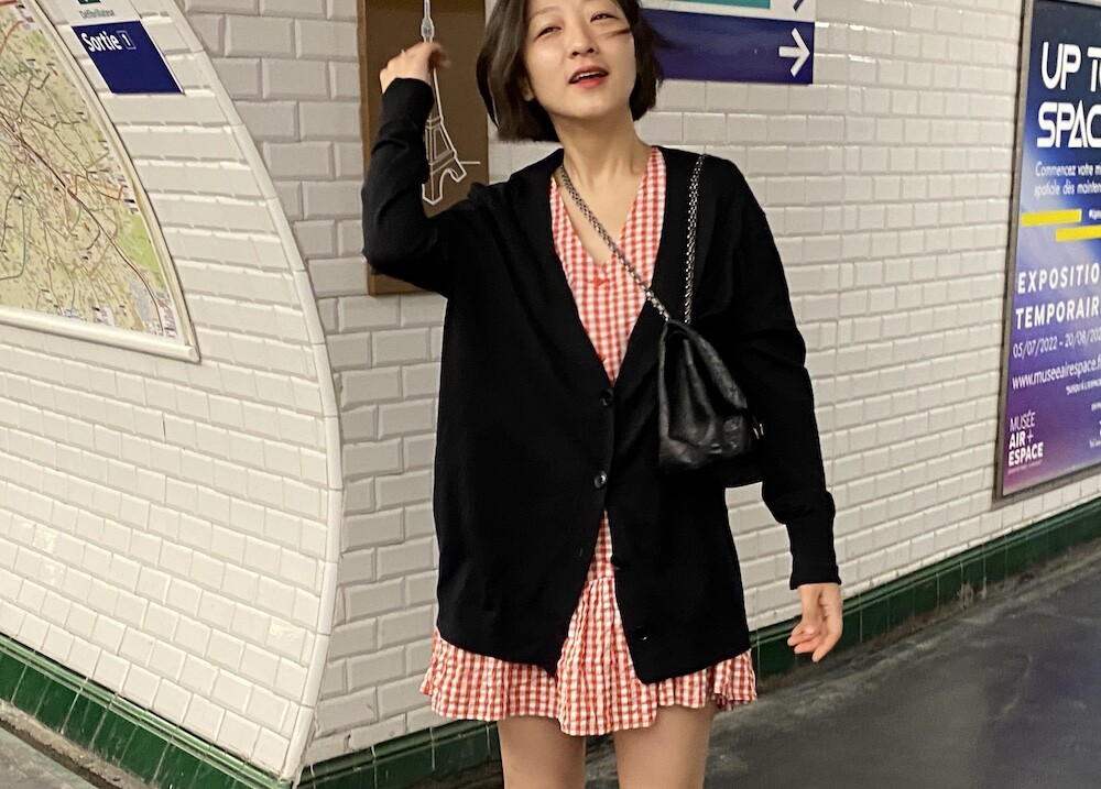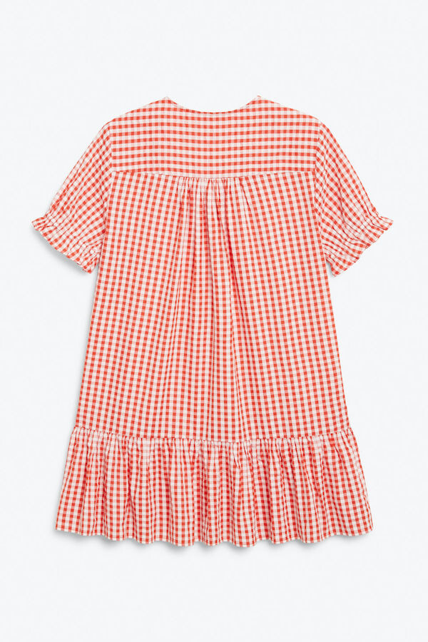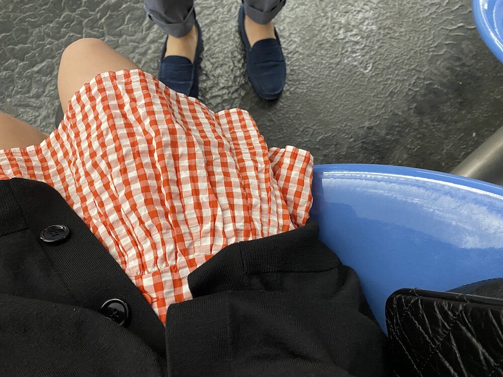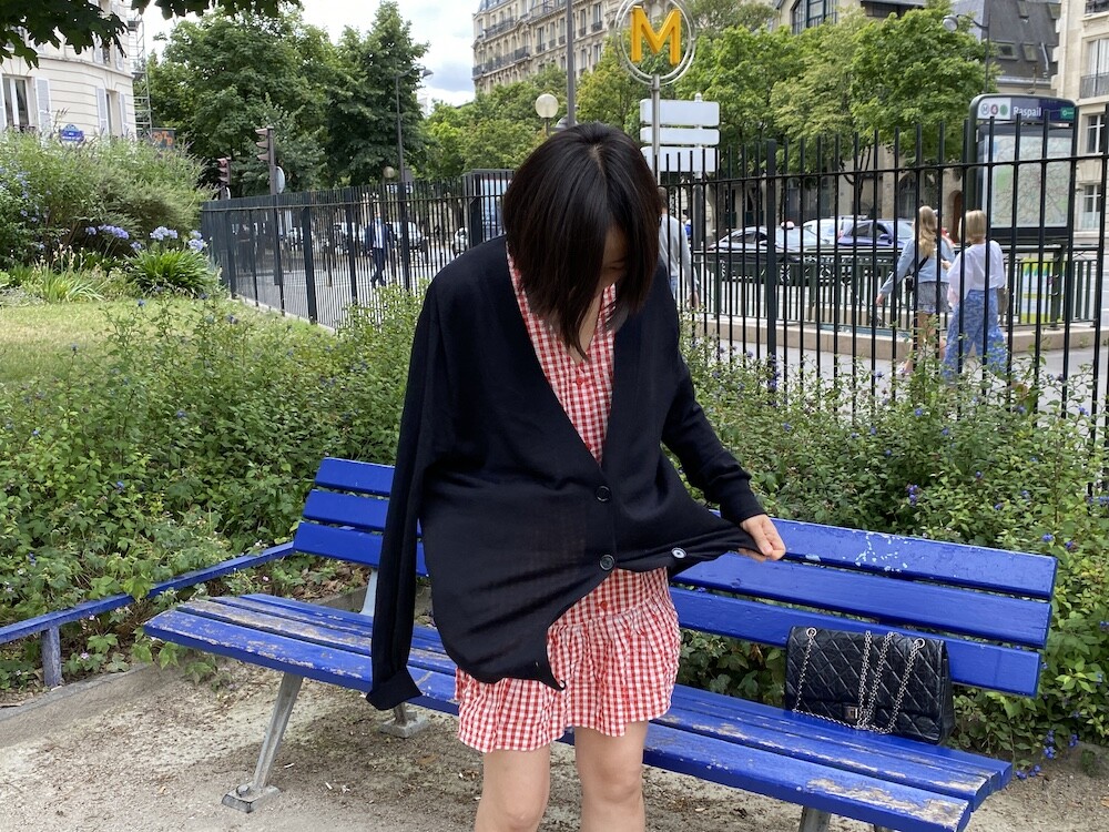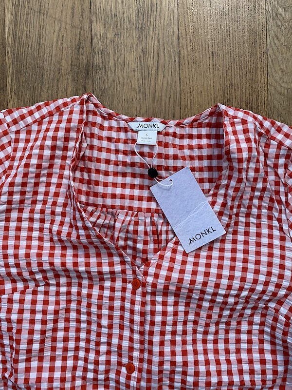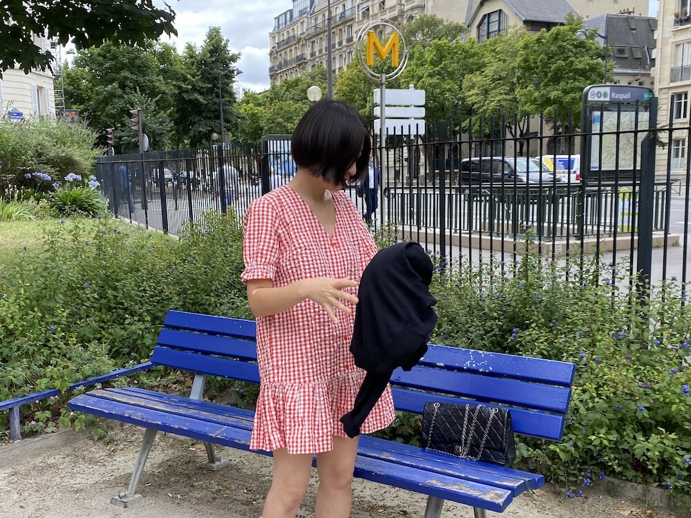 빨간색의 깅엄 체크 원단이 상큼한 미니 드레스예요. 시어서커 Seersucker 원단은 원단 직조시에 수축 정도가 다른 원사를 사용하기 때문에 소재가 평평하지 않고 지글지글한 직조감이 드러나는 소재를 말하는데요. 이 원단으로 옷을 만들면 몸에 잘 들러붙지 않기 때문에 여름용 원단으로 많이 쓰여요. 보통 시어서커 원단은 면으로 많이 직조되지만 이 원피스는 폴리에스테르로 짜여졌기 때문에 더욱 시원한 느낌이 듭니다.