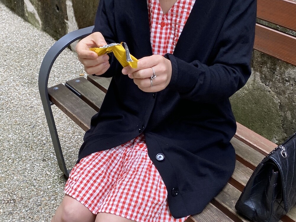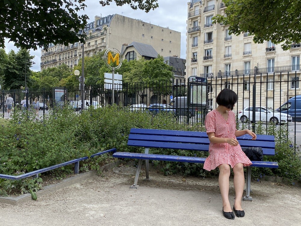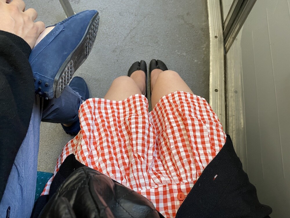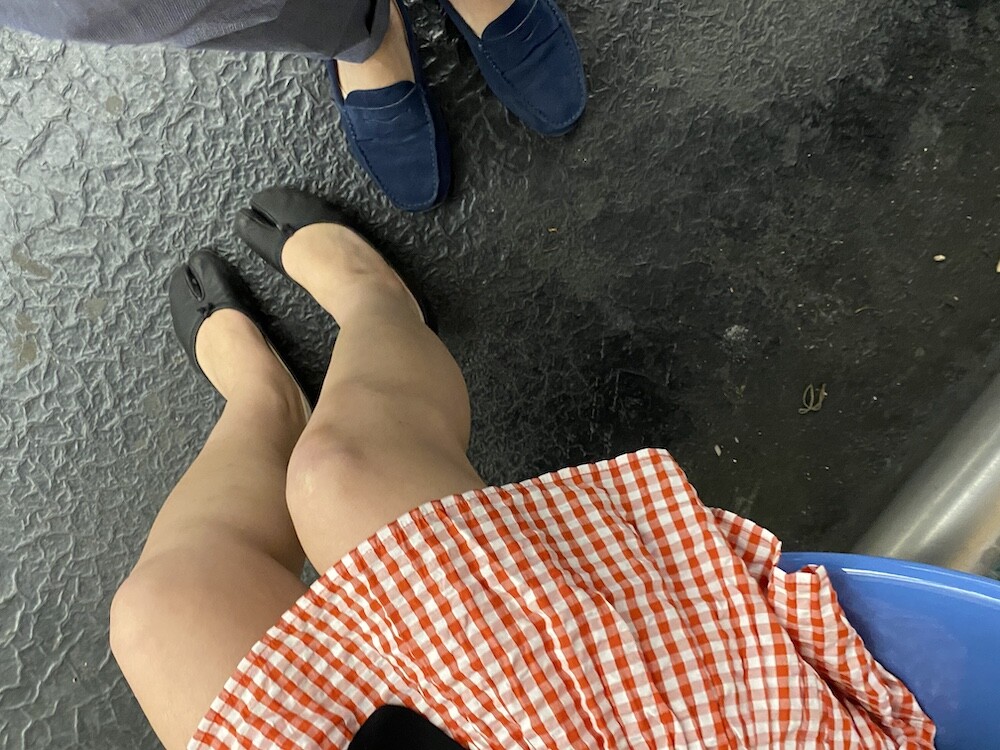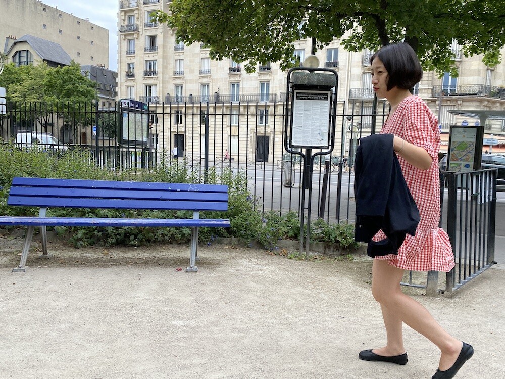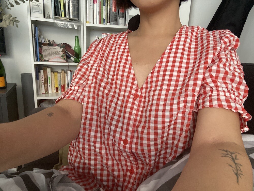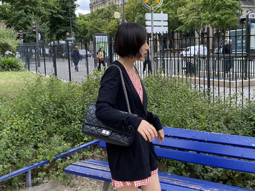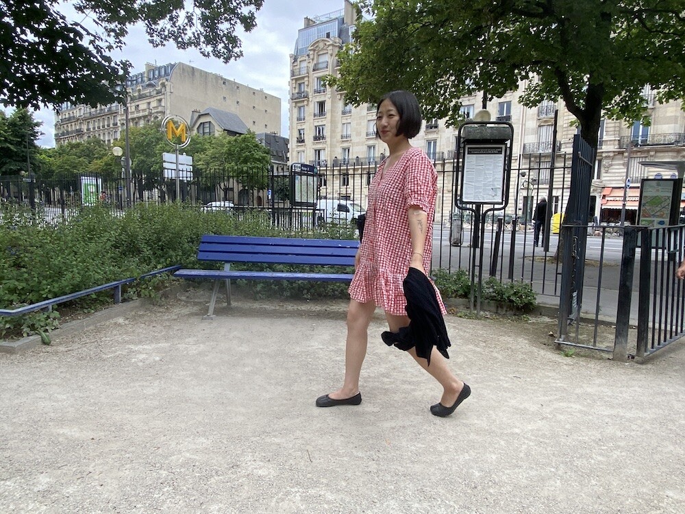 빨간색의 깅엄 체크 원단이 상큼한 미니 드레스예요. 시어서커 Seersucker 원단은 원단 직조시에 수축 정도가 다른 원사를 사용하기 때문에 소재가 평평하지 않고 지글지글한 직조감이 드러나는 소재를 말하는데요. 이 원단으로 옷을 만들면 몸에 잘 들러붙지 않기 때문에 여름용 원단으로 많이 쓰여요. 보통 시어서커 원단은 면으로 많이 직조되지만 이 원피스는 폴리에스테르로 짜여졌기 때문에 더욱 시원한 느낌이 듭니다.