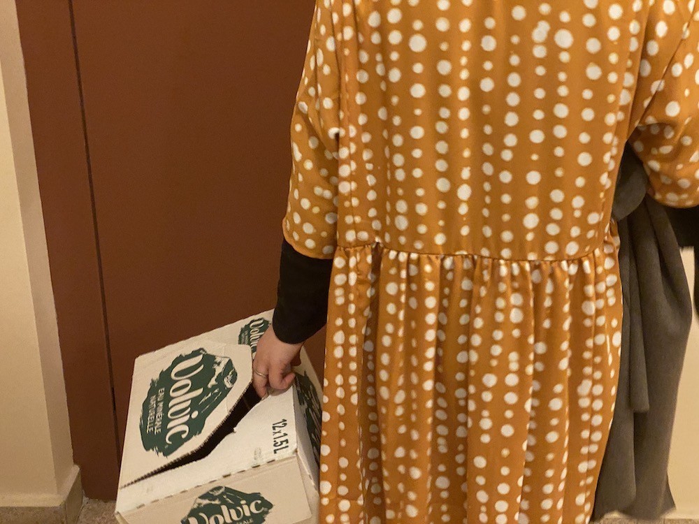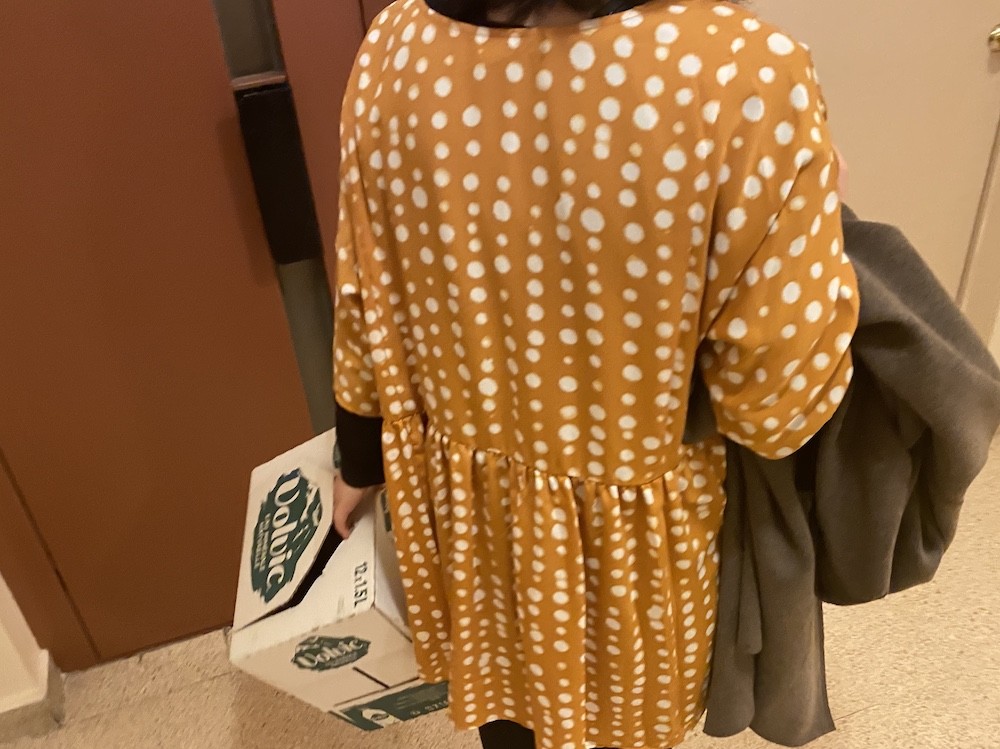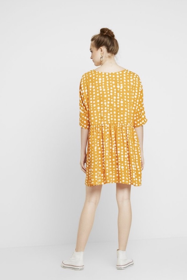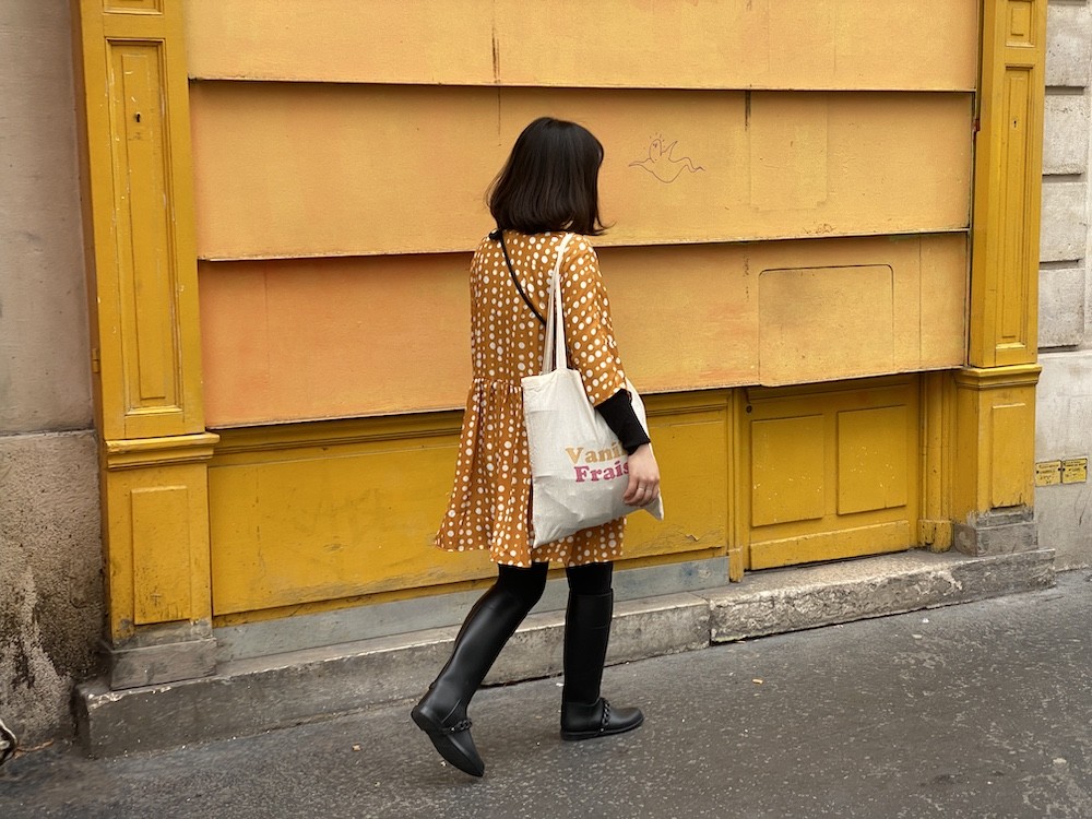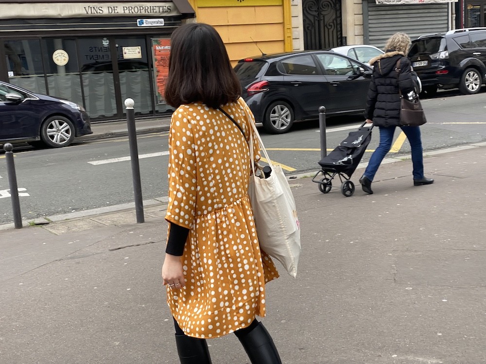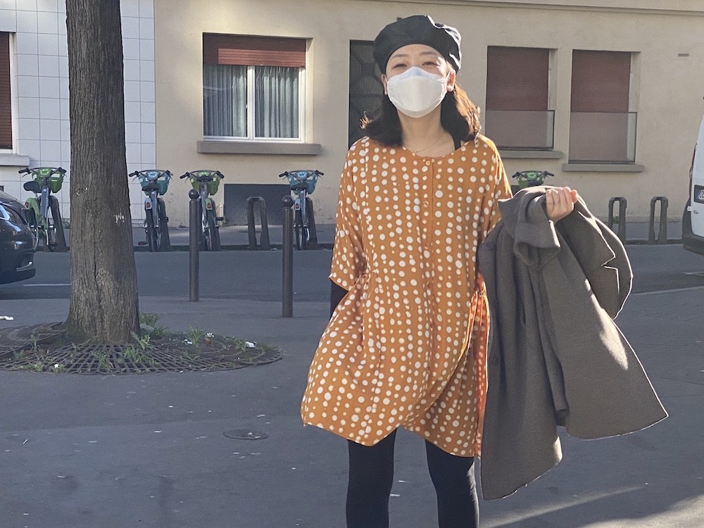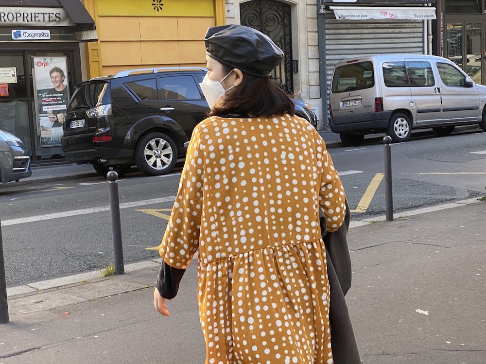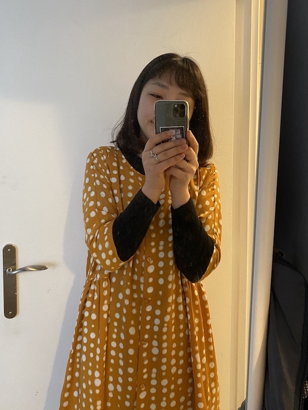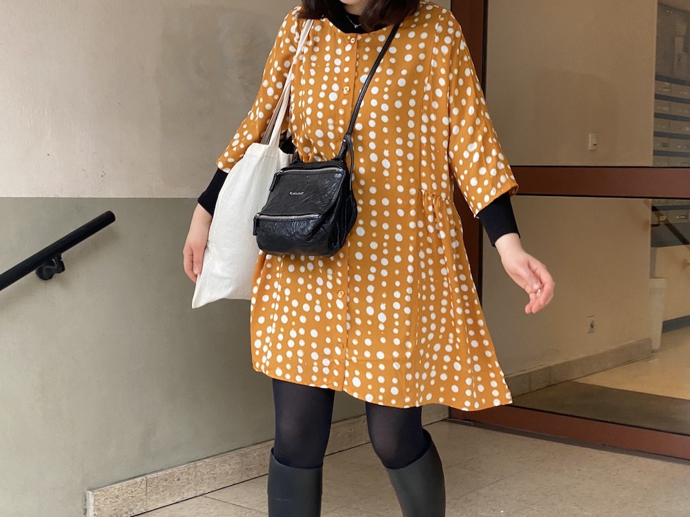 이 원피스는 수채화로 그림을 그려놓은 듯한 패턴이 예뻐요. 래글런 소매 디자인이라 활동성도 좋고요. 특히 이 브랜드는 몸에 들러붙지 않는 소재로 핏을 잘 만드는데 이 원피스도 마찬가지로 펑퍼짐한 원피스인데 입으면 몸이 날씬해 보여요. 제가 몽키를 좋아하는 이유 중 하나예요.
