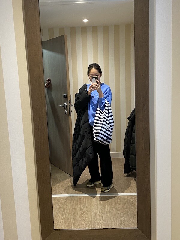 키는 161 cm 정도, 몸무게는 55 이상 60 미만입니다. (몸무게가 왔다갔다해서 정확한 무게가 몇인지 모르겠어요.)