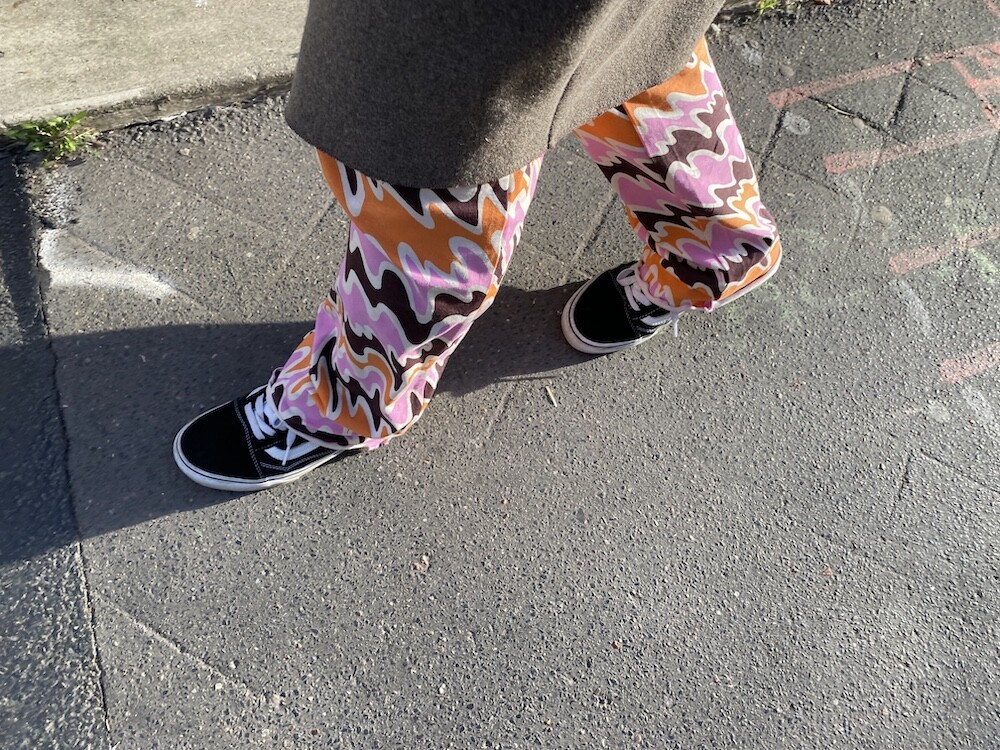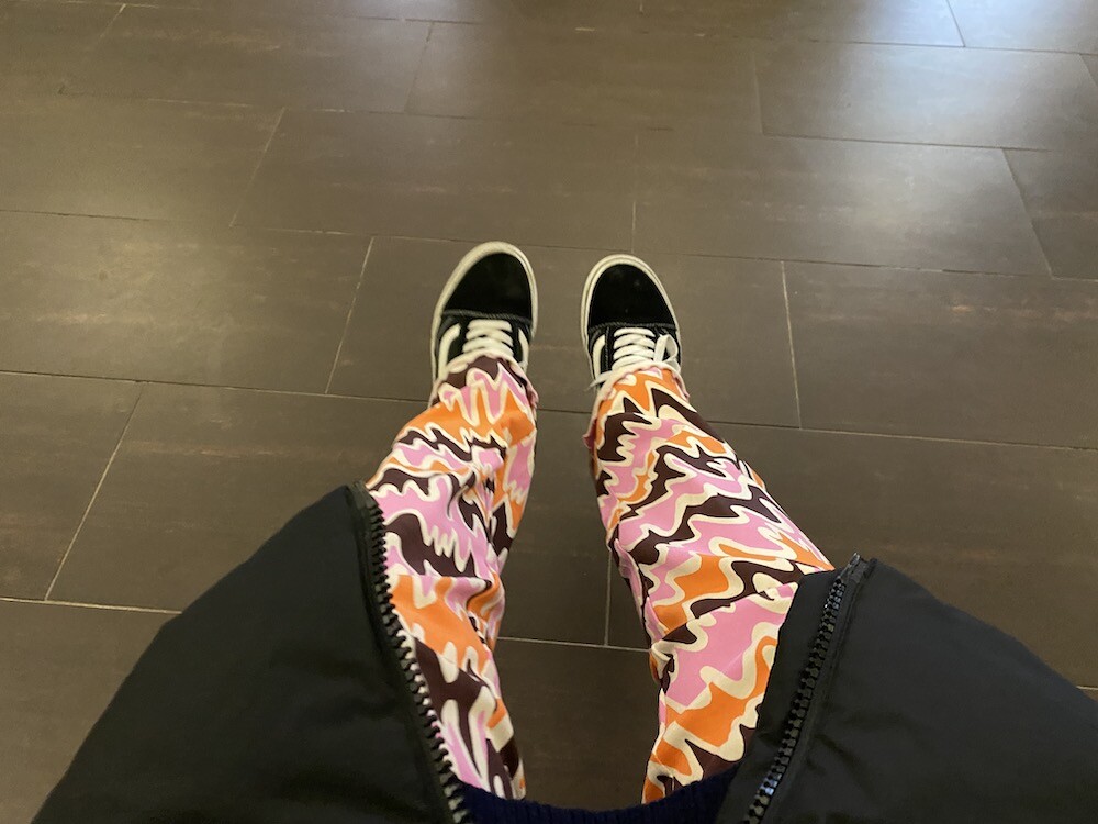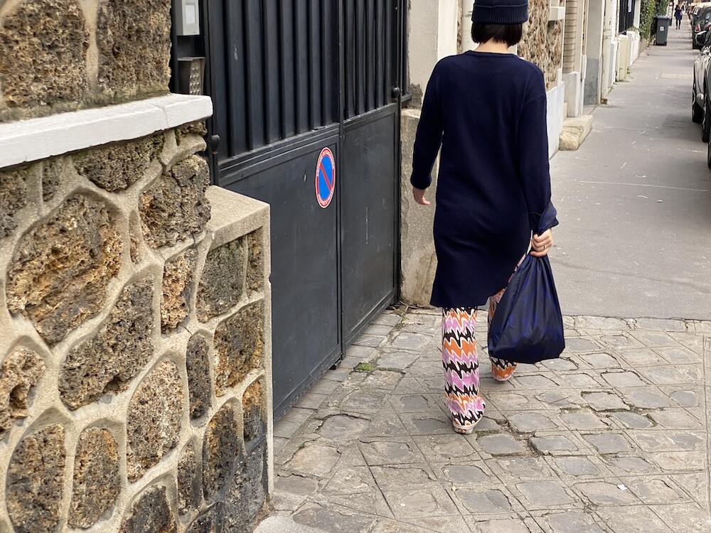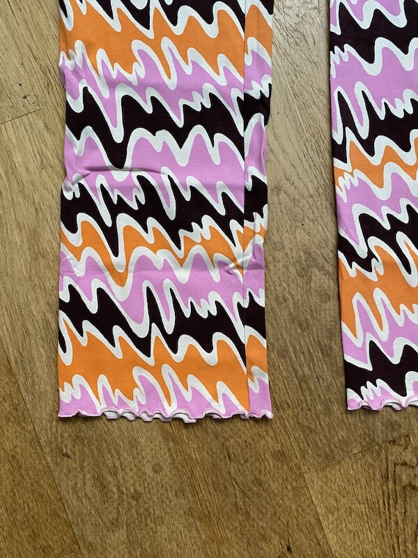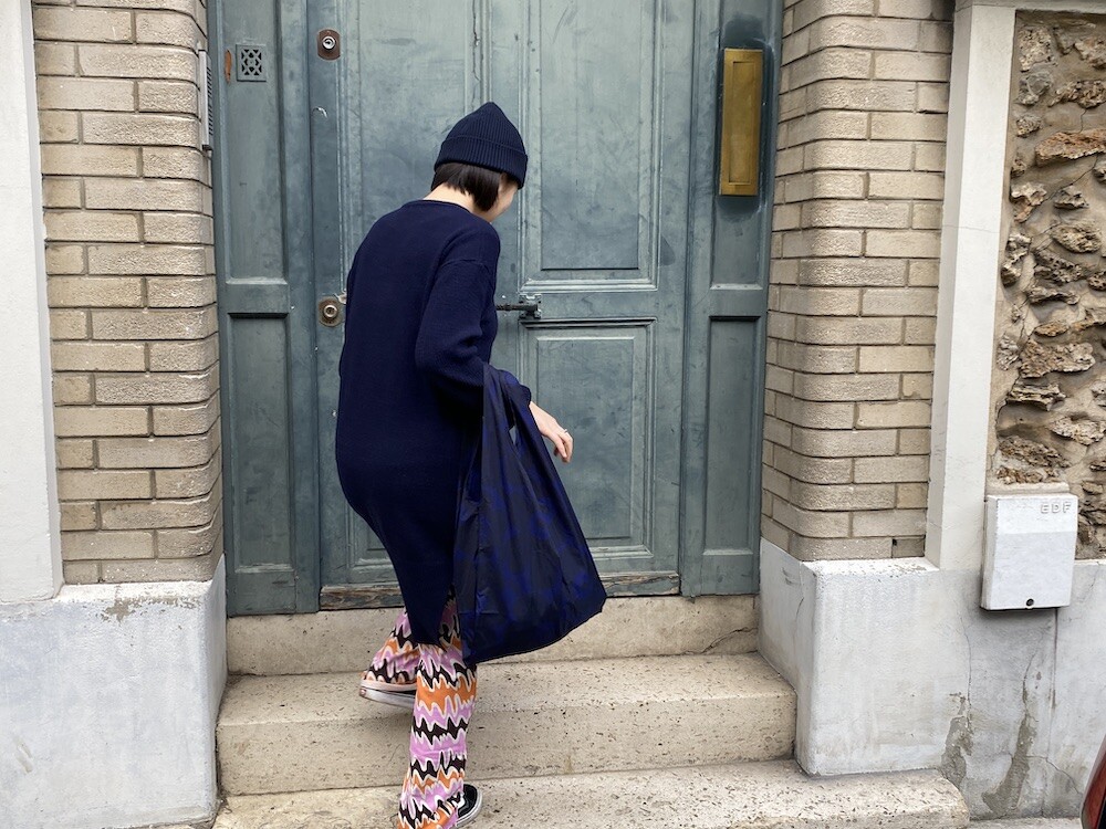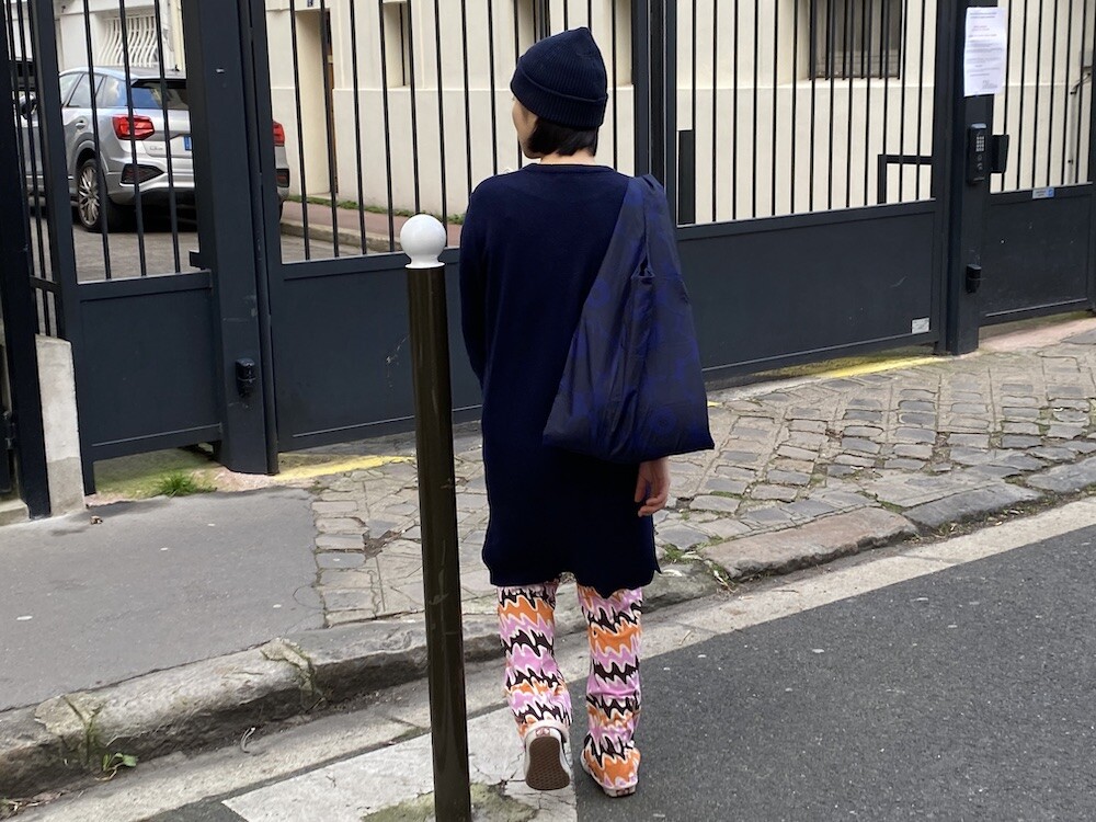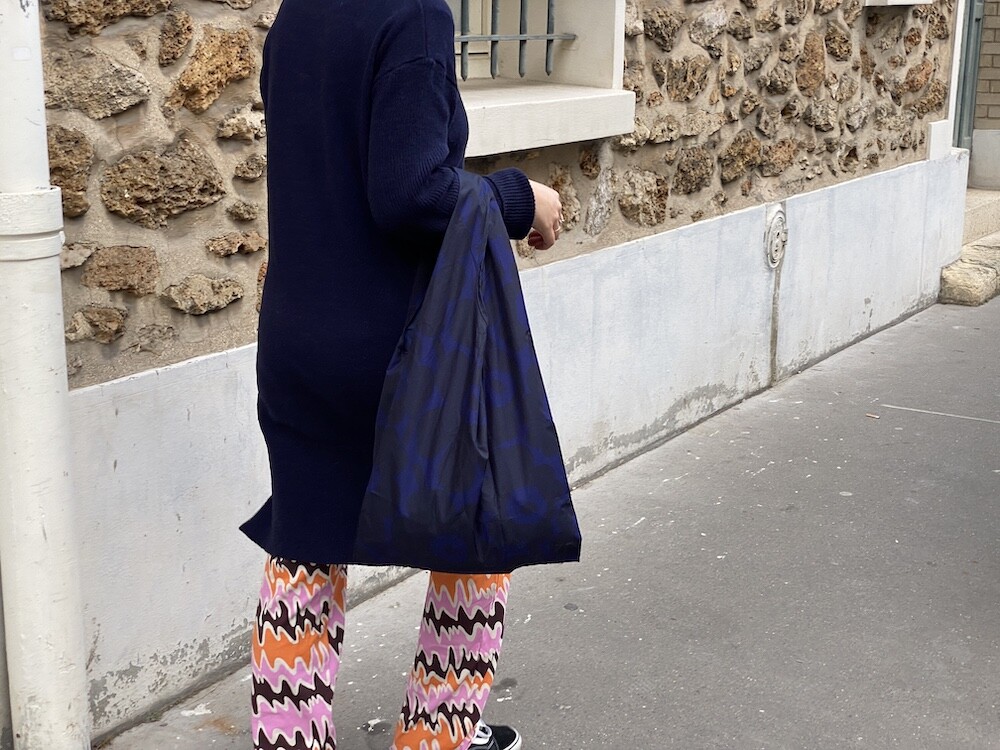 쫀쫀한 오가닉 코튼 소재의 밴딩 팬츠예요. 허리가 밴딩으로 되어 있는데다가 원단 자체가 쫀쫀해서 쫄바지를 입는 것 같은 느낌인데, 허벅지 부분에서 바지 밑단으로 갈수록 들러붙지 않고 퍼지는 라인이라 정말 예뻐요. 경쾌한 프린트도 귀엽죠! 모델 컷과는 다르게 저에겐 길이가 좀 길어요. 잘라 입을까도 생각했는데 밑단 박음질로 인해 생기는 물결 무늬가 예뻐서 그냥 긴 채로 입기로 했어요.