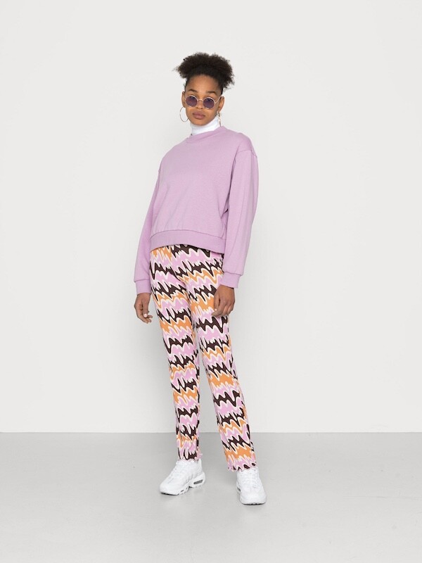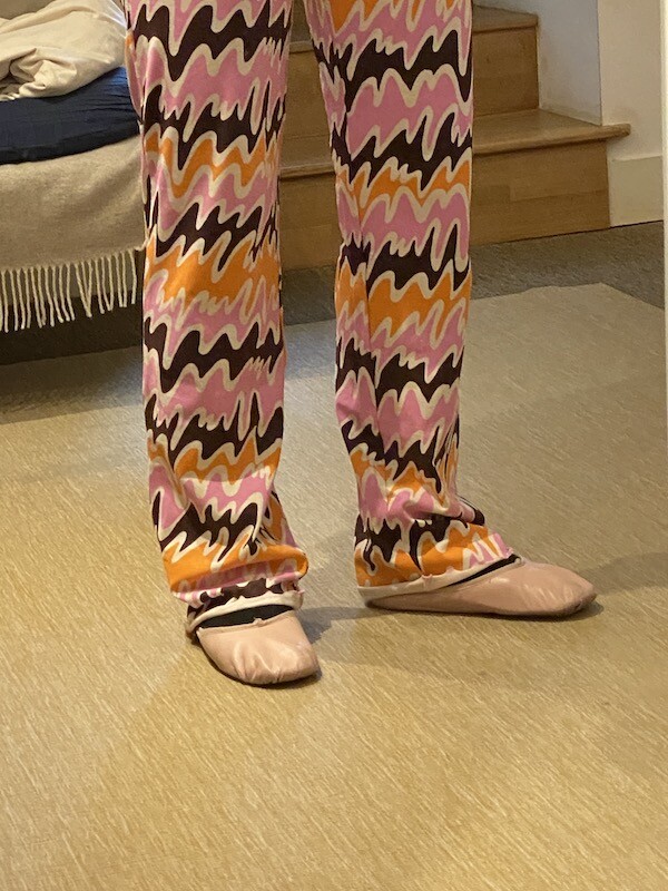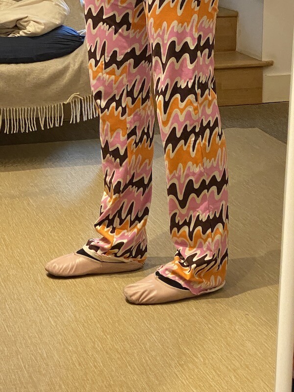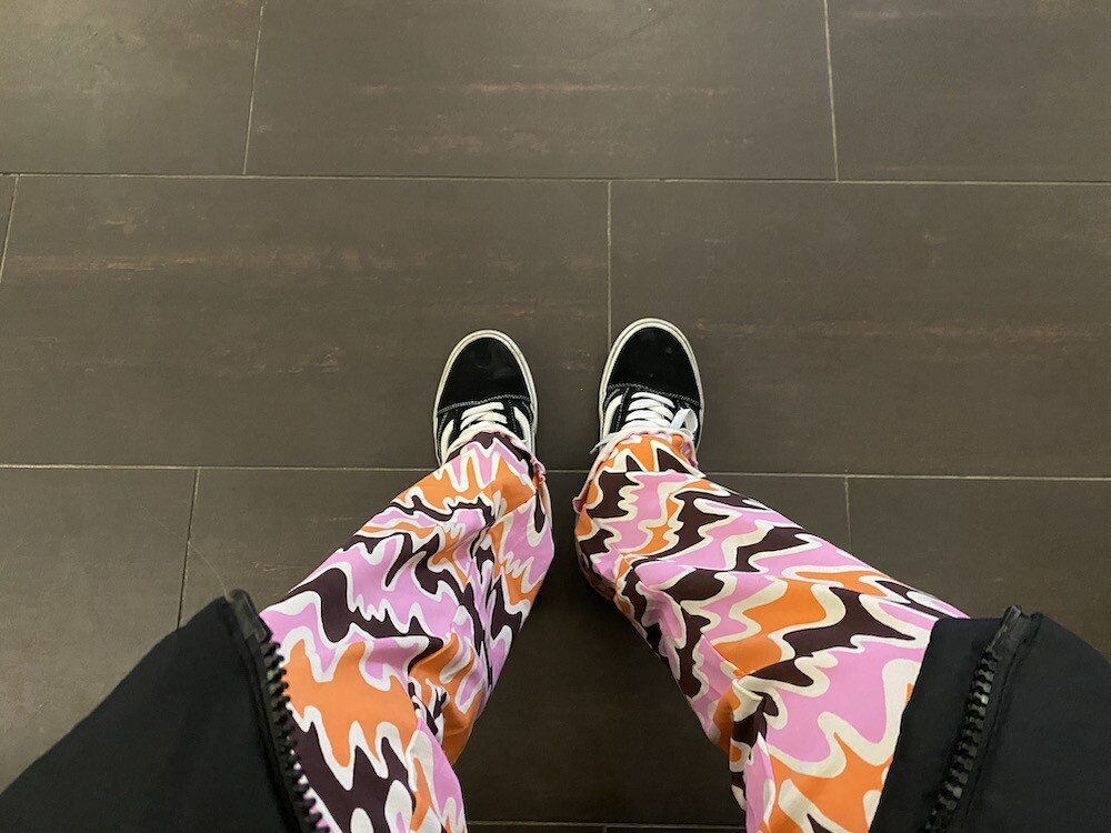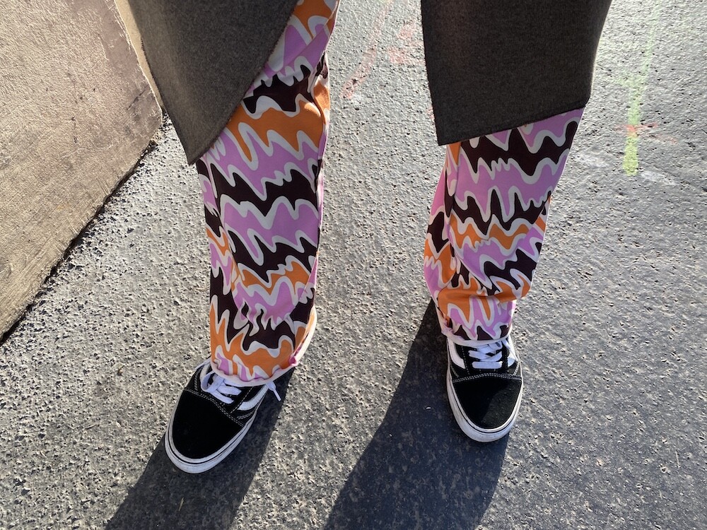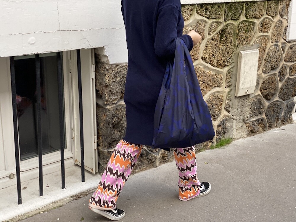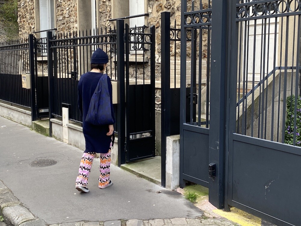 쫀쫀한 오가닉 코튼 소재의 밴딩 팬츠예요. 허리가 밴딩으로 되어 있는데다가 원단 자체가 쫀쫀해서 쫄바지를 입는 것 같은 느낌인데, 허벅지 부분에서 바지 밑단으로 갈수록 들러붙지 않고 퍼지는 라인이라 정말 예뻐요. 경쾌한 프린트도 귀엽죠! 모델 컷과는 다르게 저에겐 길이가 좀 길어요. 잘라 입을까도 생각했는데 밑단 박음질로 인해 생기는 물결 무늬가 예뻐서 그냥 긴 채로 입기로 했어요.
