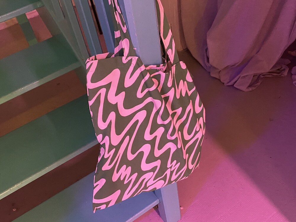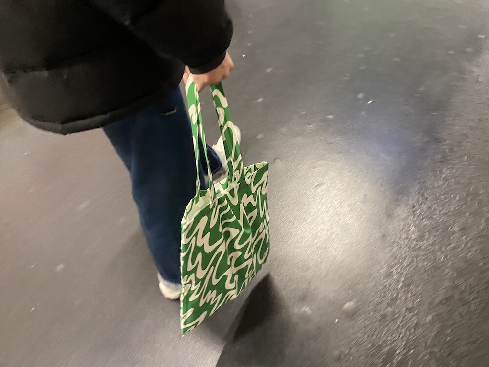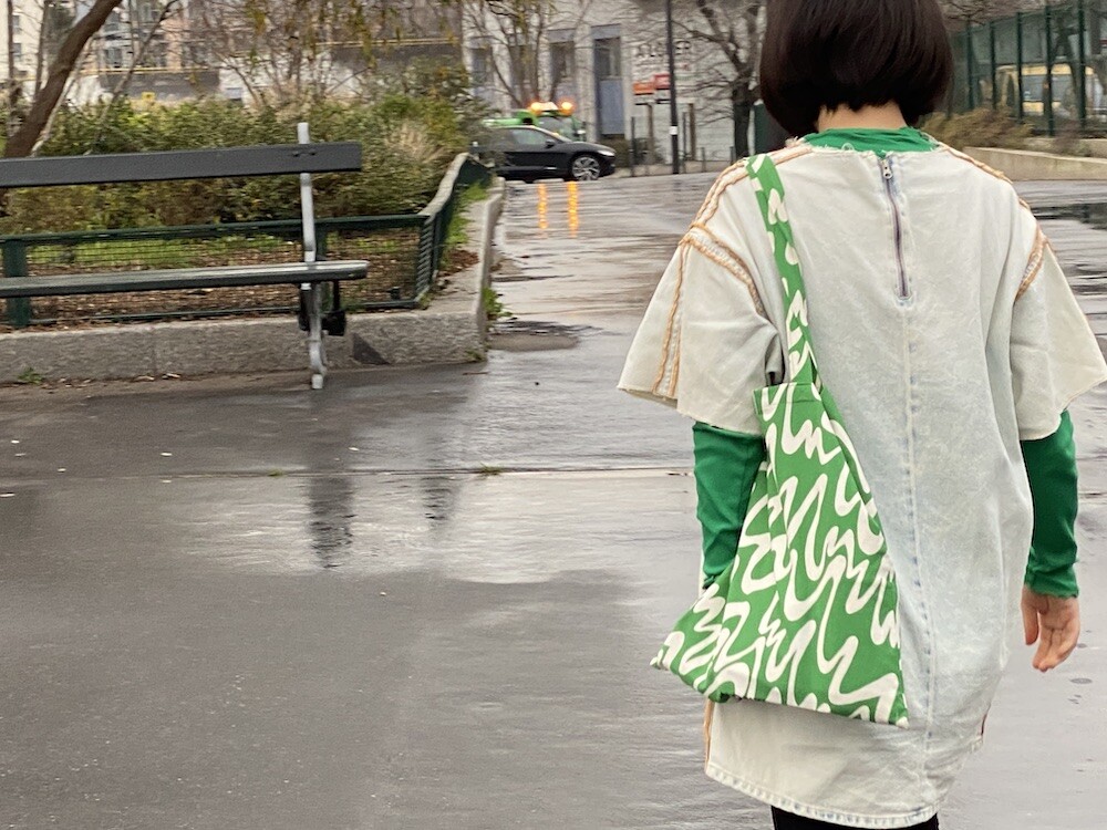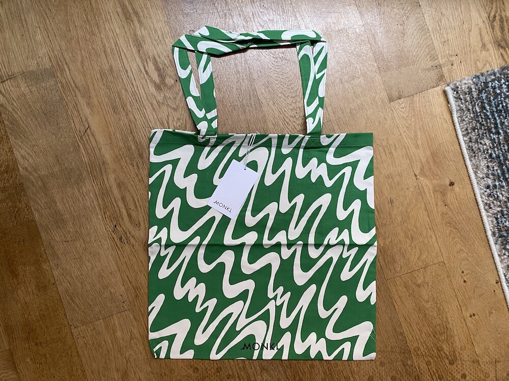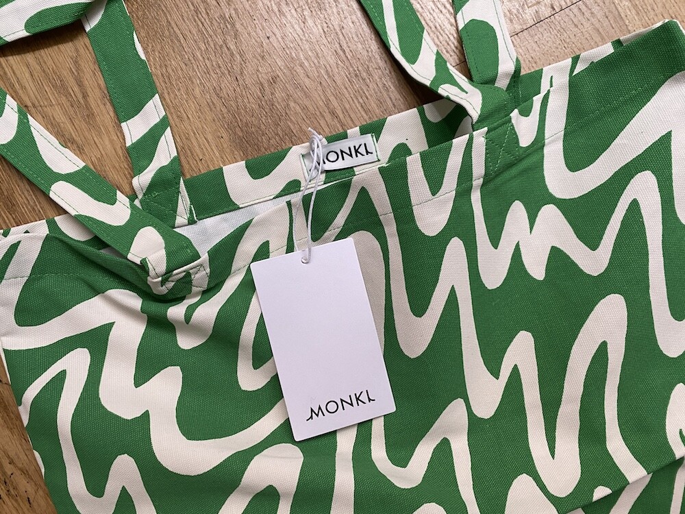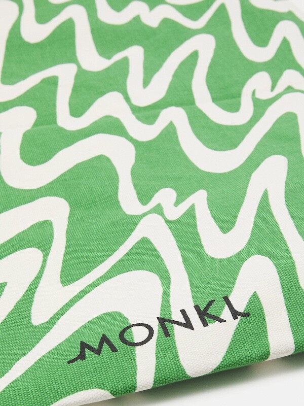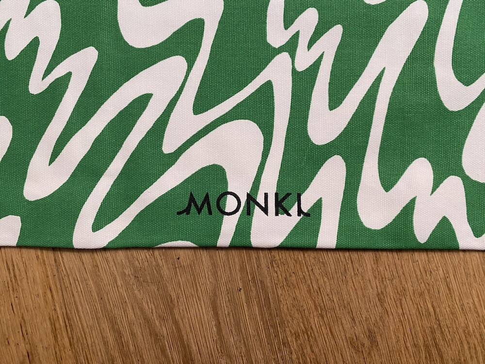 연두빛이 도는 손으로 그린 듯한 하얀 물결 무늬가 그려진 귀여운 에코백이에요. 면에 전체적으로 염색이 아닌, 프린트를 한 원단이라 꼭 약간은 방수가 될 것 같은 표면의 느낌이 특이해요. (물론 방수 처리를 한 원단은 아니기 때문에 실제로 방수 효과가 있지는 않습니다.) 아래쪽에는 MONKI 로고가 깔끔하게 써져 있어요. 꼬마가 그림을 그린 것 같은 귀여운 느낌으로 메시기 좋을 거예요.