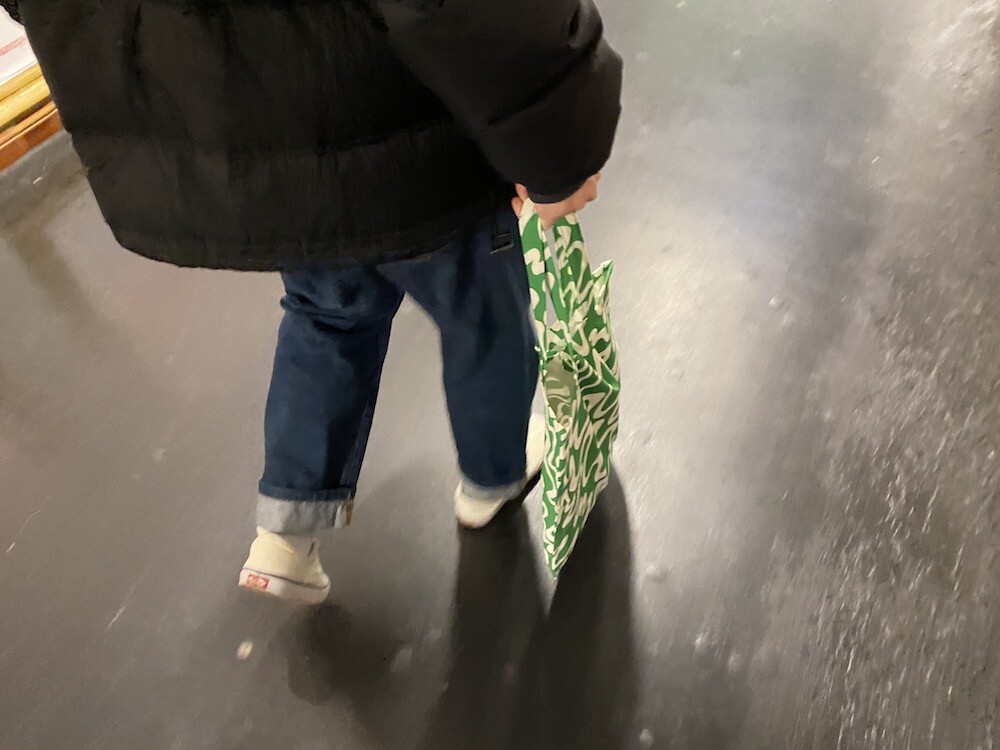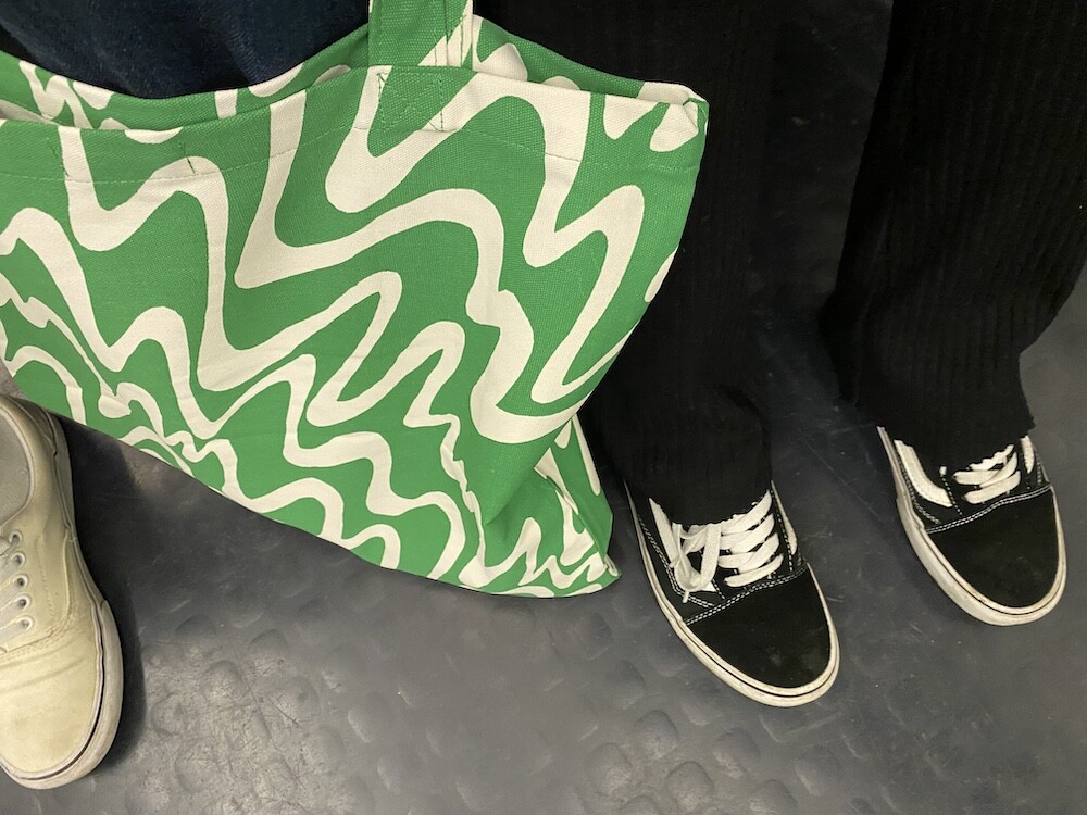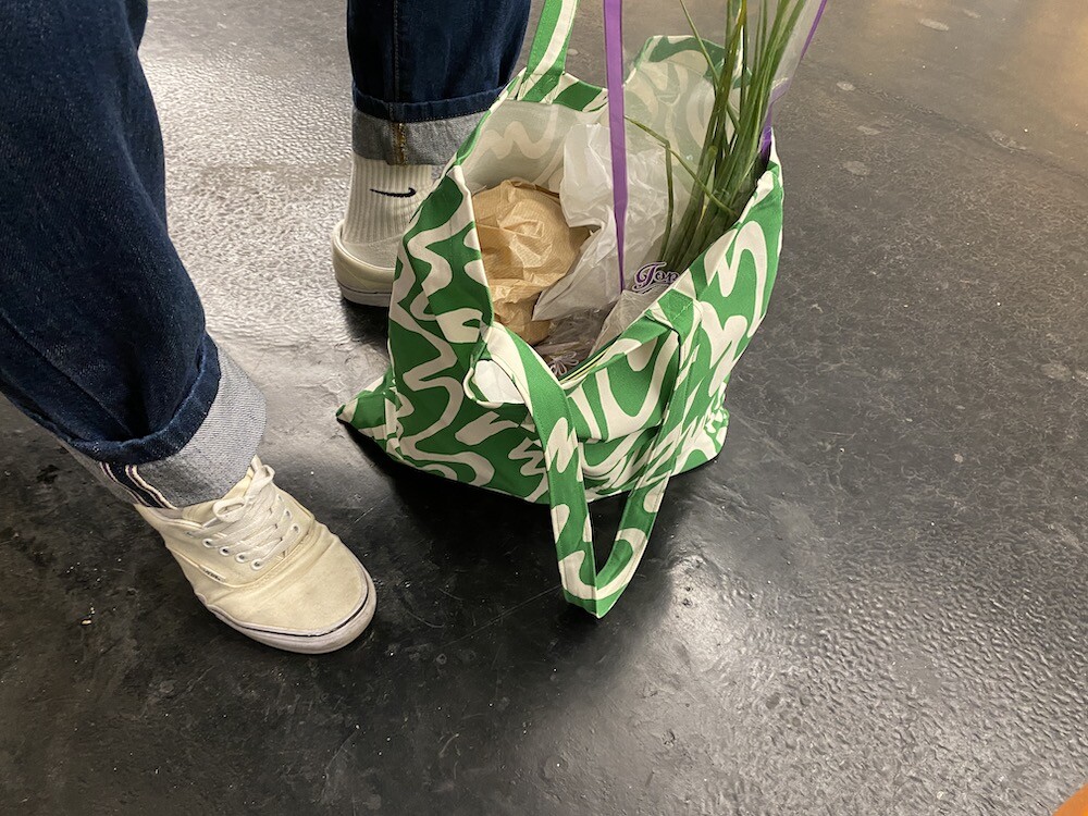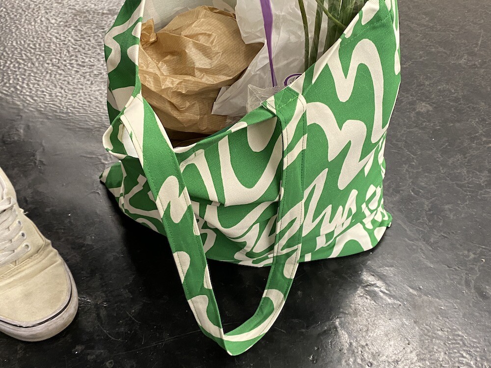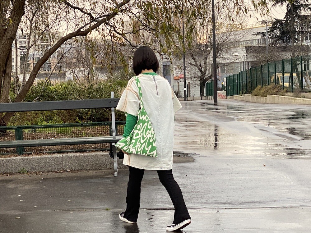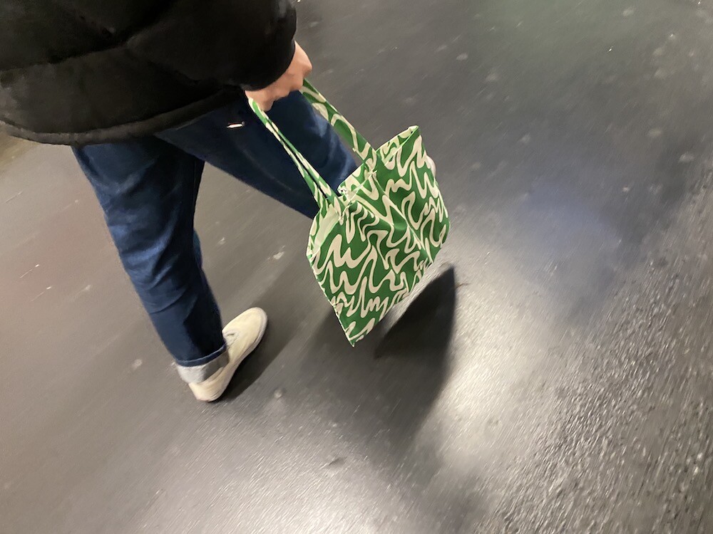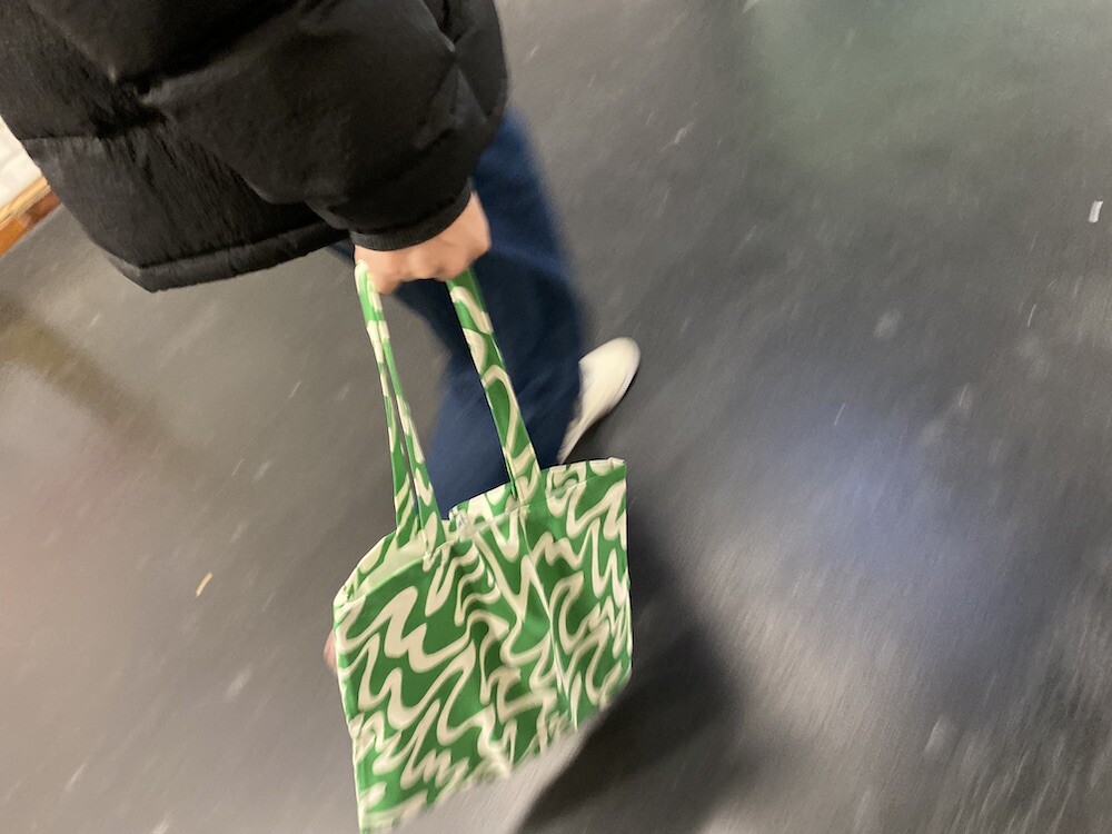연두빛이 도는 손으로 그린 듯한 하얀 물결 무늬가 그려진 귀여운 에코백이에요. 면에 전체적으로 염색이 아닌, 프린트를 한 원단이라 꼭 약간은 방수가 될 것 같은 표면의 느낌이 특이해요. (물론 방수 처리를 한 원단은 아니기 때문에 실제로 방수 효과가 있지는 않습니다.) 아래쪽에는 MONKI 로고가 깔끔하게 써져 있어요. 꼬마가 그림을 그린 것 같은 귀여운 느낌으로 메시기 좋을 거예요.