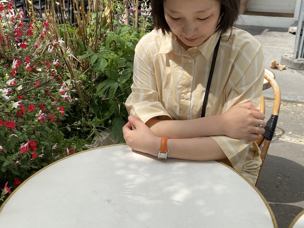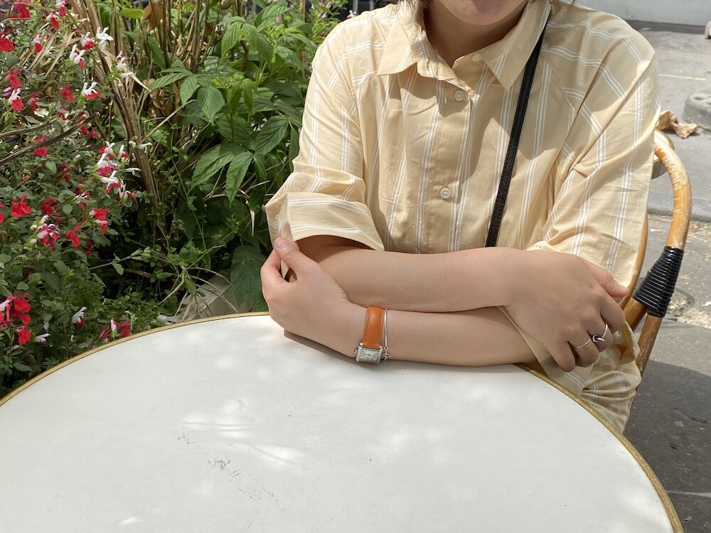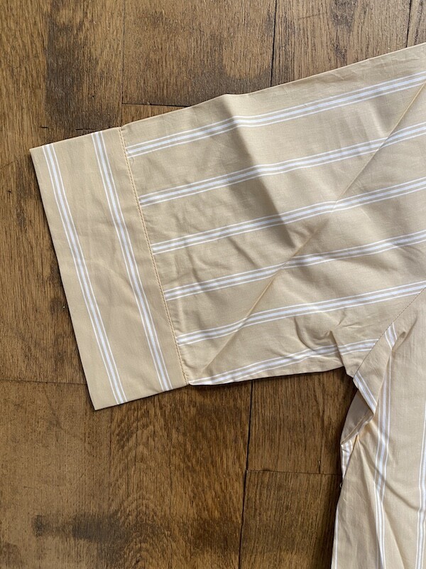 흰색의 스트라이프가 있는 베이지 셔츠입니다. 두껍지 않은 소재감으로 봄, 여름엔 시원하게 입을 수 있고 가을 겨울엔 따뜻한 이너와 함께 입기도 좋을 거예요. 래글런 소매 디자인이라 어깨가 좁아 보이는데다가 몸에 들러붙지 않는 셔츠라 개인적으로는 여기 저기 활용하기 좋더라고요. 또 주머니가 있어서 핸드폰이나 얇은 물건들을 넣을 수 있는 것도 좋았어요.