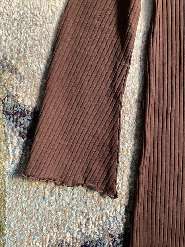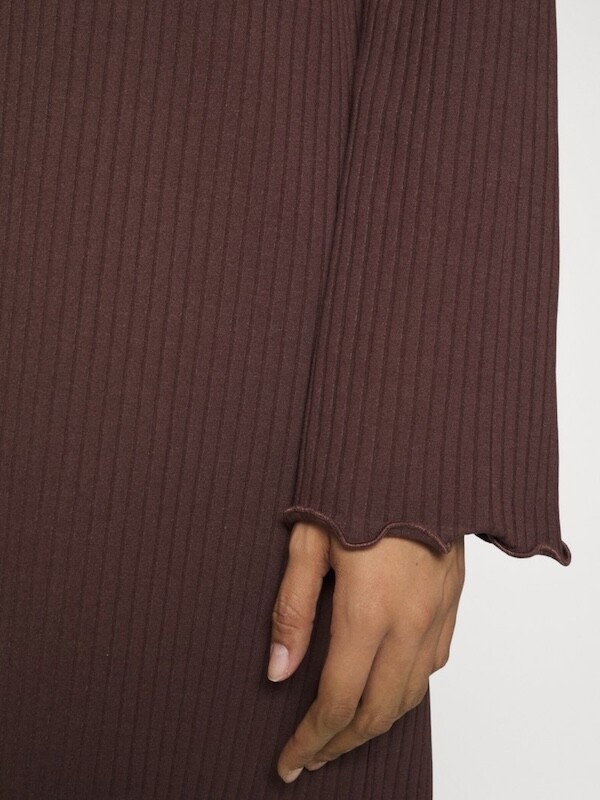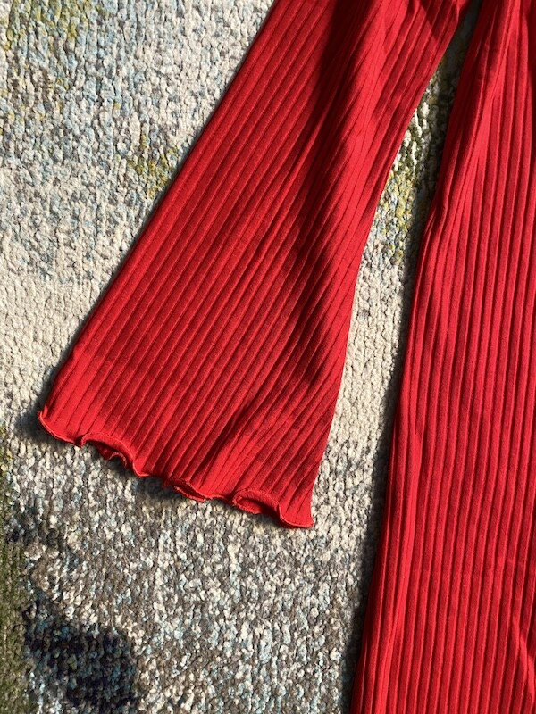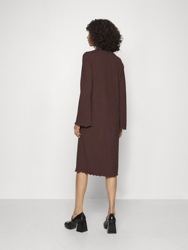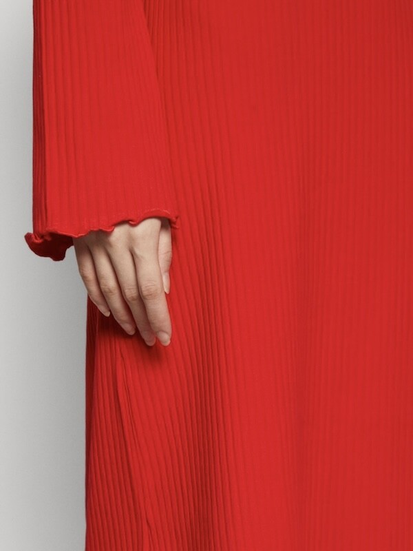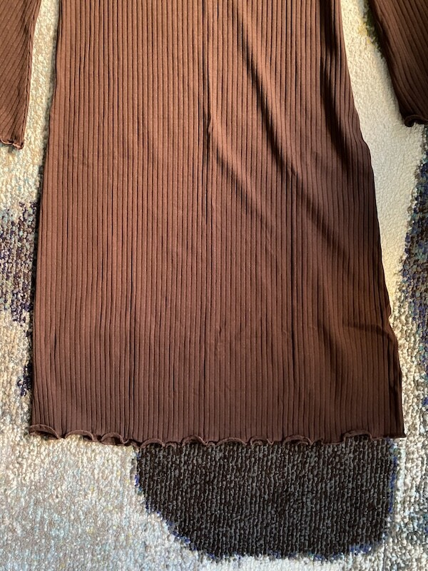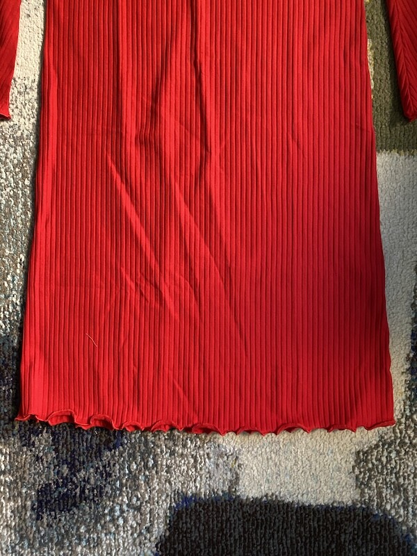 니트쩌럼 짜인 소재의 원피스입니다. 무릎까지 내려오는 길이로 부담스럽지 않고, 소재가 짱짱해서 늘어짐 걱정 없이 입을 수 있어요. 소매가 끝으로 갈수록 넓어지는 디자인이라 독특하고 소맷단과 밑단이 물결 무늬처럼 처리되어 있는 것도 예뻐요.