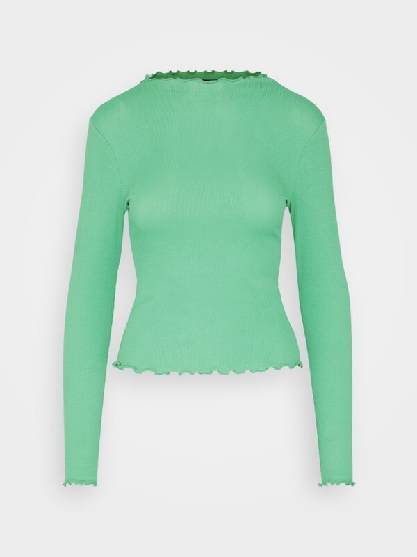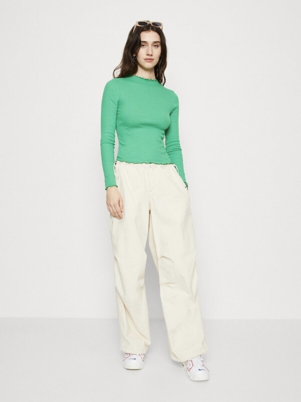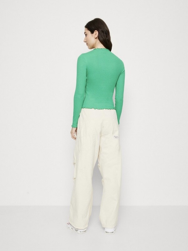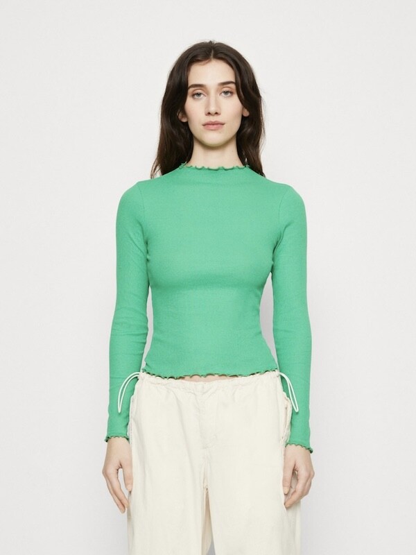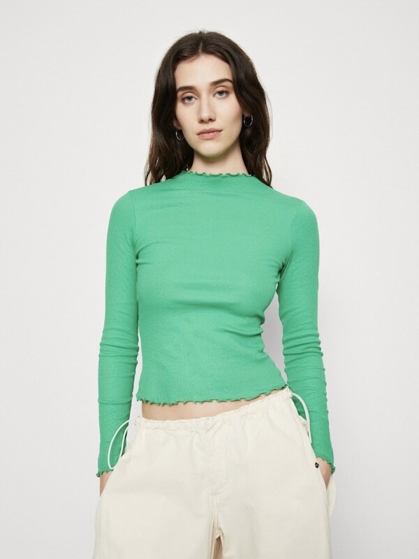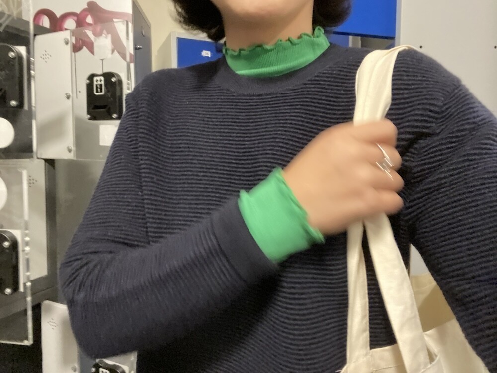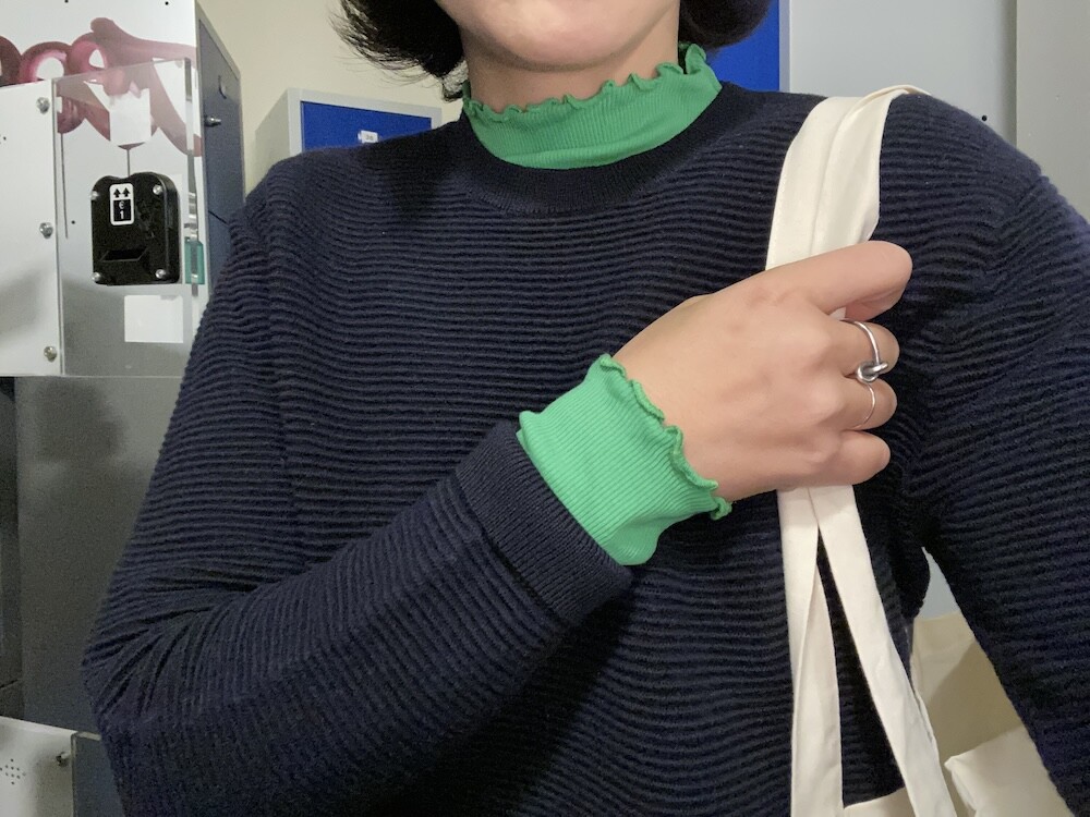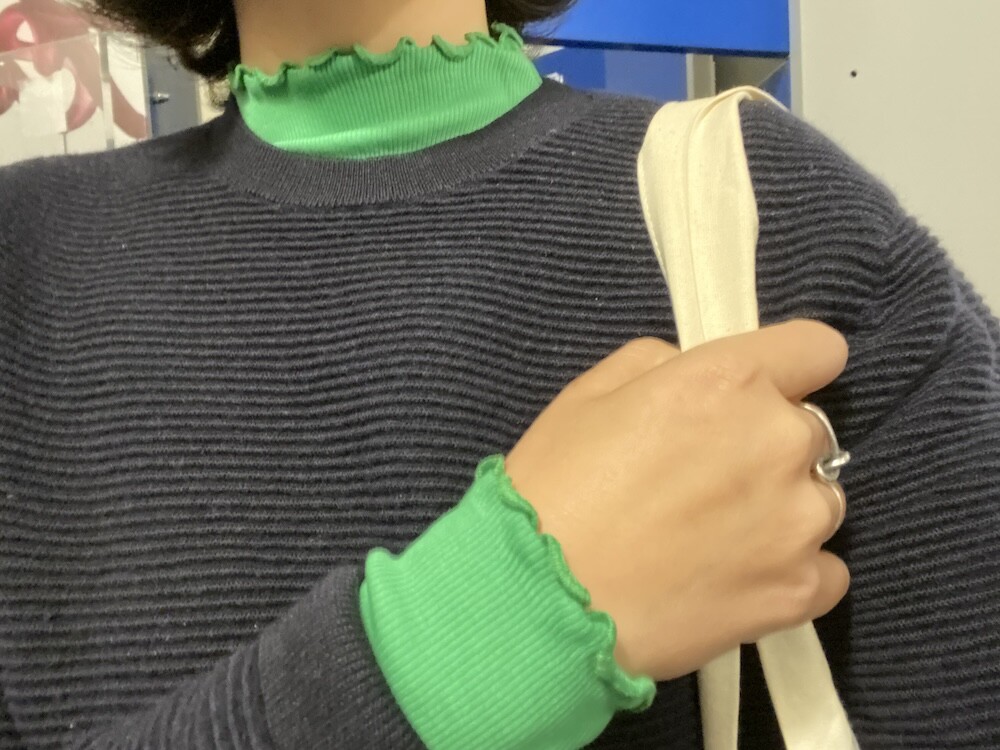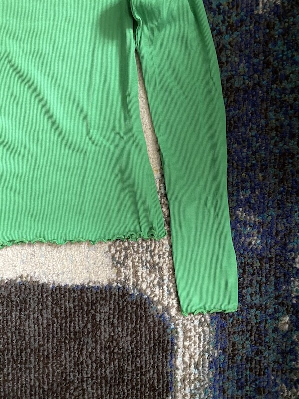 쫀쫀한 골지 티셔츠입니다. 초록색에 노랑을 살짝 섞은 연두색이 기분을 좋아지게 만들어요, 목 끝과 소매, 밑단이 물결 무늬처럼 처리되어 디자인이 지루하지 않고 예뻐요. 이너 티셔츠로 여기 저기 입기 정말 좋으실 거예요.