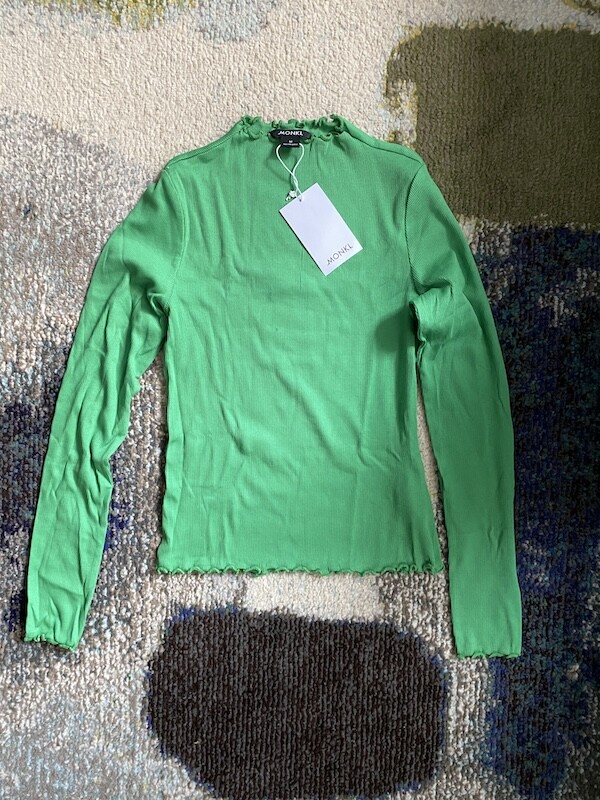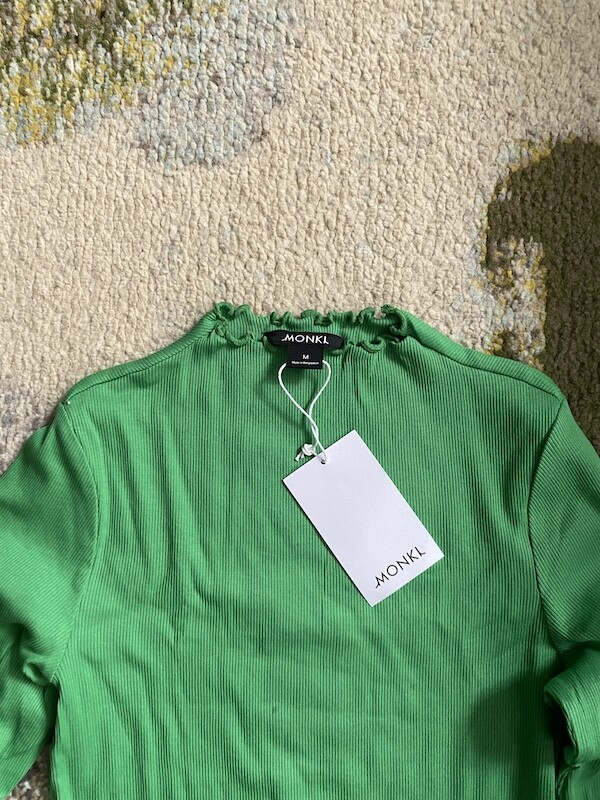 몽키(MONKI) 연두 골지 티셔츠 두 가지 사이즈입니다.