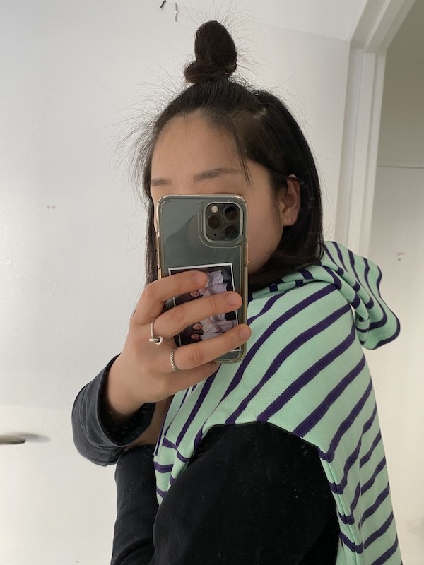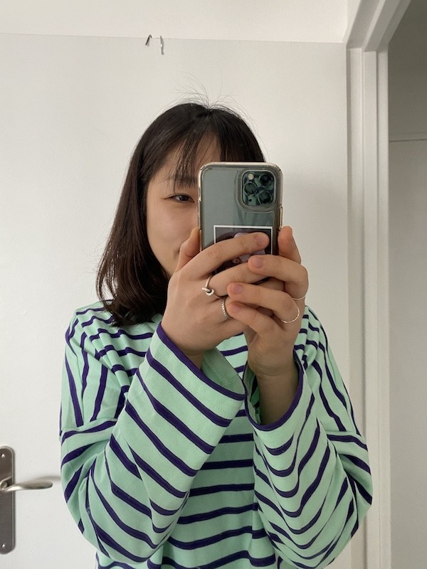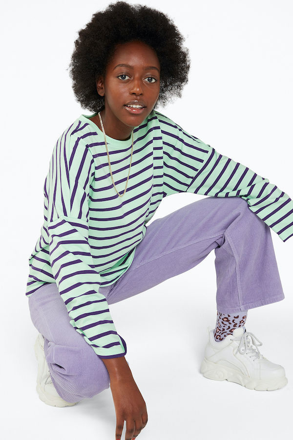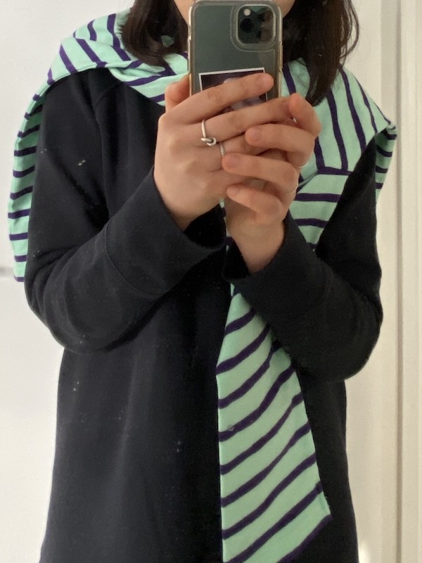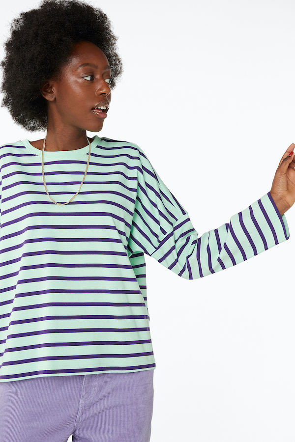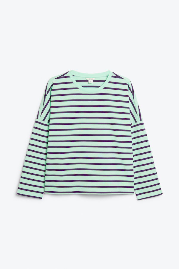 이 티셔츠는 얇은 면티가 아니라 도톰하게 짜여진 티셔츠예요. 생 제임스의 줄무늬 티셔츠 원단 아시나요? 그것과 비슷한 느낌이에요. 그래서 제품 분류도 티셔츠가 아니라 "스웨터"로 되어 있어요. 민트와 보라색의 조화가 상큼해서 단독으로 입어도, 아우터 안에 입어도 예쁘고, 쌀쌀함이 느껴질 때 어깨 위에 살짝 걸쳐주어도 너무 예뻐요.
