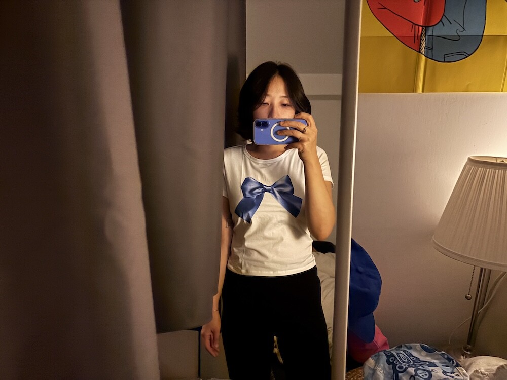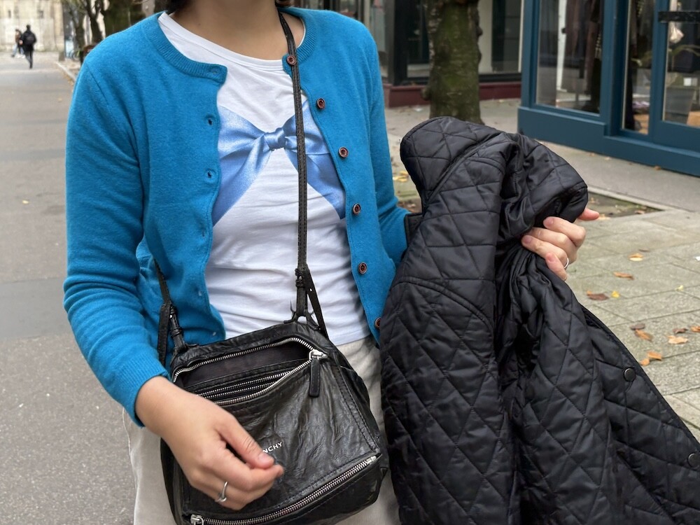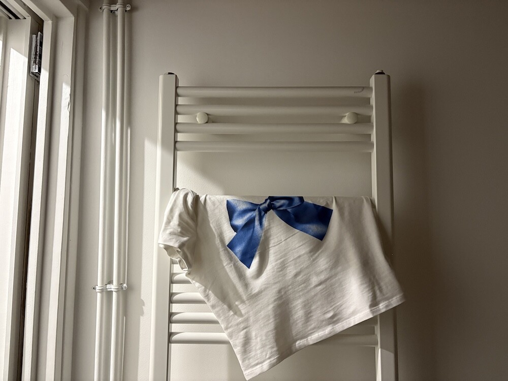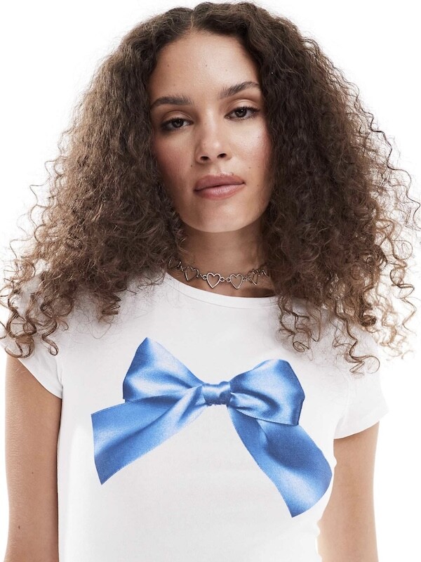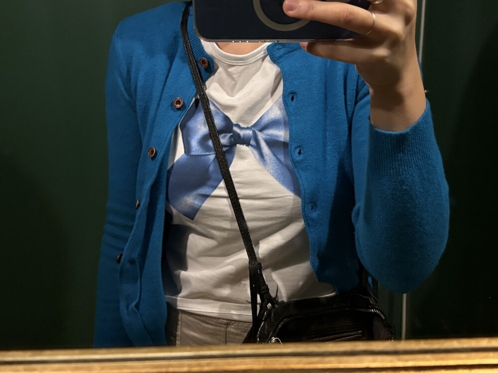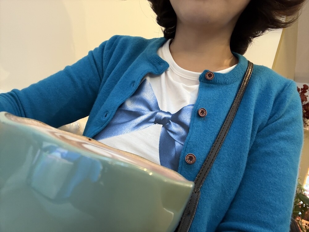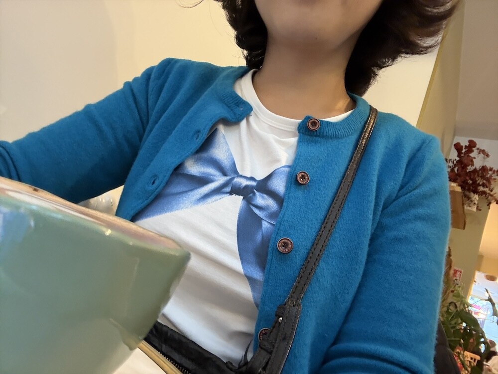 흰색 면 티셔츠에 파란 리본이 프린트된 귀여운 티셔츠예요. 리본이 그림이 아니라 사진 같은 느낌이라 유치하지 않고 예쁘더라고요. 그냥 입어도 예쁘지만 가디건 안에 살짝 보이게 입어도 예뻐서 사계절 내내 잘 활용하시게 될 거예요.