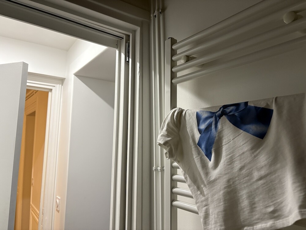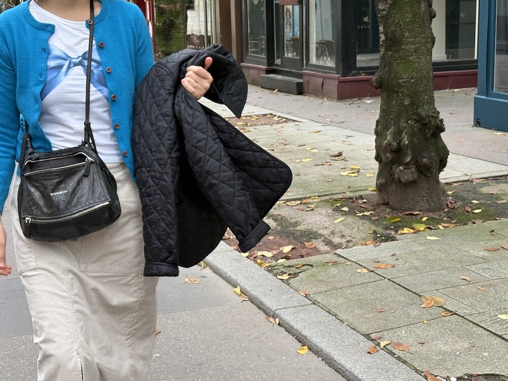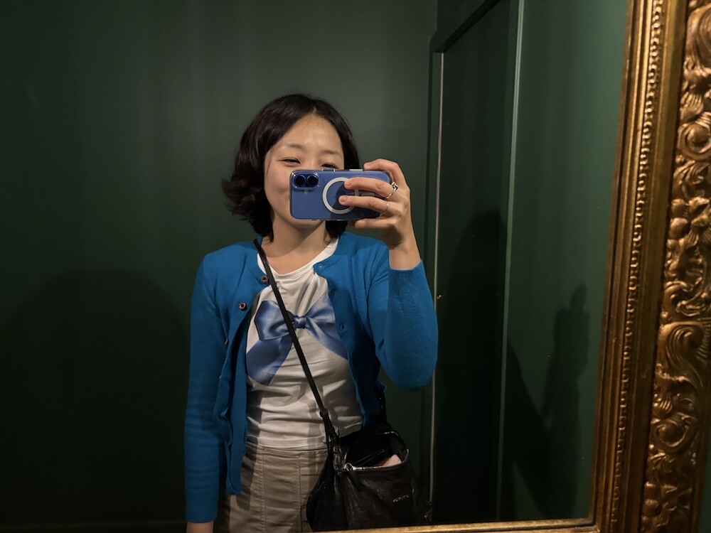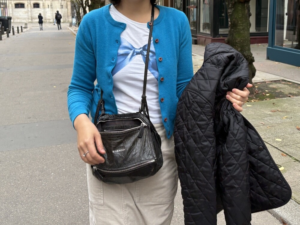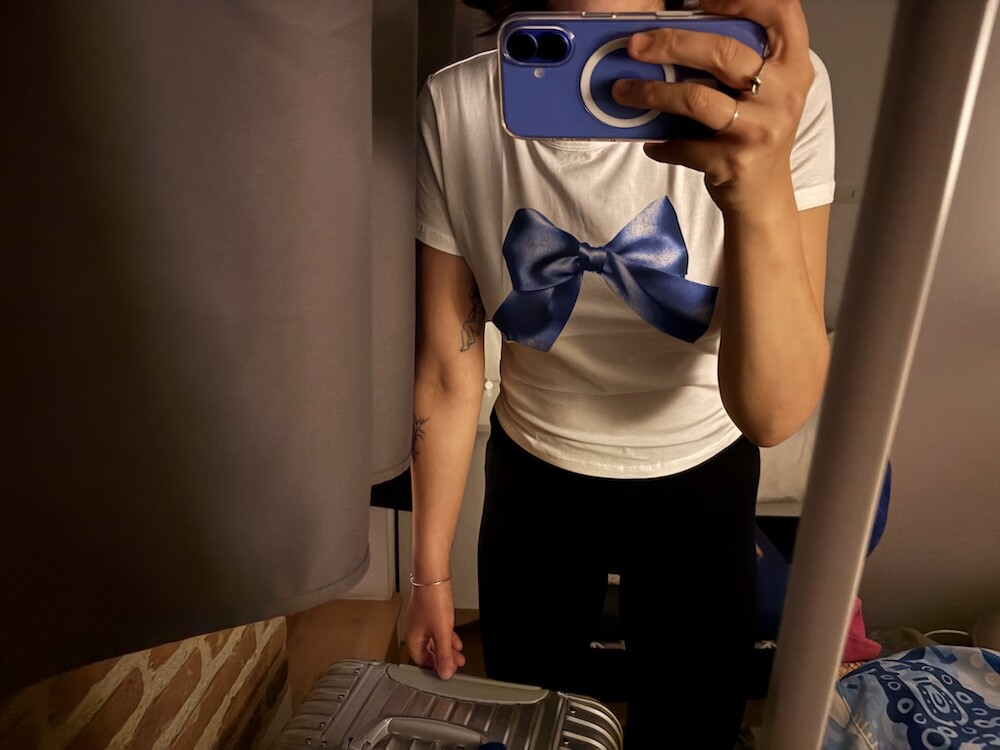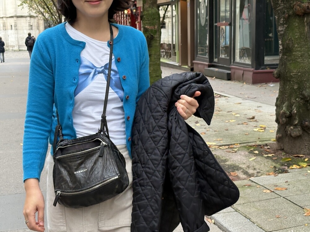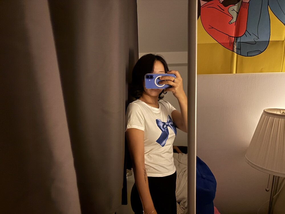 흰색 면 티셔츠에 파란 리본이 프린트된 귀여운 티셔츠예요. 리본이 그림이 아니라 사진 같은 느낌이라 유치하지 않고 예쁘더라고요. 그냥 입어도 예쁘지만 가디건 안에 살짝 보이게 입어도 예뻐서 사계절 내내 잘 활용하시게 될 거예요.