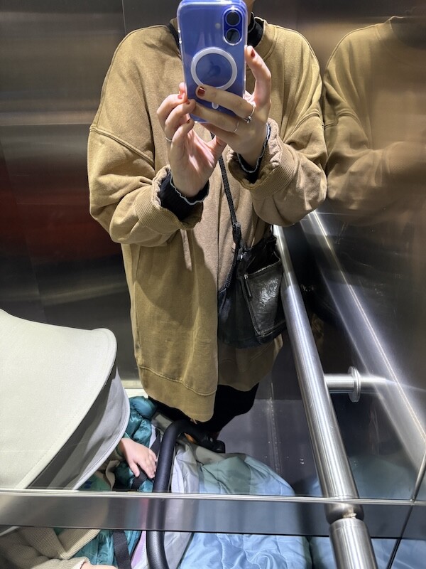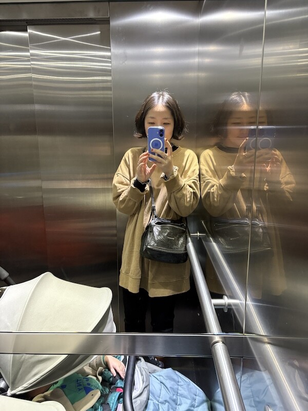 키는 161 cm 정도, 몸무게는 55 이상 60 미만인데(몸무게가 왔다갔다해서 정확한 무게가 몇인지 모르겠어요.) 출산 후 몸이 퍼져서 덩치가 커져 M사이즈가 꼭 맞아요.