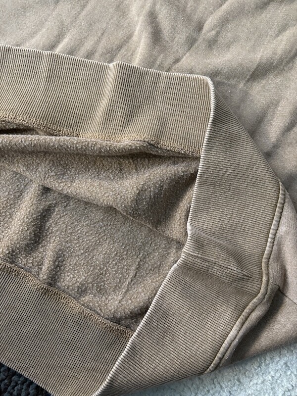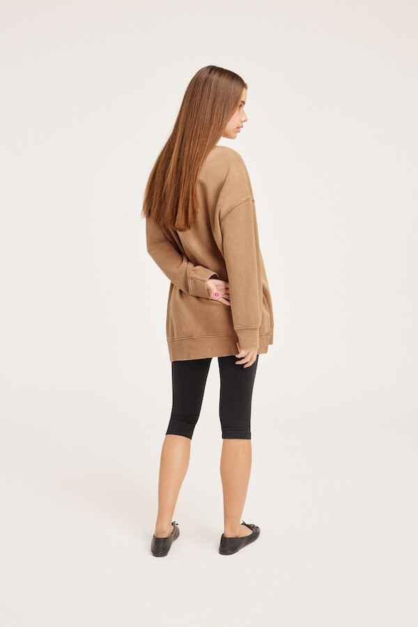 넉넉한 사이즈로 원피스처럼 입는 맨투맨 티셔츠입니다. 보통의 맨투맨에 비해 덜 도톰한 원단이지만 안쪽에 기모가 있어서 여름을 제외한 나머지 계절에 입으시기 좋을 거예요. 특히 원단이 너무 보들보들해서 그동안 스웻셔츠에서는 느껴보지 못했던 감촉을 느끼실 수 있으실 거예요. 아마 자꾸만 볼을 가져다 대고 싶을 걸요? 원단의 빈티지한 워싱에서 나오는 색감도 예쁘고, 어깨선이 팔까지 내려와 있어서 어깨도 여리여리해 보이고 몸에 달라붙지 않아서 정말 편하더라고요.